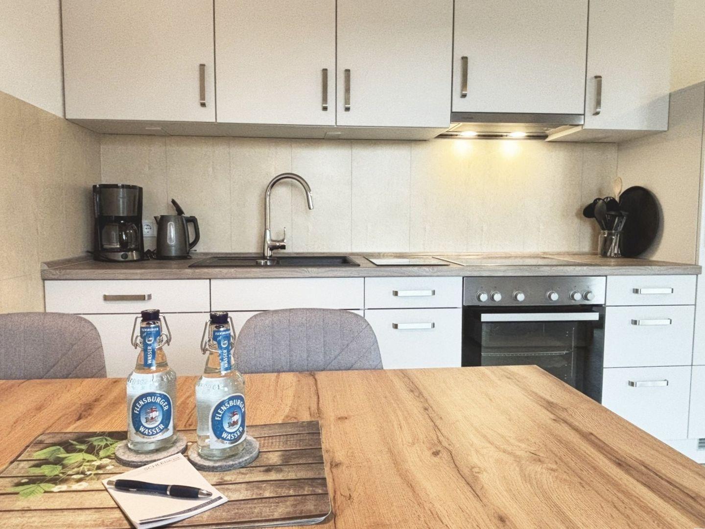 Ein separater Zugang über eine stabile Außentreppe mit Geländer führt Sie direkt zur Wohnung. Dort empfängt Sie ein freundlicher Eingangsbereich mit Garderobe, von dem aus sich alle Räume erschließen. Der offene Wohn- und Essbereich ist lichtdurchflutet und stilvoll eingerichtet: Eine moderne Sitzgruppe mit Zweisitzer und zwei Sesseln lädt zum Entspannen ein, während der angrenzende Essbereich Raum für gemeinsame Mahlzeiten bietet. Die voll ausgestattete Küche – unter anderem mit Cerankochfeld, Backofen, Kühlschrank mit Gefrierfach, Spülmaschine, Kaffeemaschine und Toaster – macht Selbstverpflegung im Urlaub ganz unkompliziert.