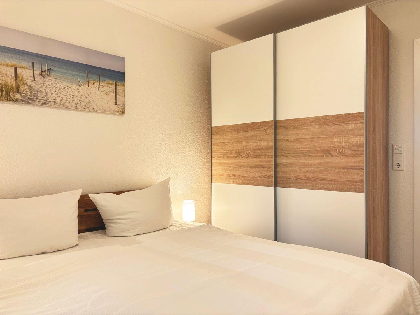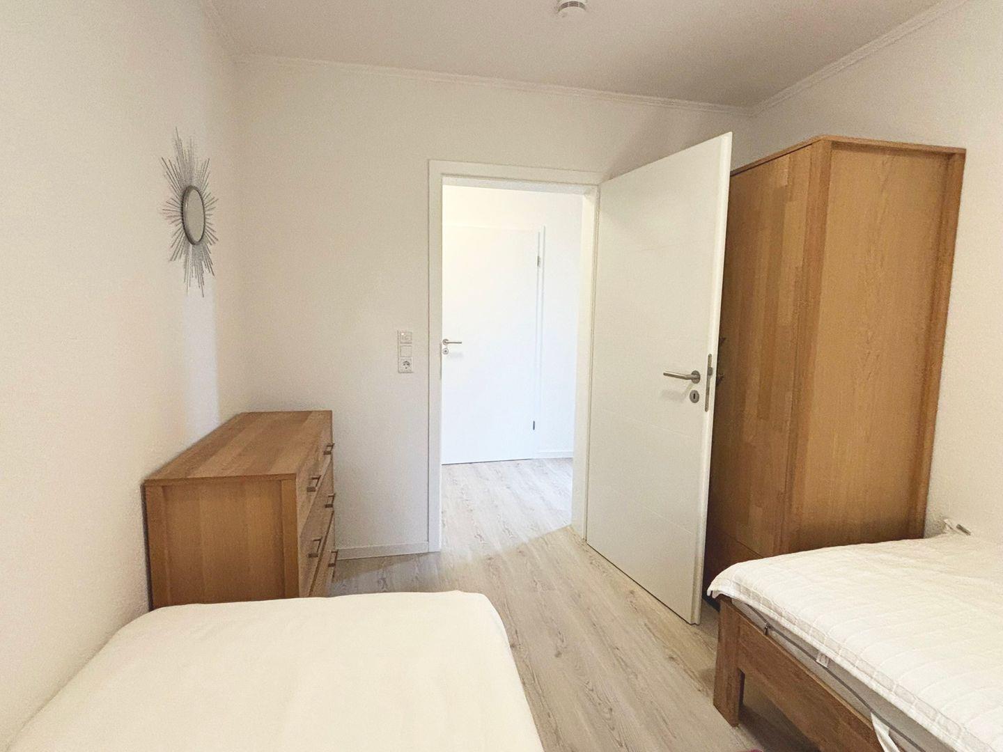Zwei gemütliche Schlafzimmer sorgen für angenehme Nächte. Eines ist mit einem Doppelbett und großem Kleiderschrank ausgestattet, das zweite bietet zwei Einzelbetten, zusätzlichen Stauraum in Form eines Schranks sowie eine Kommode – ideal für Familien oder Freunde. Das moderne Badezimmer verfügt über eine bodengleiche Dusche, Tageslicht und eine schlichte, funktionale Ausstattung.