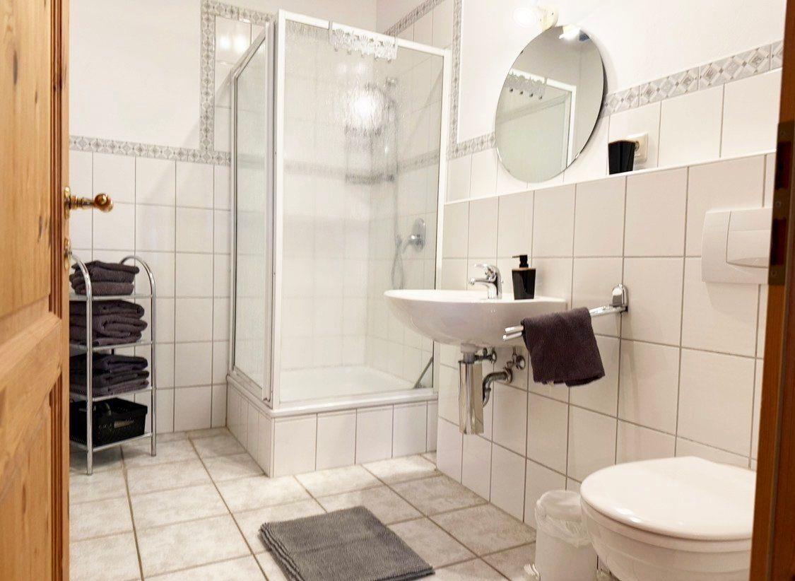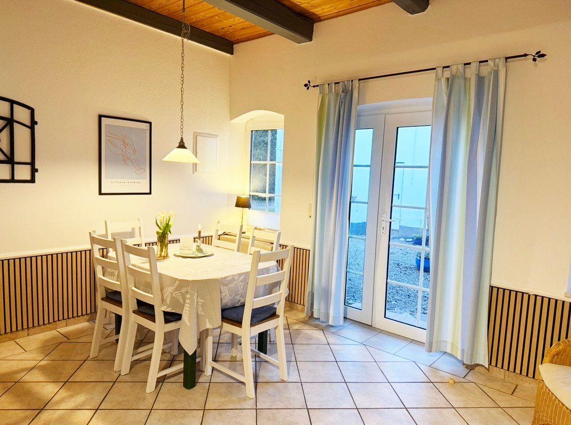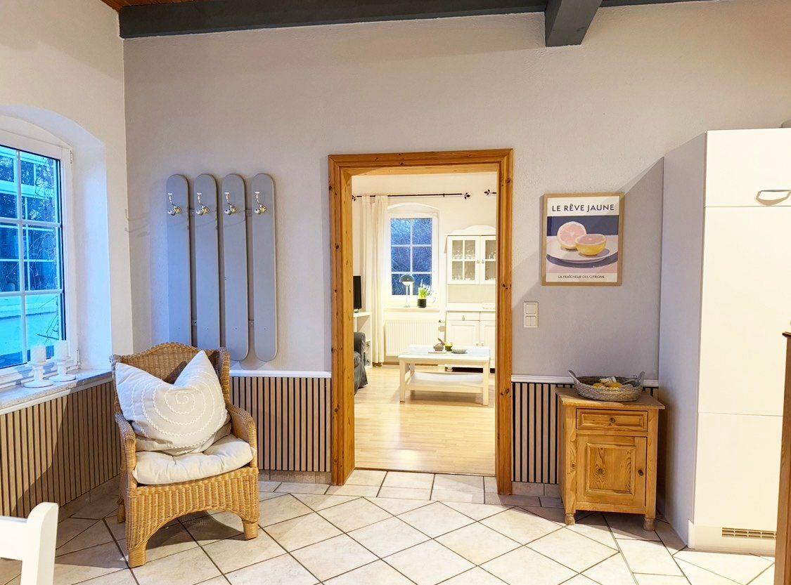 Diese großzügige, ca. 110 Quadratmeter große Ferienwohnung erstreckt sich über zwei Etagen (Erdgeschoss und 1. Obergeschoss) und bietet mit drei Schlafzimmern komfortabel Platz für bis zu 6 Personen. Das Herzstück der Unterkunft bildet das separate Wohnzimmer, das mit einer gemütlichen Sitzgruppe aus Sofa und Sessel zum Entspannen einlädt und einen idyllischen Ausblick auf den 5.000 Quadratmeter großen Bauerngarten bietet. Die offene, voll ausgestattete Küche mit angrenzendem Essbereich ermöglicht gesellige Mahlzeiten; zur weiteren Unterhaltung stehen WLAN, SAT-TV, Radio sowie eine Auswahl an Büchern und Spielen bereit.