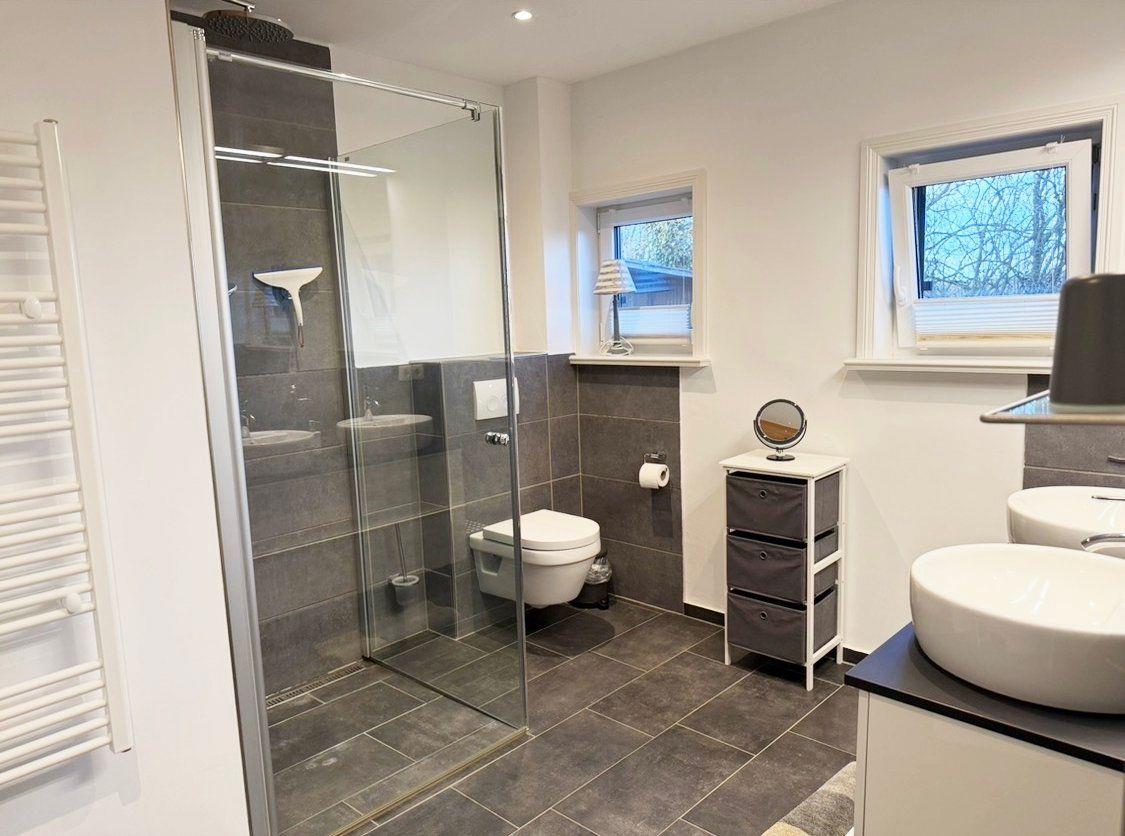 Für erholsame Nächte sorgen zwei Schlafzimmer im Obergeschoss: Das Hauptschlafzimmer ist mit einem komfortablen Doppelbett (180x200 cm, getrennte Matratzen) und eigenem SAT-TV ausgestattet, während das zweite Schlafzimmer über zwei Einzelbetten verfügt. In beiden Räumen sorgen Verdunklungsmöglichkeiten und Fliegengitter für einen angenehmen Schlaf. Das Badezimmer bietet mit einer ebenerdigen Dusche und einer wohltuenden Fußbodenheizung ein echtes Plus an Komfort; ein zusätzliches Gäste-WC ergänzt die Ausstattung ideal.