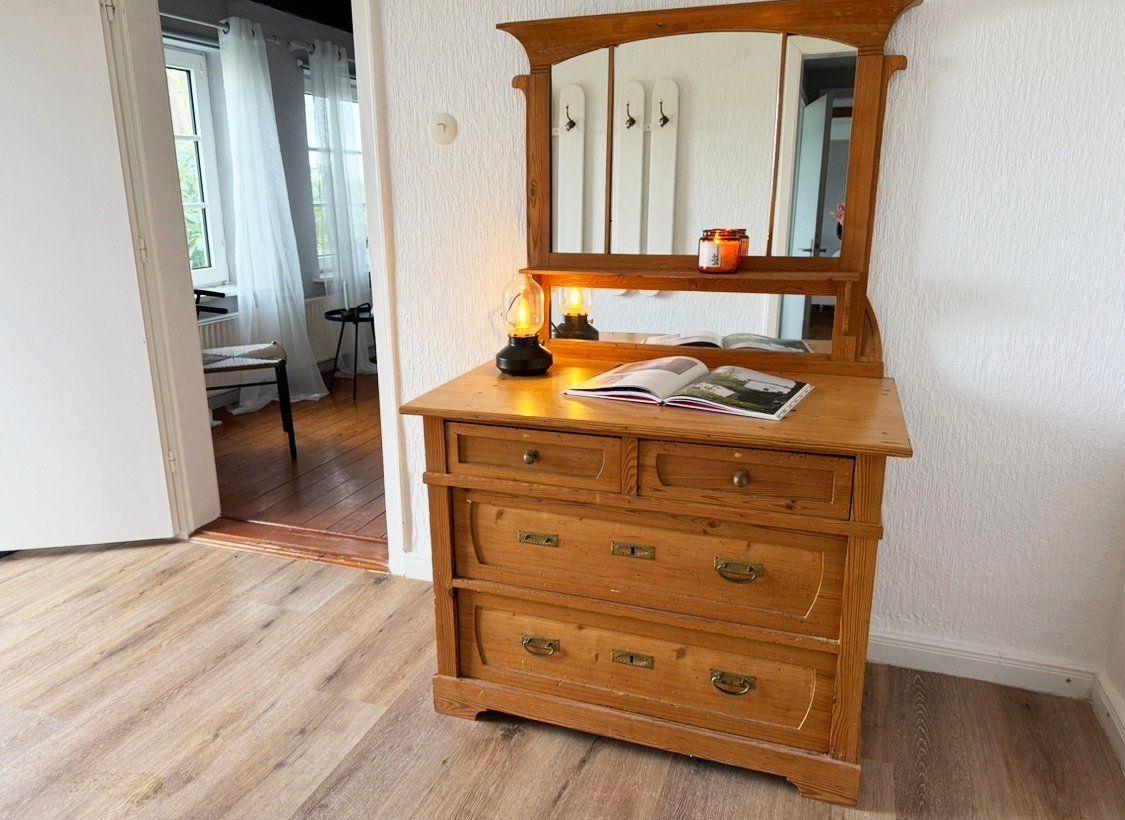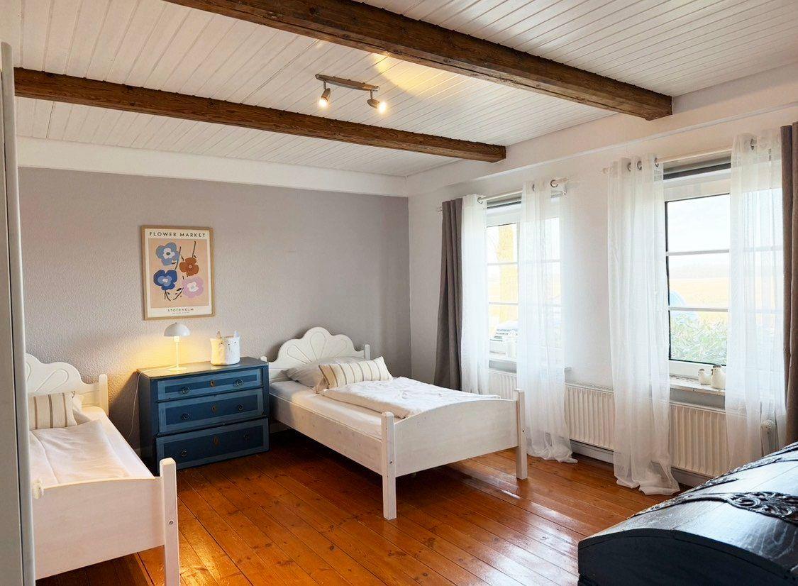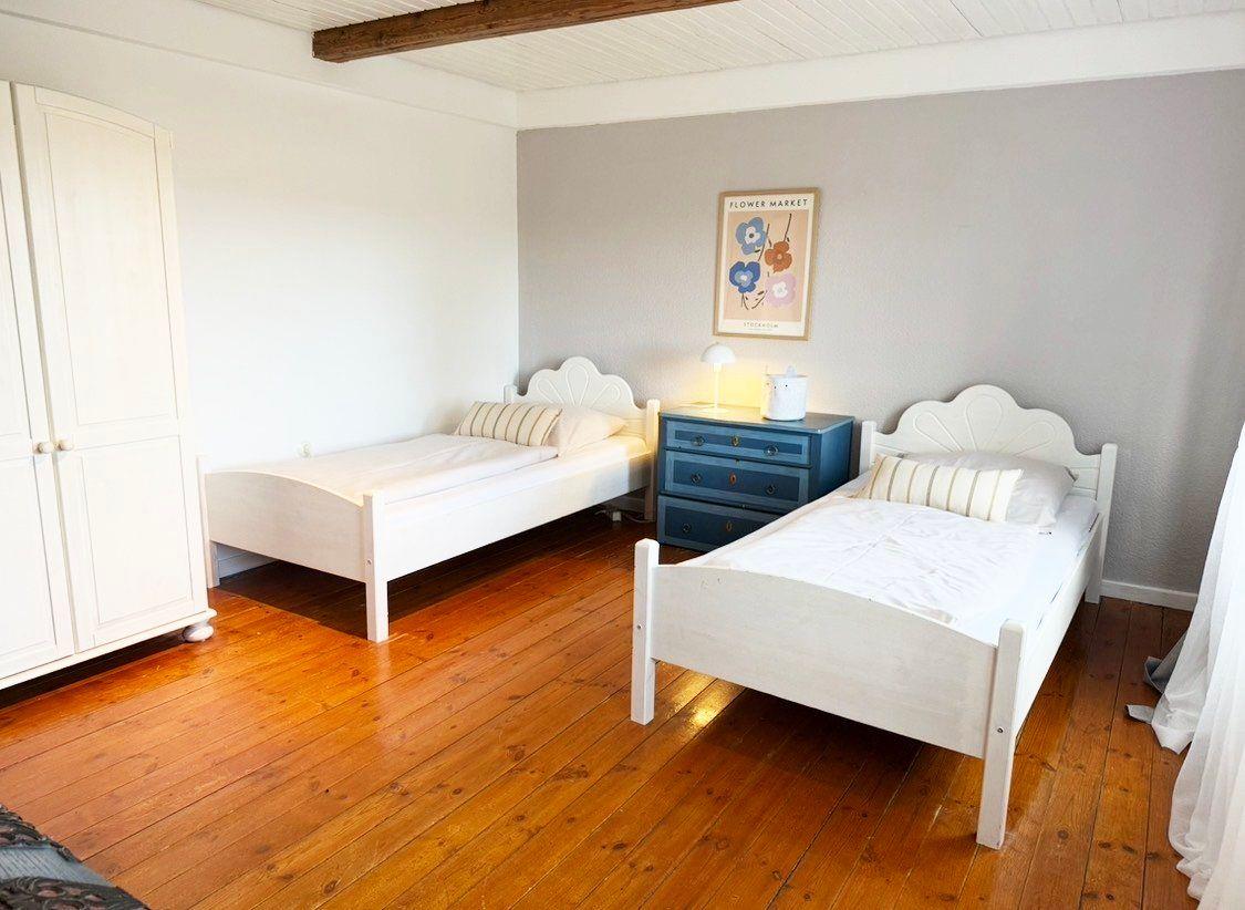 Das alleinstehende Ferienhaus „Landsitz“ bietet auf einer Wohnfläche von ca. 100 m² eine einladende Unterkunft im rustikalen Landhausstil. Direkt an eine Pferdekoppel angrenzend, garantiert das Objekt Ruhe und Erholung pur. Das Haus erstreckt sich über drei Zimmer und bietet Schlafgelegenheiten für bis zu vier Personen. Die zwei Schlafzimmer sind jeweils mit einem Kleiderschrank und Verdunklungsmöglichkeiten ausgestattet; das erste Schlafzimmer verfügt über ein Doppelbett (180x200 cm) mit getrennten Matratzen, das zweite über zwei Einzelbetten (je 100x200 cm). Das Badezimmer ist zweckmäßig mit einer Dusche mit flachem Einstieg, WC, Haartrockner und einem Fenster ausgestattet.