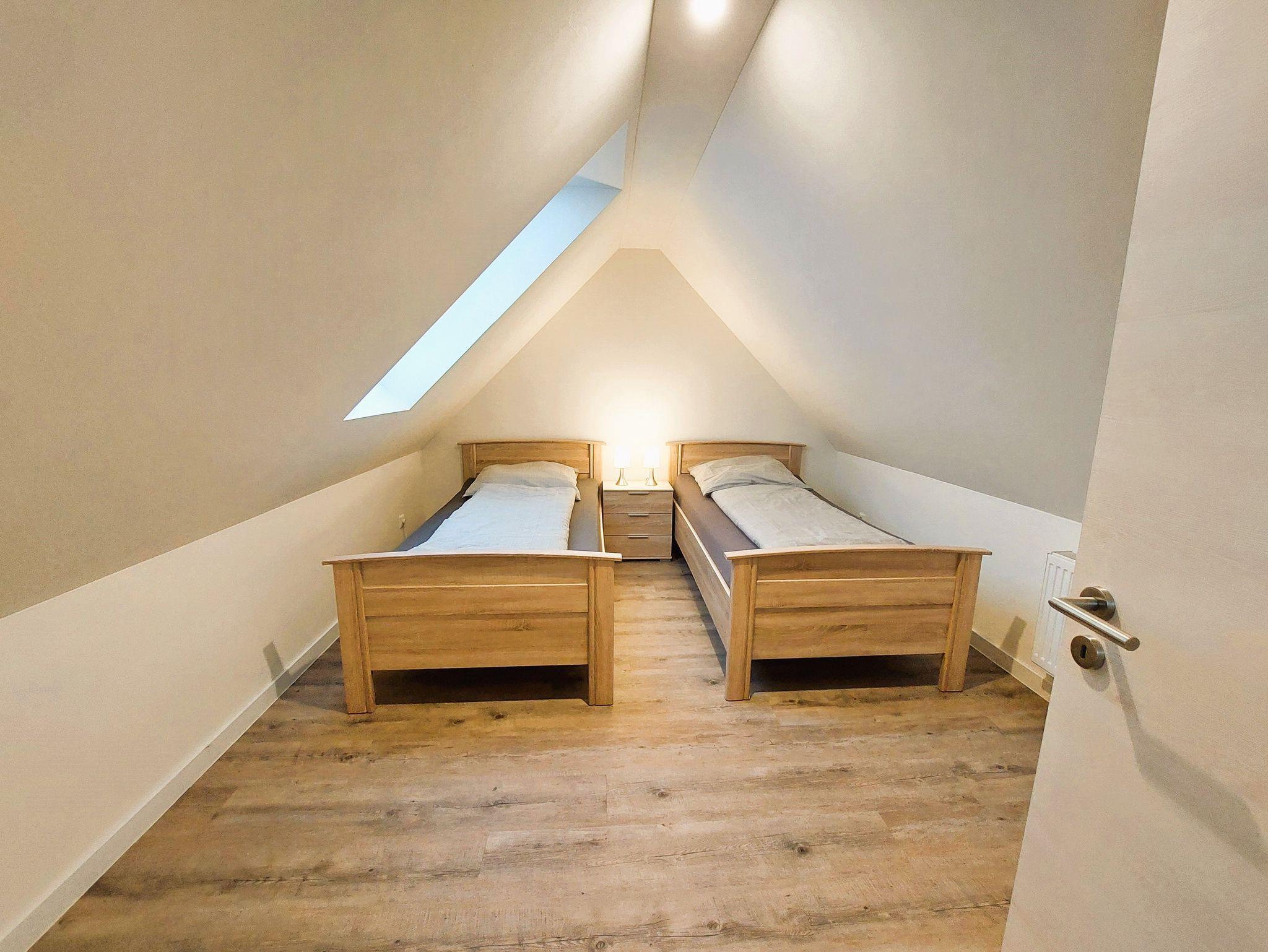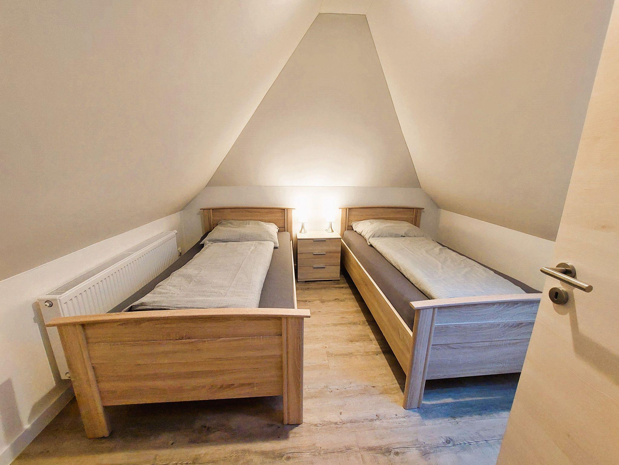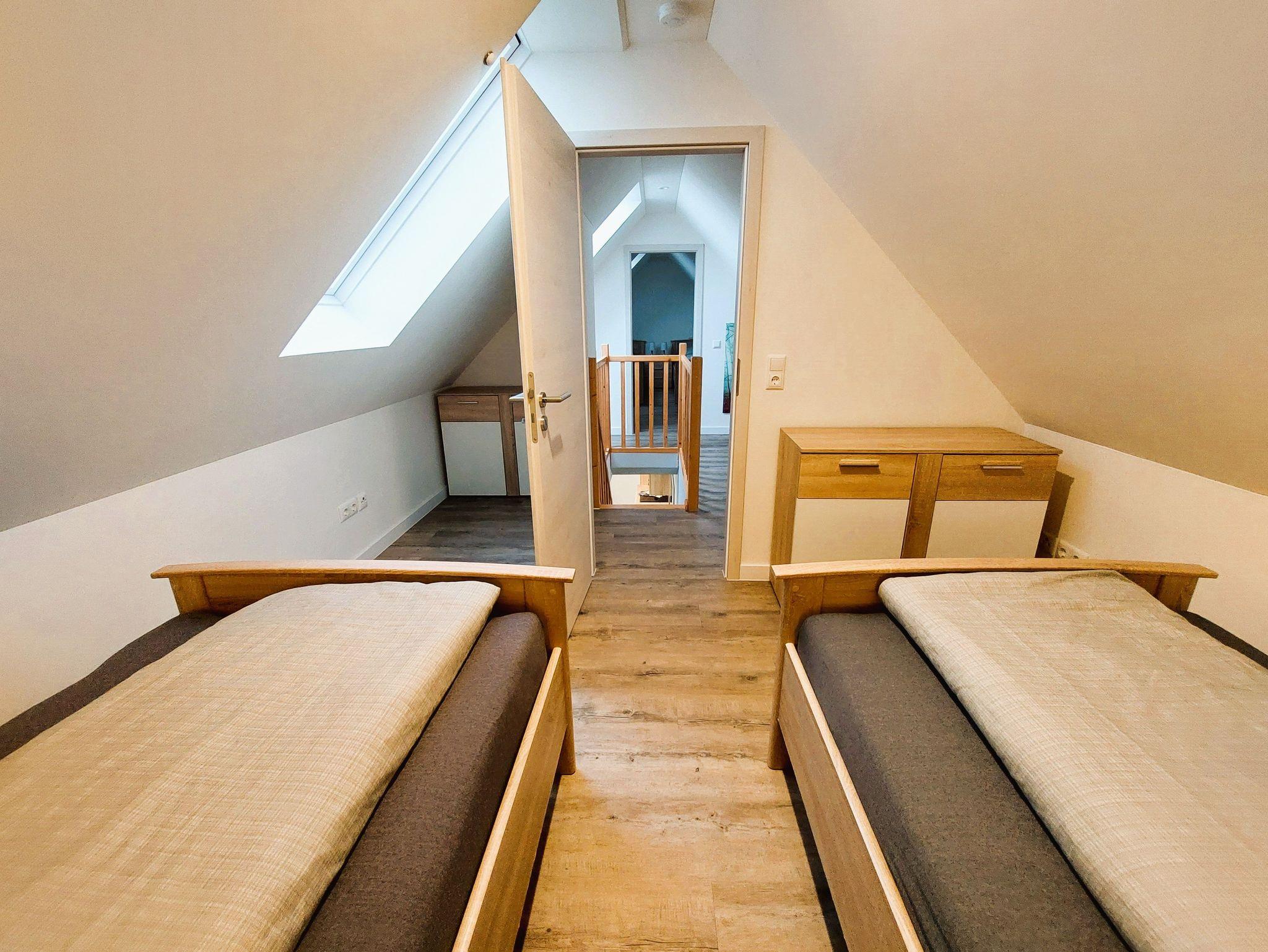 Über eine Treppe gelangen Sie ins Dachgeschoss, wo sich die beiden weiteren Schlafzimmer befinden. Schlafzimmer 2 und 3 sind jeweils mit zwei Einzelbetten ausgestattet und bieten viel Raum für Ruhe und Erholung.