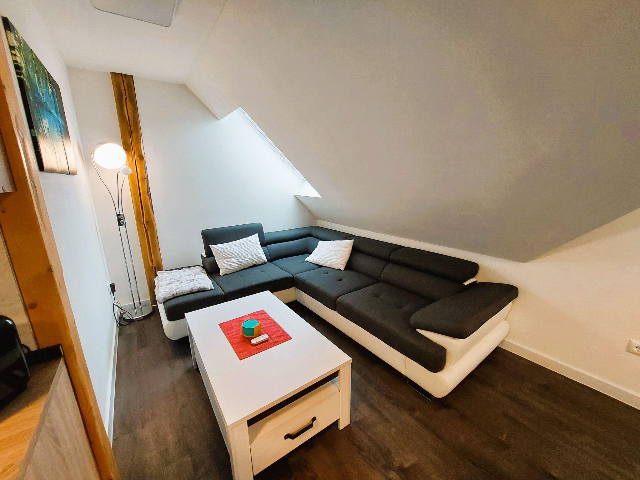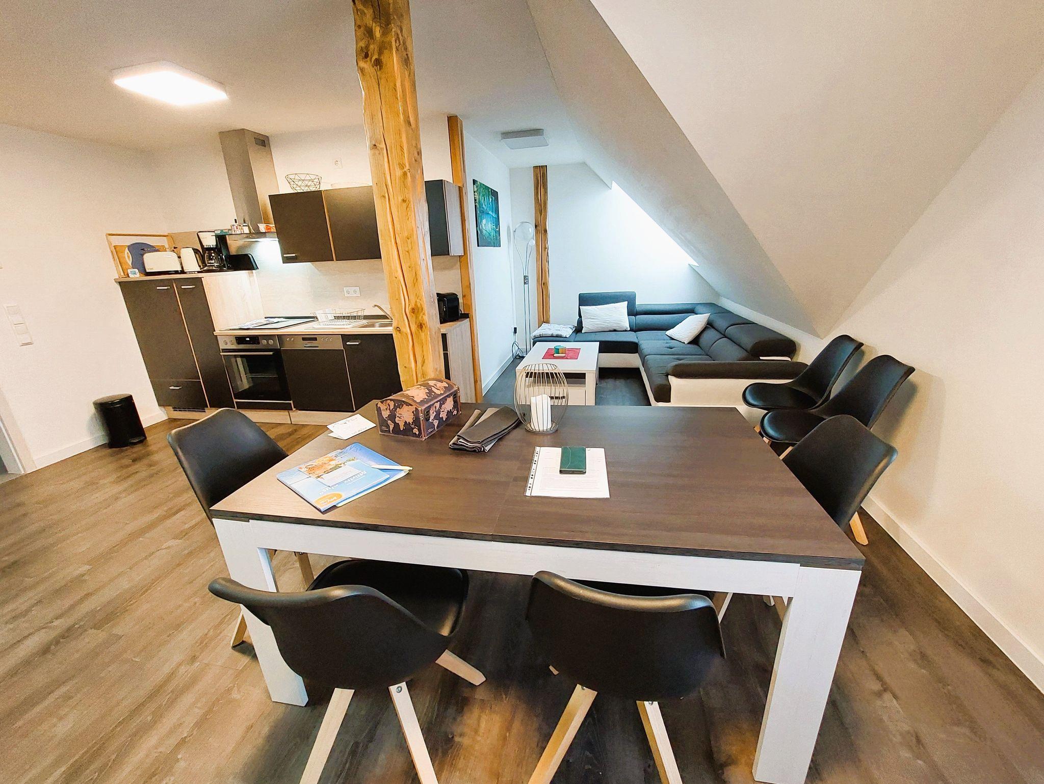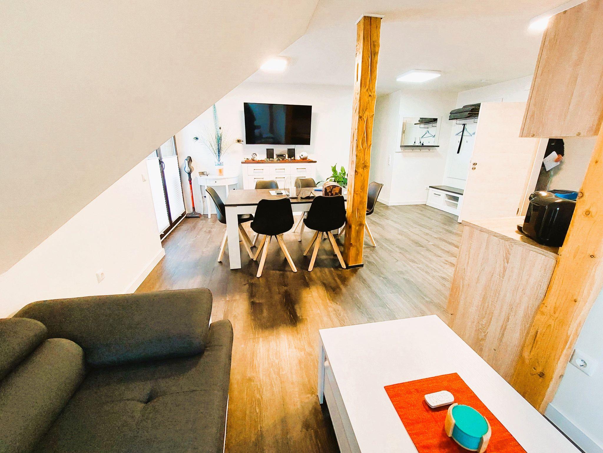 Die liebevoll eingerichtete Ferienwohnung Wolfsbau im 1. Obergeschoss bietet alles, was Sie für einen entspannten Aufenthalt benötigen. Herzstück der Wohnung ist der großzügige Wohn-, Ess- und Kochbereich mit großer gemütlicher Eckcouch, TV, Esstisch und moderner Einbauküche. Auf der Couch finden zusätzlich zwei Personen bequem Platz als Aufbettung.