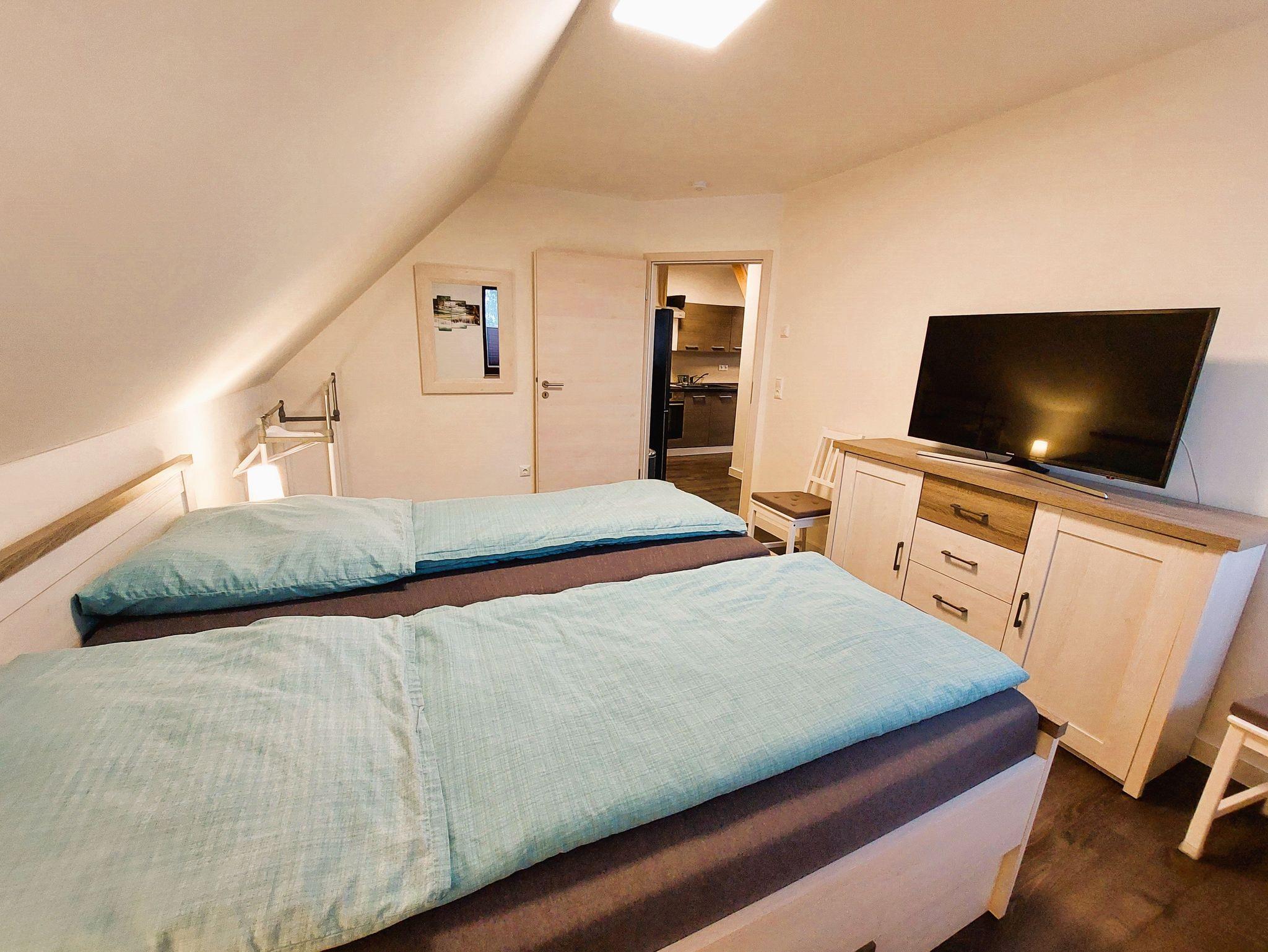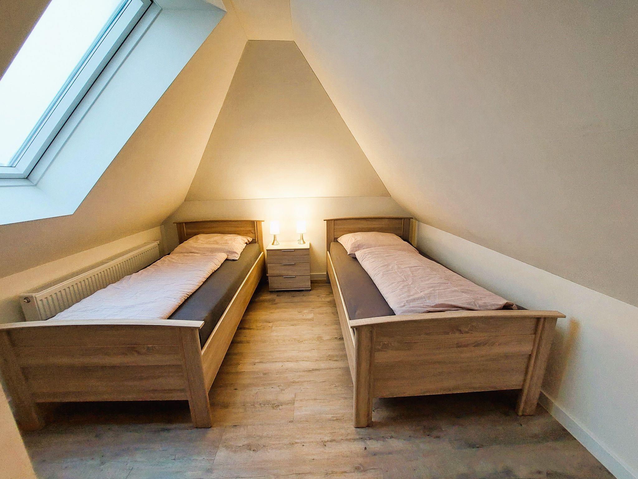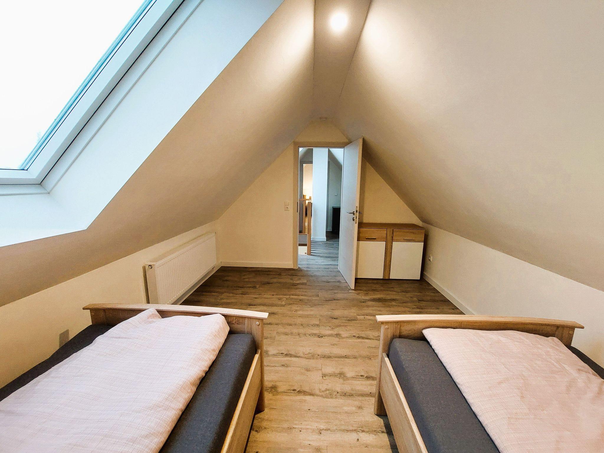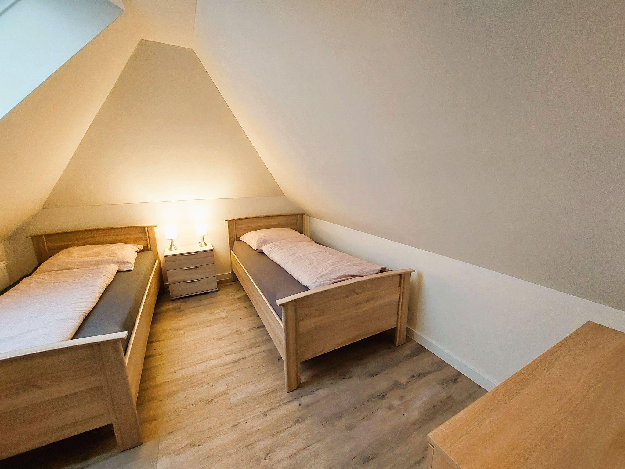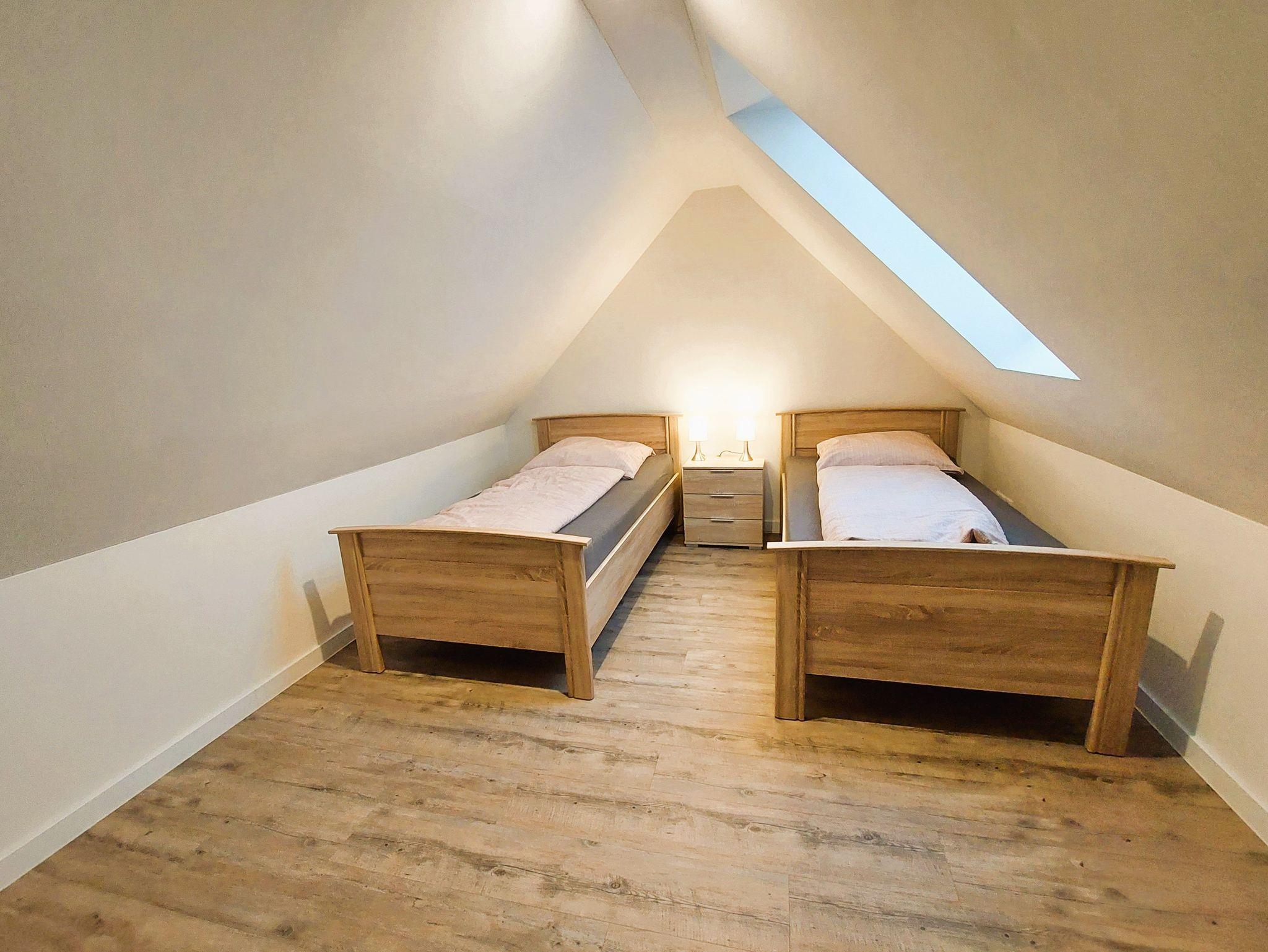 Über eine Treppe gelangen Sie ins Dachgeschoss, wo sich die beiden weiteren Schlafzimmer befinden. Schlafzimmer 2 und 3 sind jeweils mit zwei Einzelbetten ausgestattet und bieten viel Raum für Ruhe und Erholung.