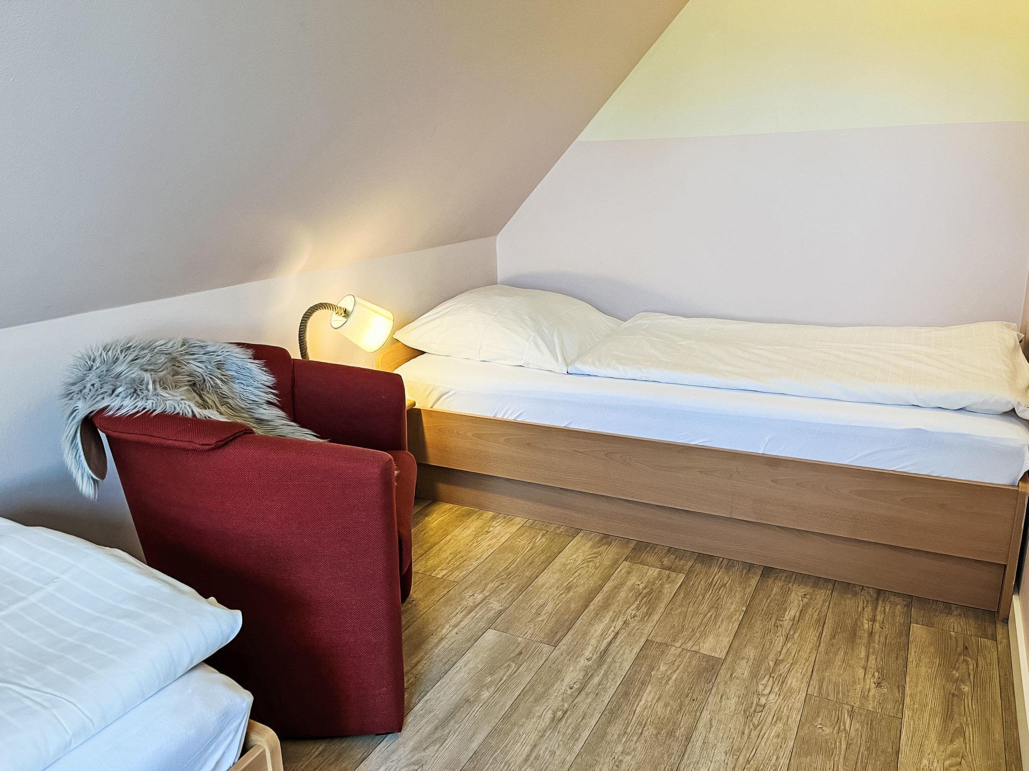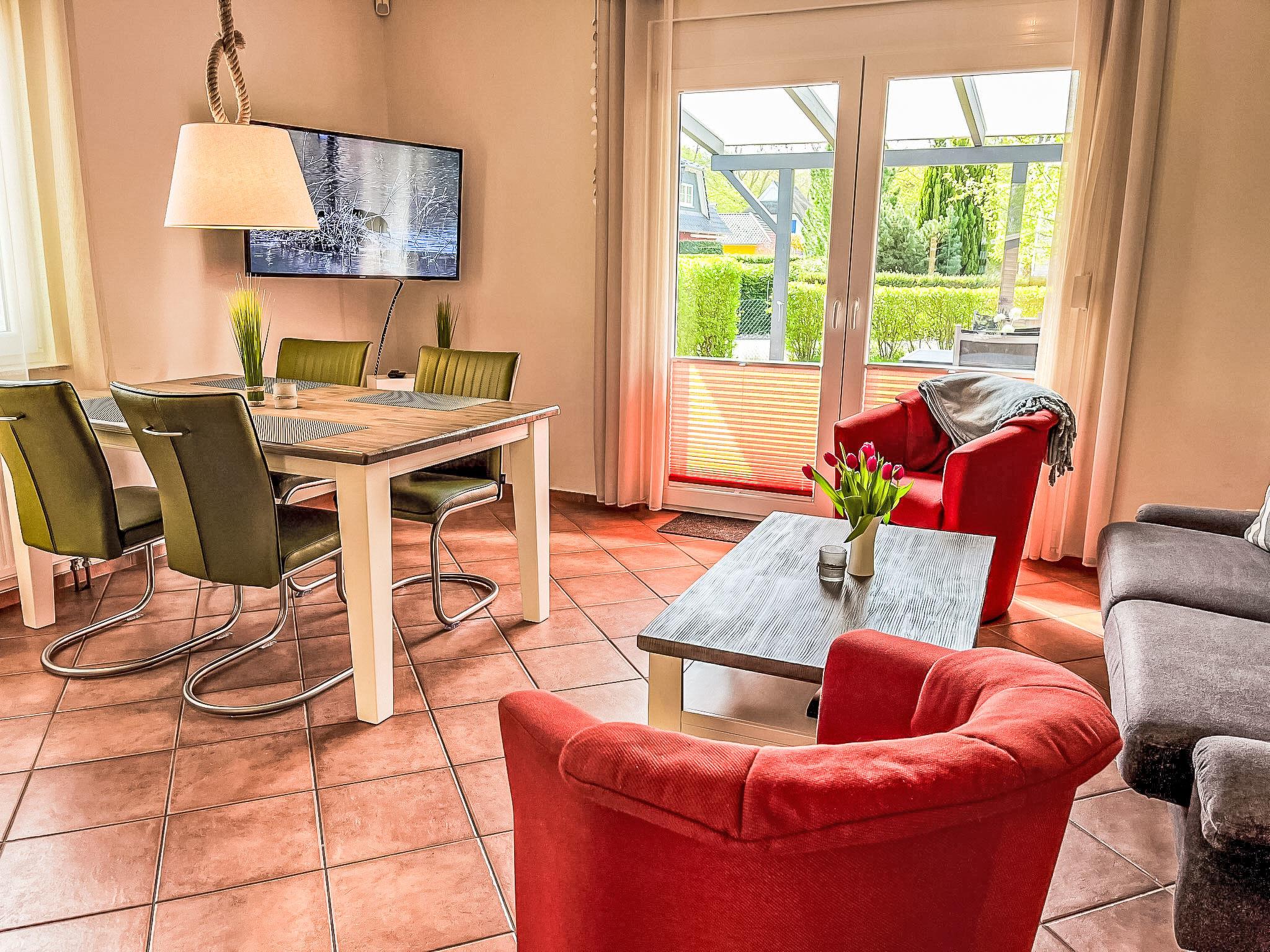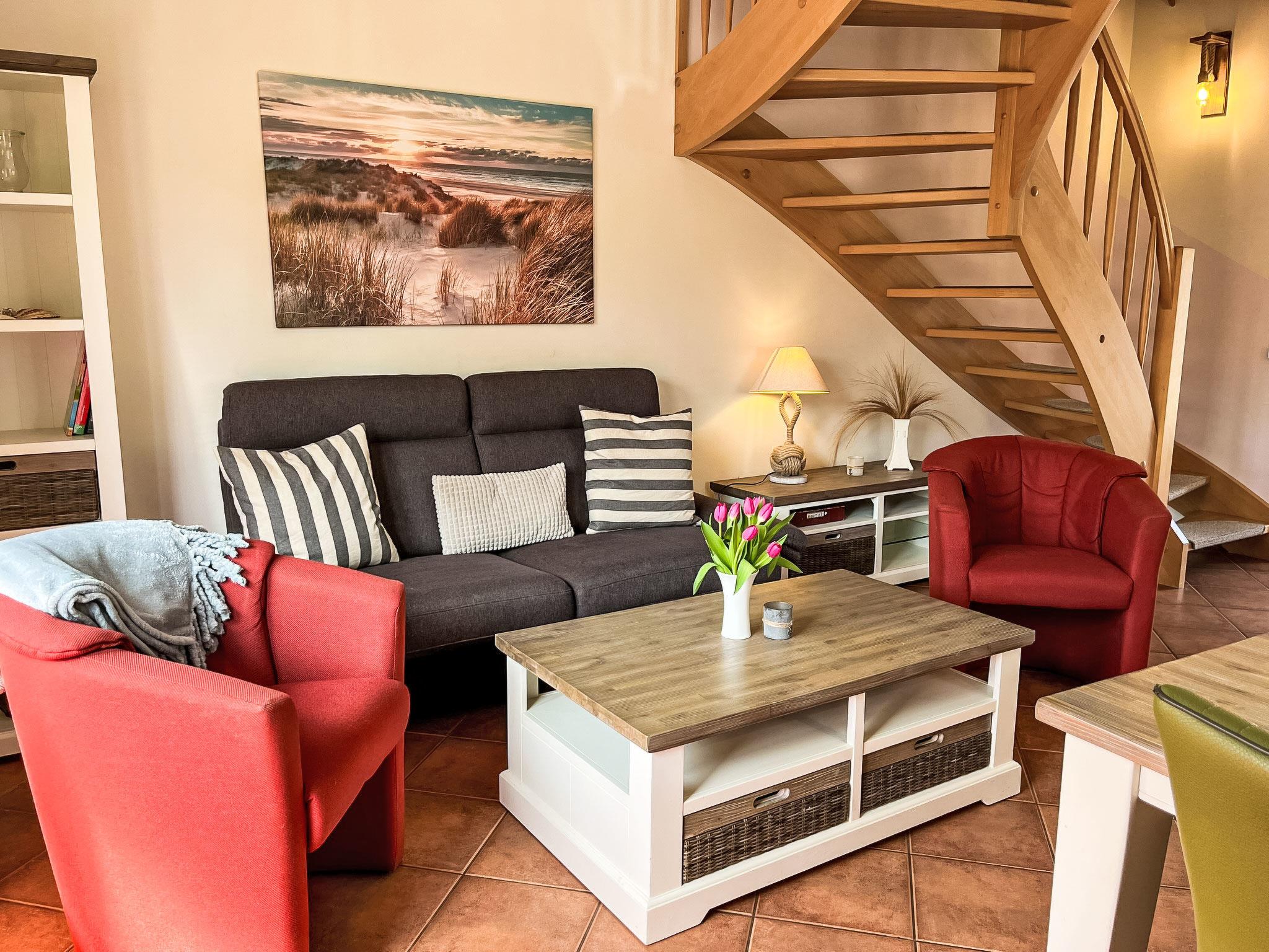 "Muschelnest", 3-room semi-detached house 60 m2 on 2 levels. Beautiful and tasteful furnishings: living/dining room with dining table, satellite TV, radio and CD-player. Exit to the terrace. Open kitchen (4 hot plates, dishwasher, toaster, kettle, microwave, electric coffee machine). Shower/WC. Upper floor: 1 double bedroom with sloping ceilings with 1 bed (160 cm, length 200 cm). 1 room with sloping ceilings with 2 beds (90 cm, length 200 cm). Gas heating. Terrace 8 m2 partly roofed. Terrace furniture. Facilities: children's high chair, baby cot (extra). Internet (WiFi, free). Please note: non-smokers only. Maximum 1 pet/ dog allowed. Smoke alarm.