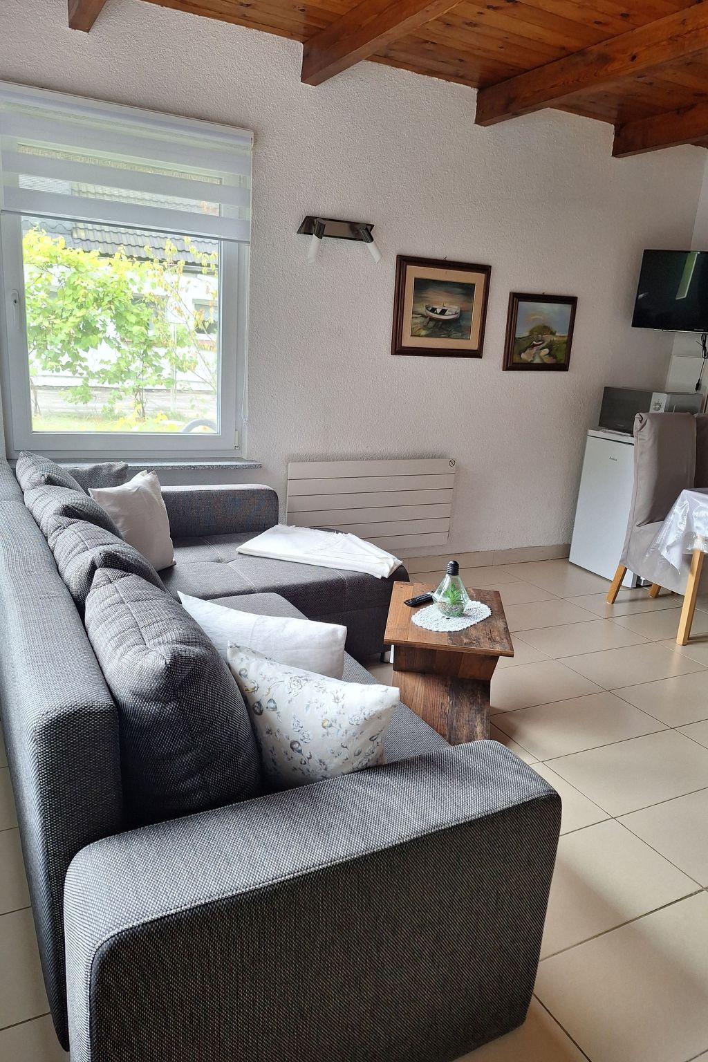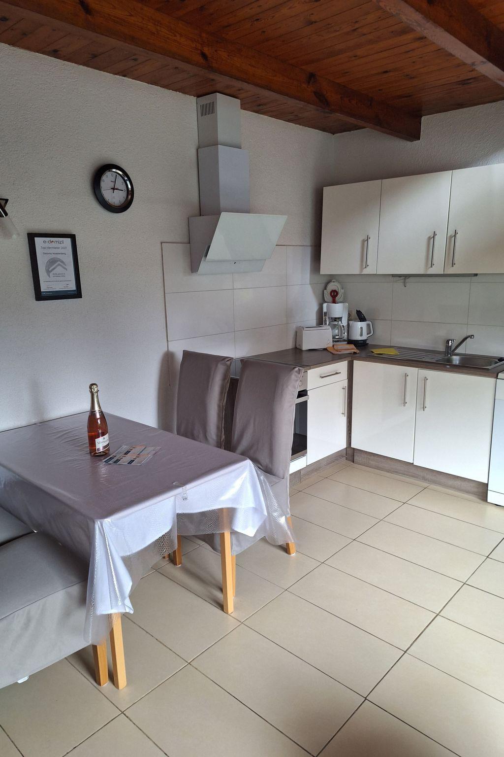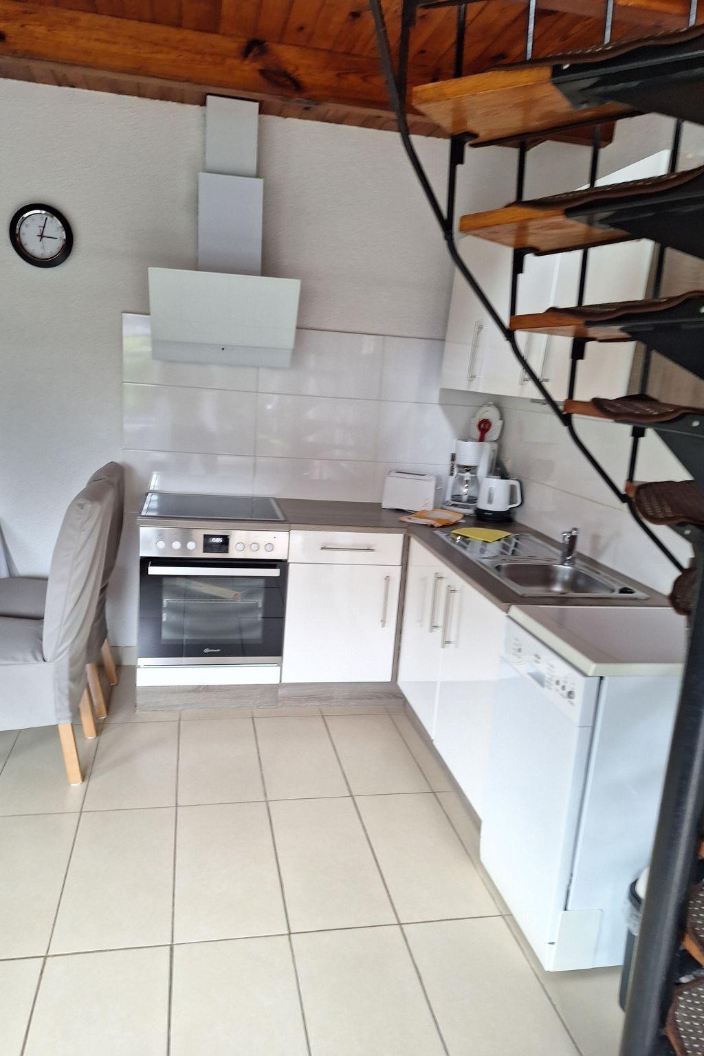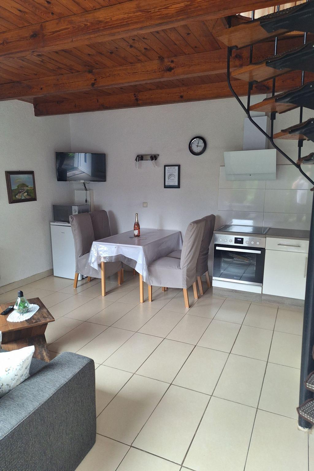 On the ground floor, a cosy living room with satellite TV invites you to spend relaxing hours. A fully equipped fitted kitchen with dishwasher and adjoining dining area allows you to enjoy meals together in a warm and inviting atmosphere. A modern bathroom with newly renovated fittings will make you feel right at home. A spiral staircase takes you to the first floor, where you will find two cosy bedrooms. The entire accommodation is heated by a new soapstone heating system and offers free Wi-Fi to make your stay as comfortable as possible.