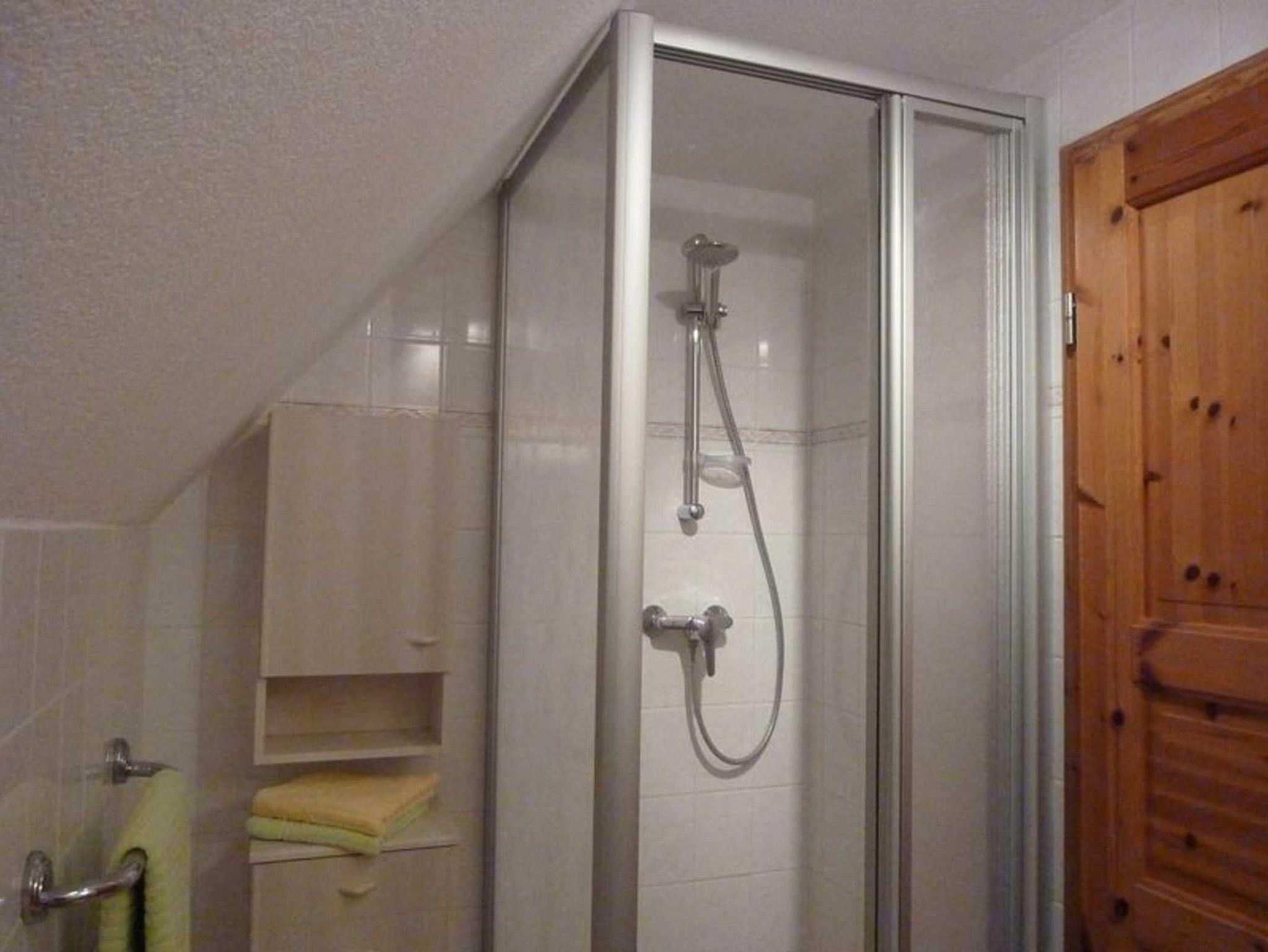 Im Bad finden Sie ein Handwaschbecken, Dusche, WC und Fön.