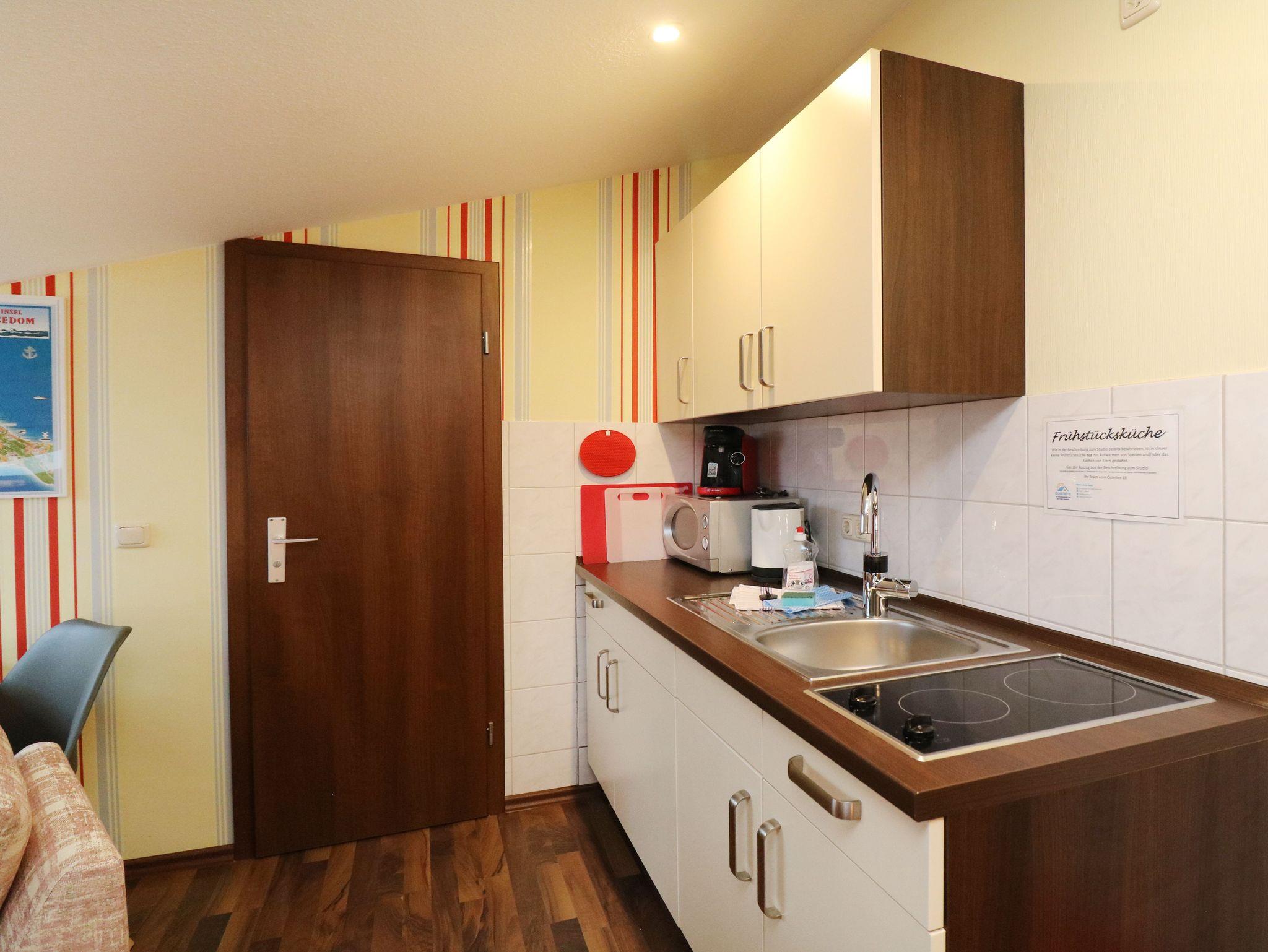 Das moderne Badezimmer überzeugt mit einer komfortablen, ebenerdigen Dusche und rundet das wohnliche Ambiente perfekt ab. Für einen genussvollen Start in den Tag steht Ihnen eine gut ausgestattete Küchenzeile zur Verfügung nur für die Zubereitung Ihres Frühstücks und zum Aufwärmen.