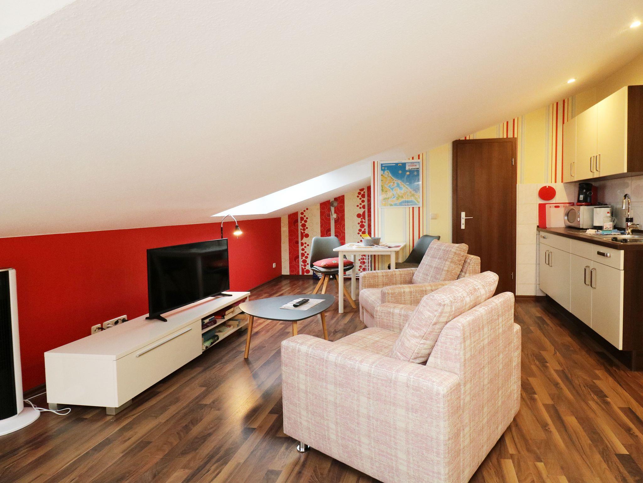 Das stilvolle Studio S02 im Ferienhaus Quartier 18 befindet sich im Obergeschoss und bietet auf 23 m² liebevoll eingerichteten Wohnkomfort für zwei Personen. Der harmonisch gestaltete Wohn- und Schlafbereich mit schrägen Dachflächen lädt zum Ankommen und Wohlfühlen ein der ideale Rückzugsort für entspannte Urlaubstage.