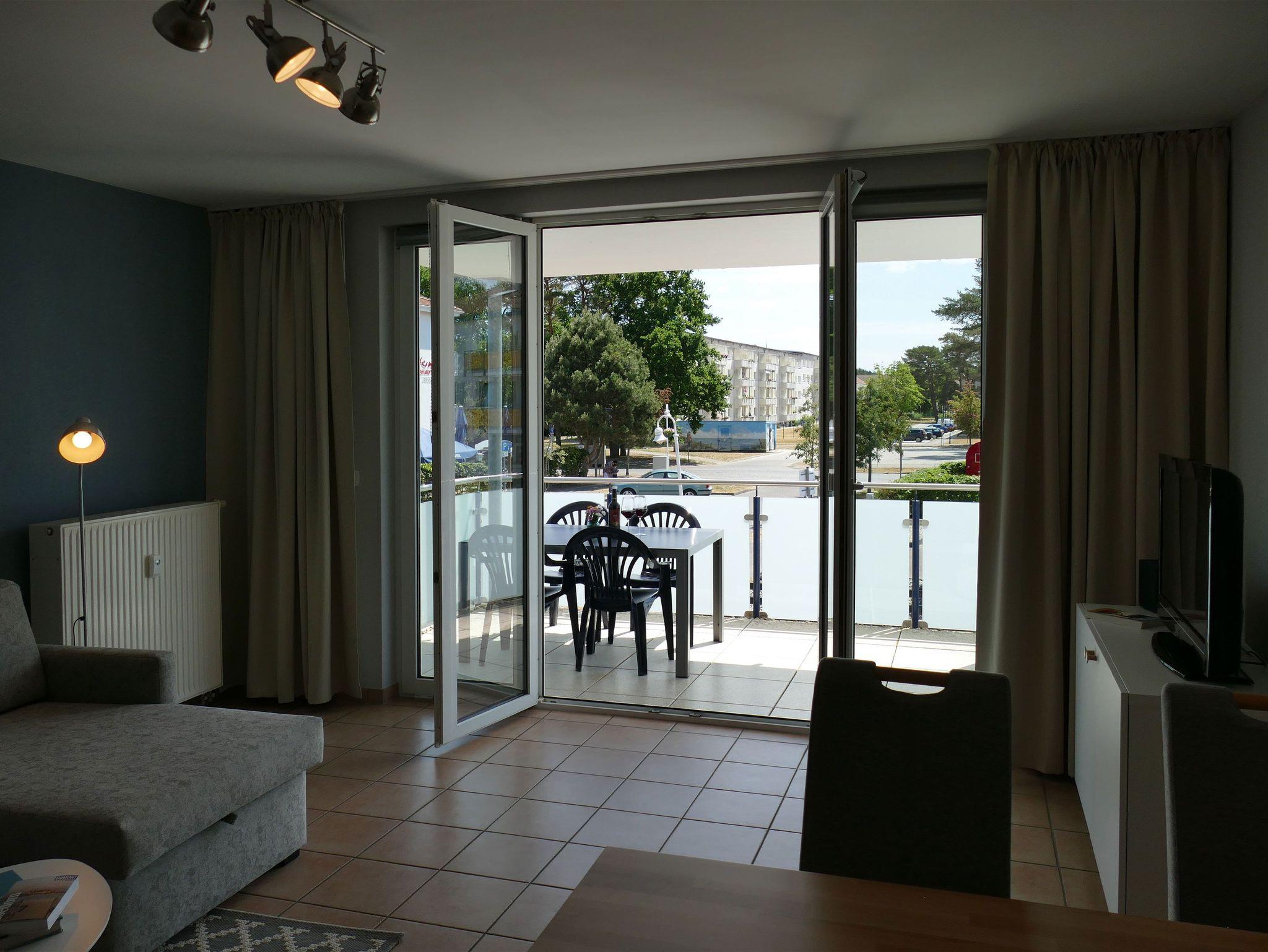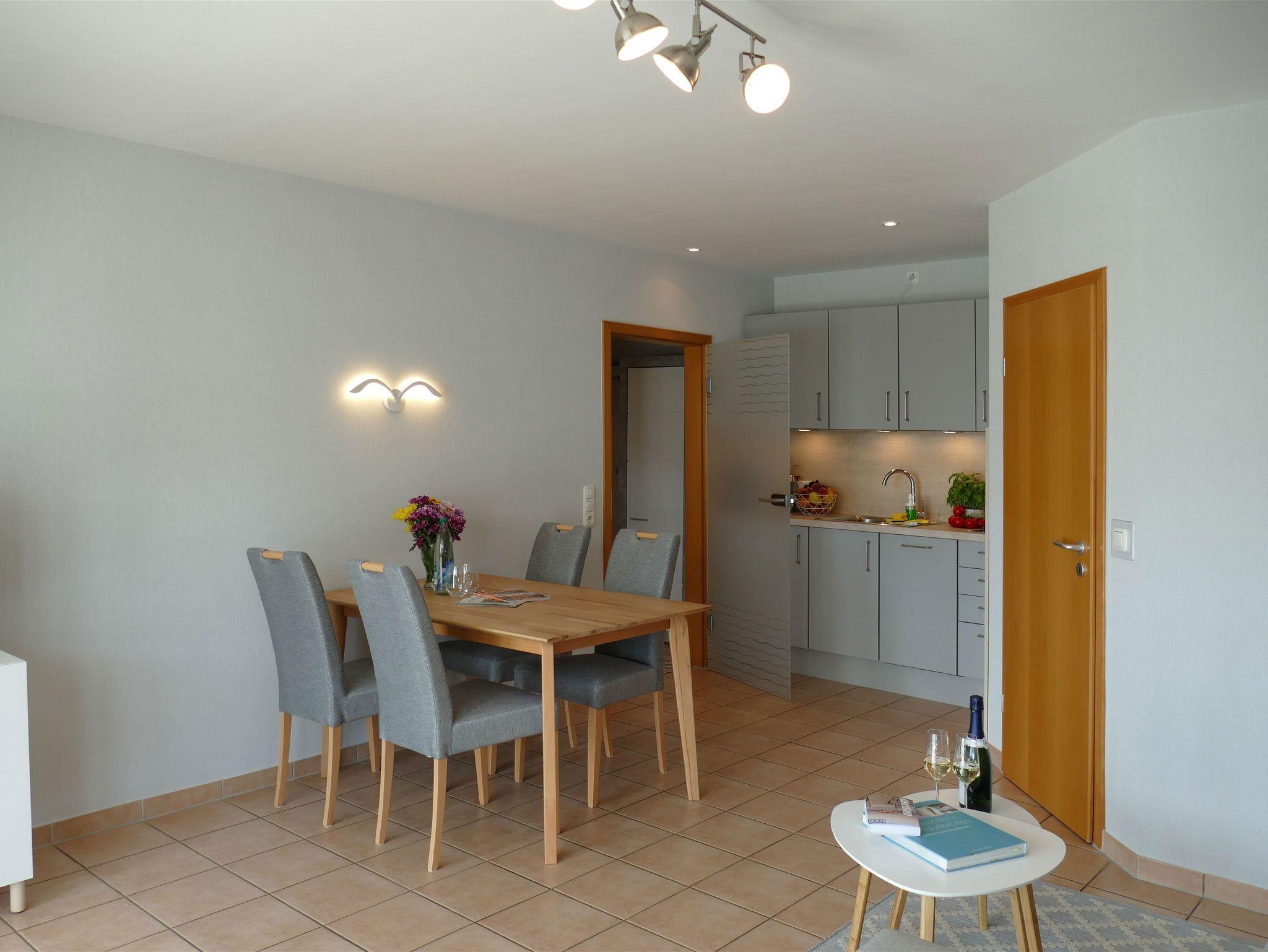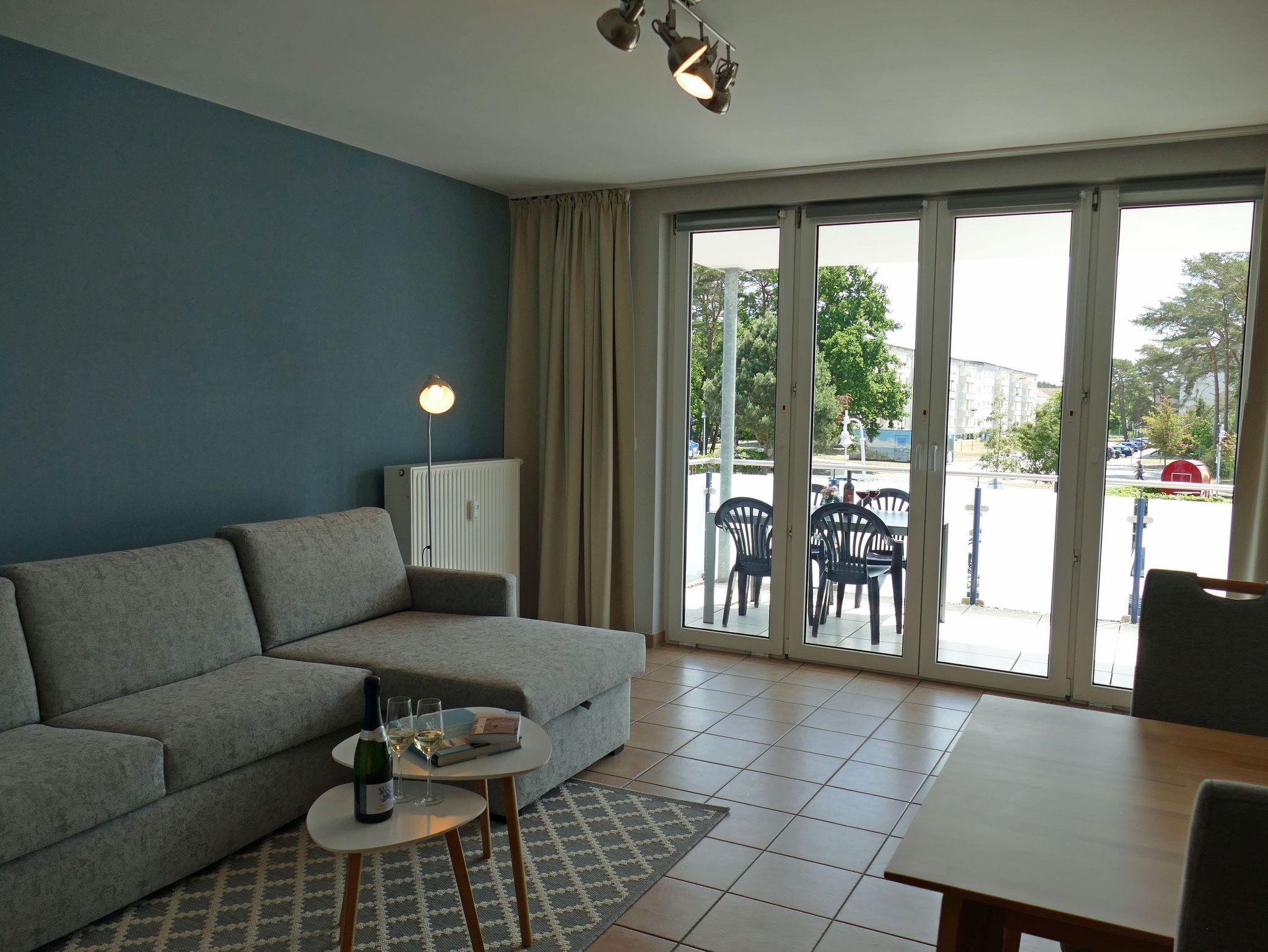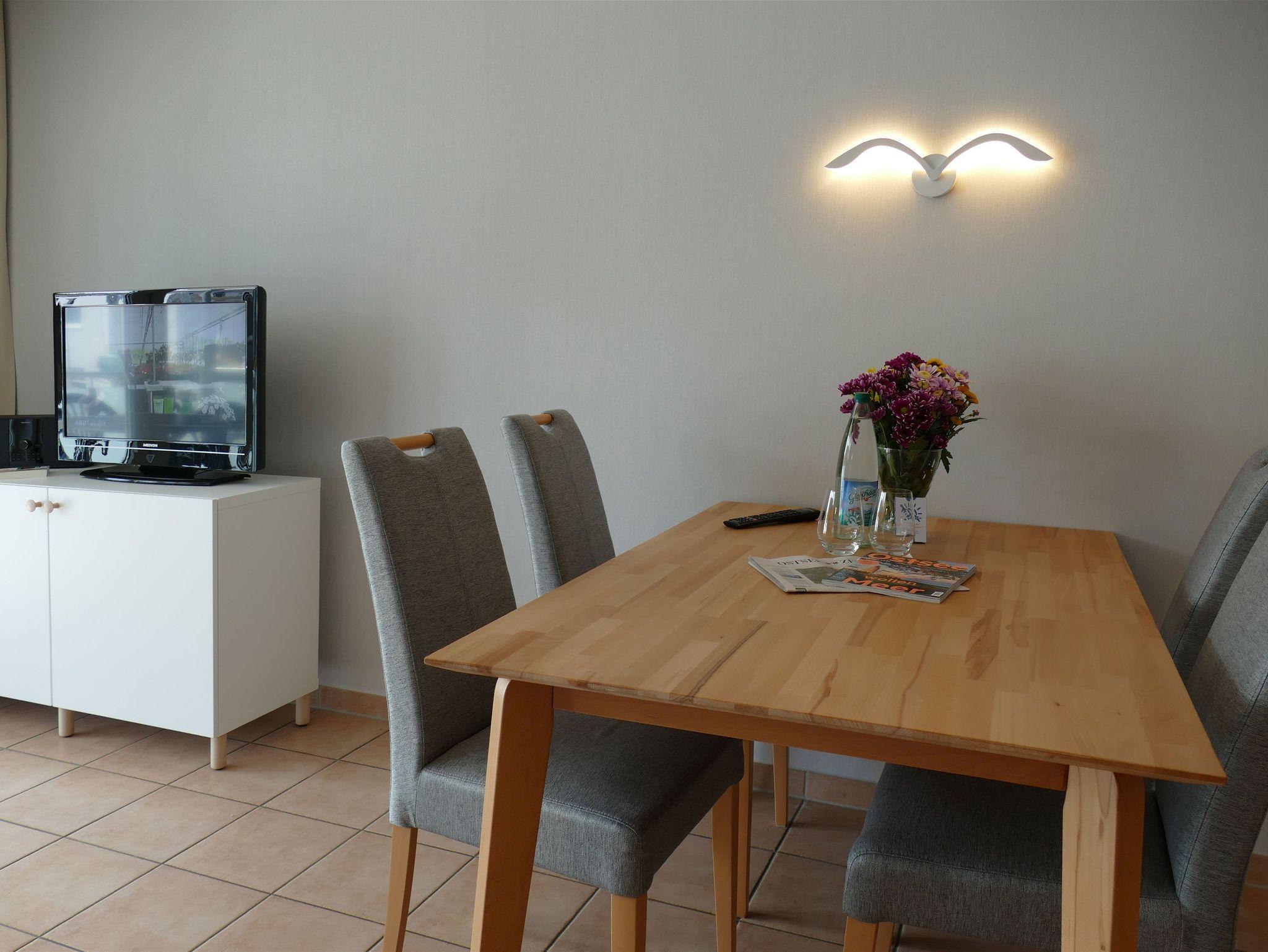 Im Wohnbereich erwartet Sie ein gemütliches Sofa mit Schlaffunktion, ein moderner TV-Schrank mit HiFi-Anlage sowie ein Essplatz mit vier bequemen Stühlen. Durch die große Fensterfront nach Westen gelangen Sie auf den sonnigen Balkon, der mit Sitzmöbeln für vier Personen zum Entspannen und Verweilen einlädt.
