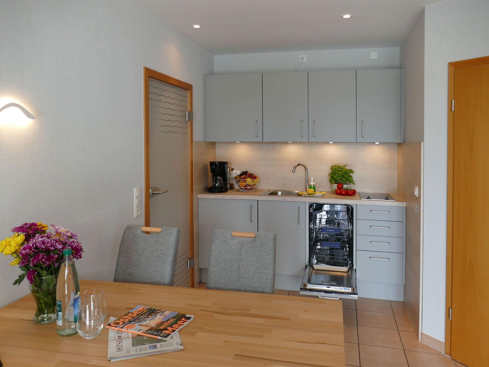 Die Küchenzeile verfügt über einen Zwei-Platten-Herd, Backofen, Kühlschrank, Kaffeemaschine und weitere nützliche Küchenutensilien ideal für die Selbstverpflegung im Urlaub.