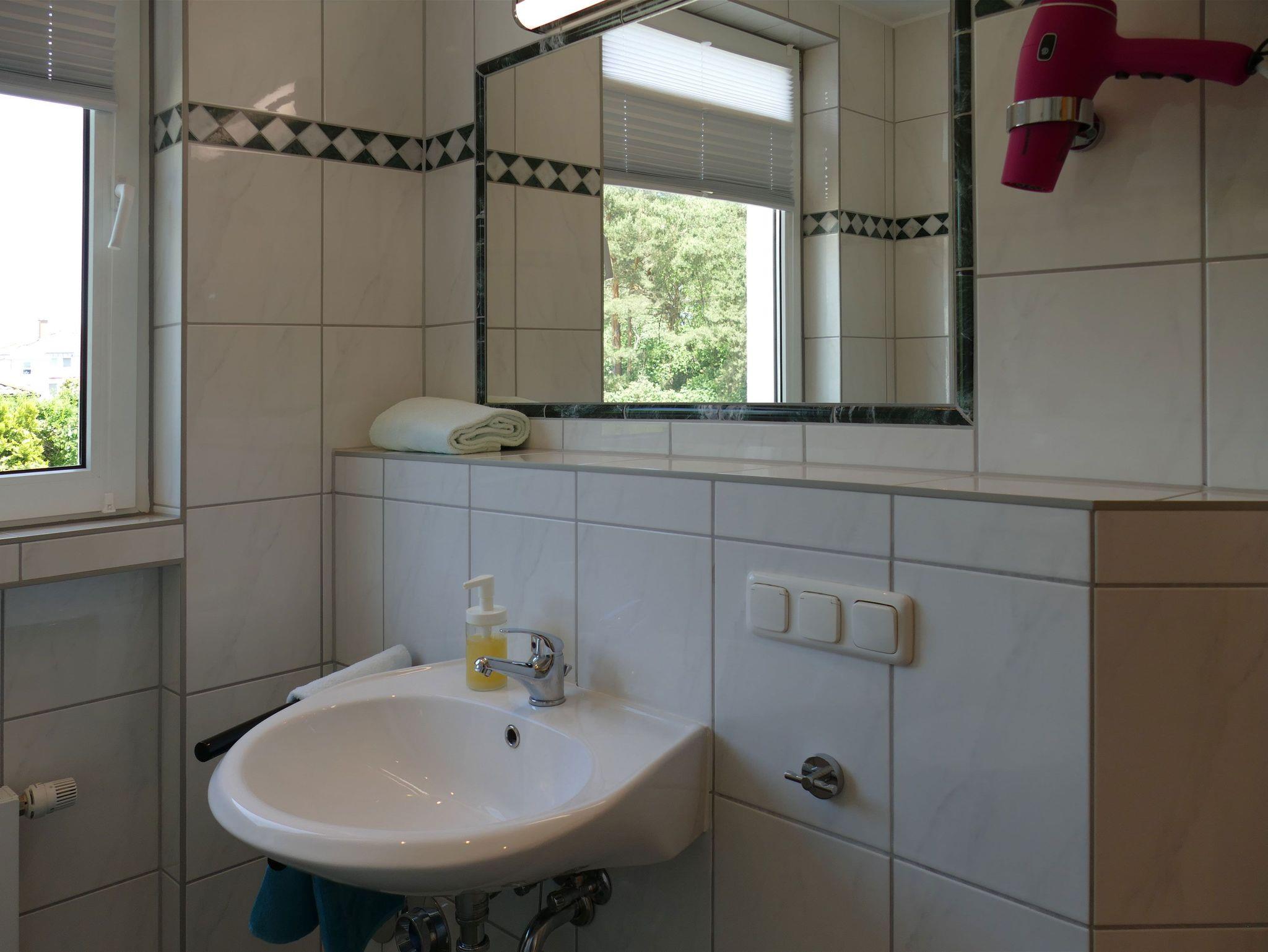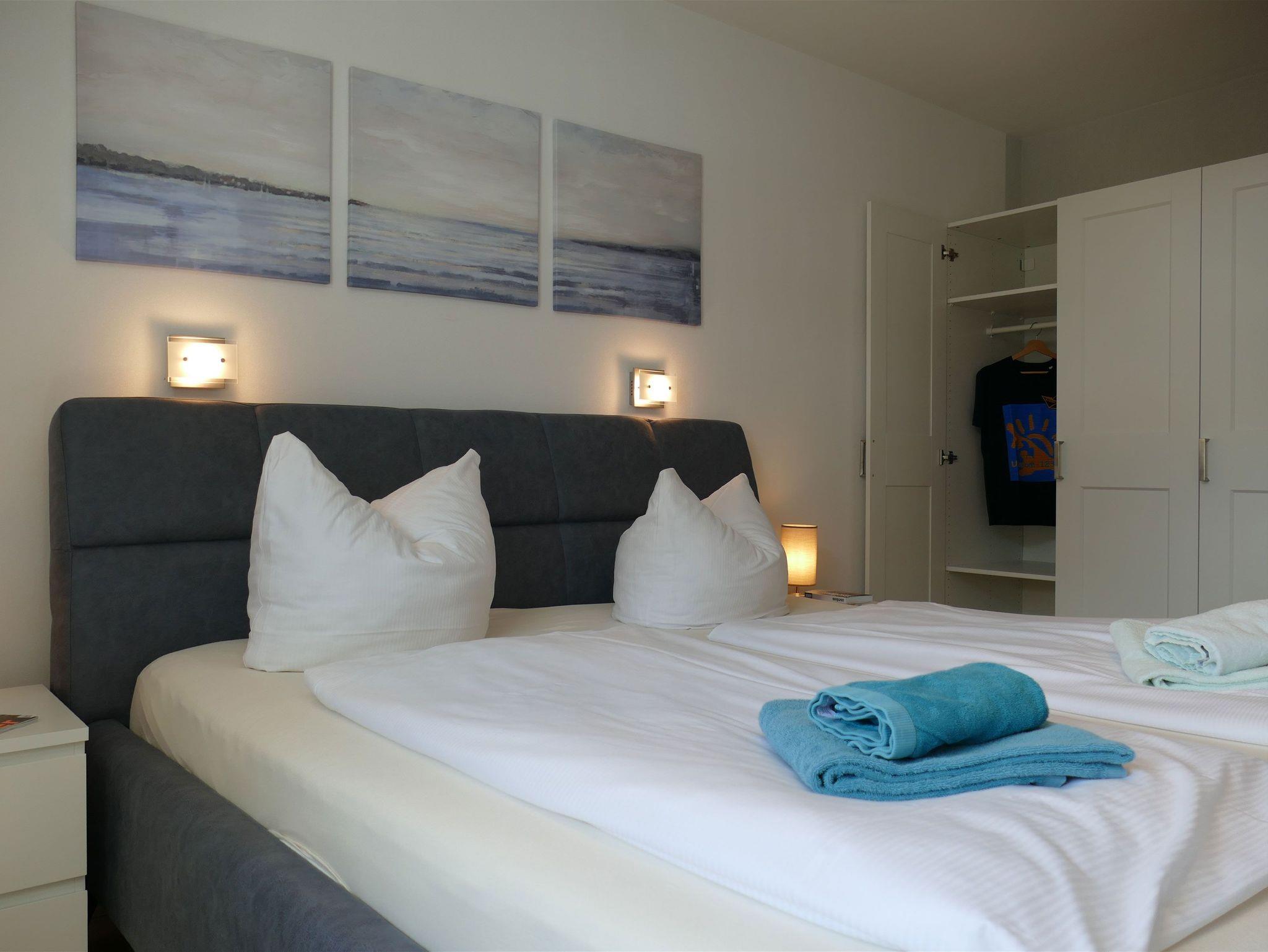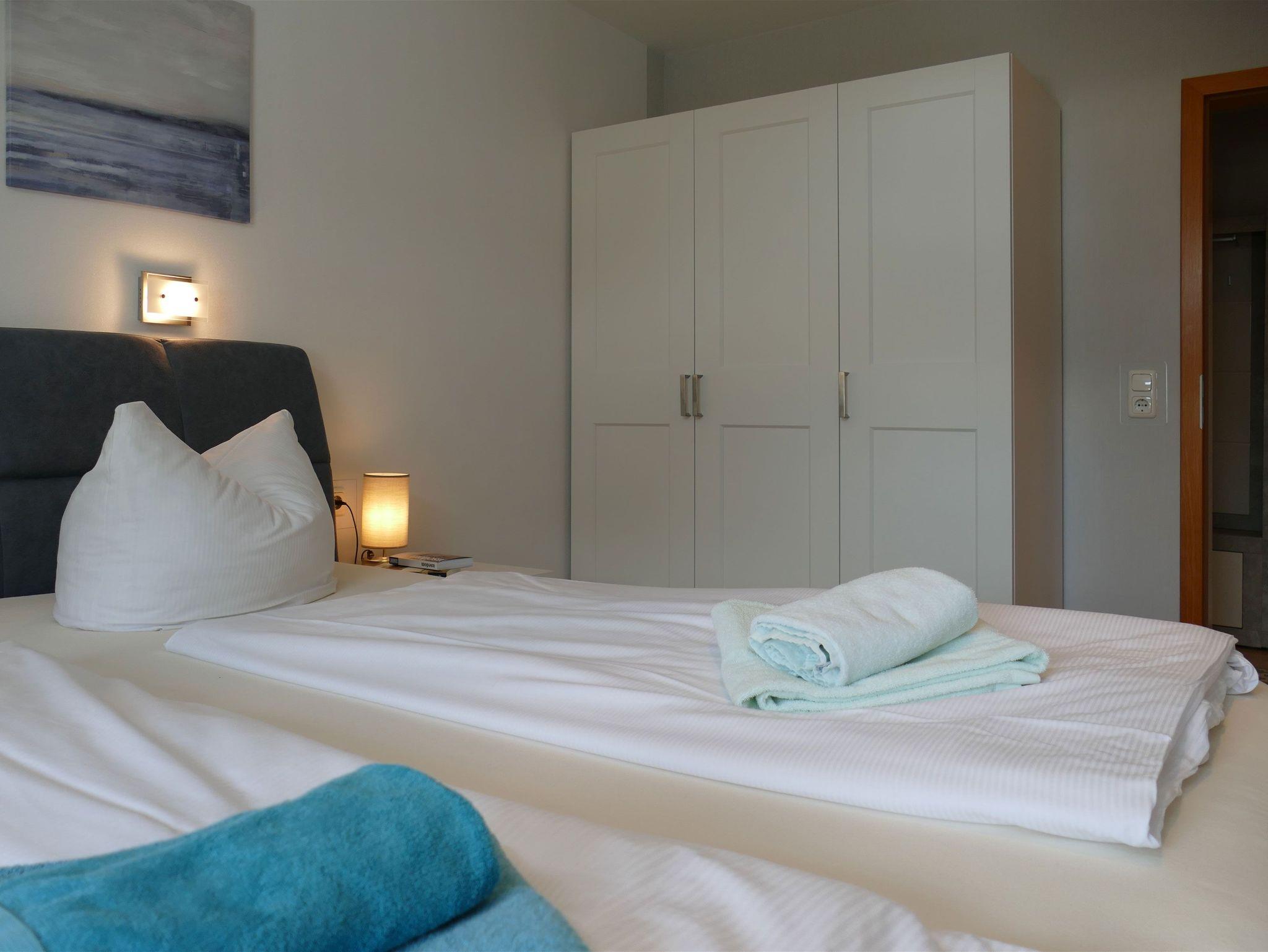 Im Schlafzimmer stehen Ihnen ein Doppelbett (2 × 90 × 200 cm) und ein geräumiger Kleiderschrank zur Verfügung. Das Badezimmer ist mit Dusche, Waschtisch und WC ausgestattet.