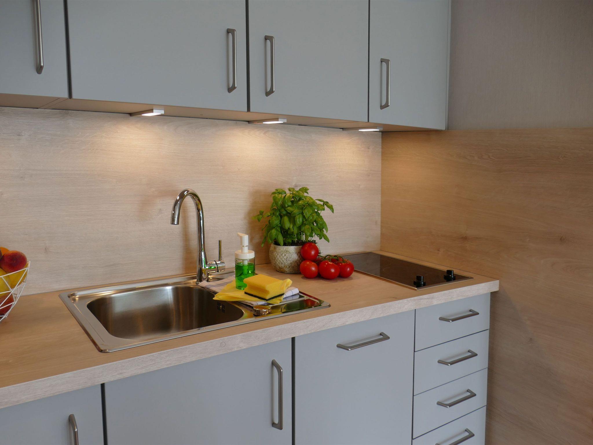 Küche mit 2-Platten-Herd, Kühlschrank, Kaffeemaschine, Wasserkocher, Geschirr und Besteck u.v.m.