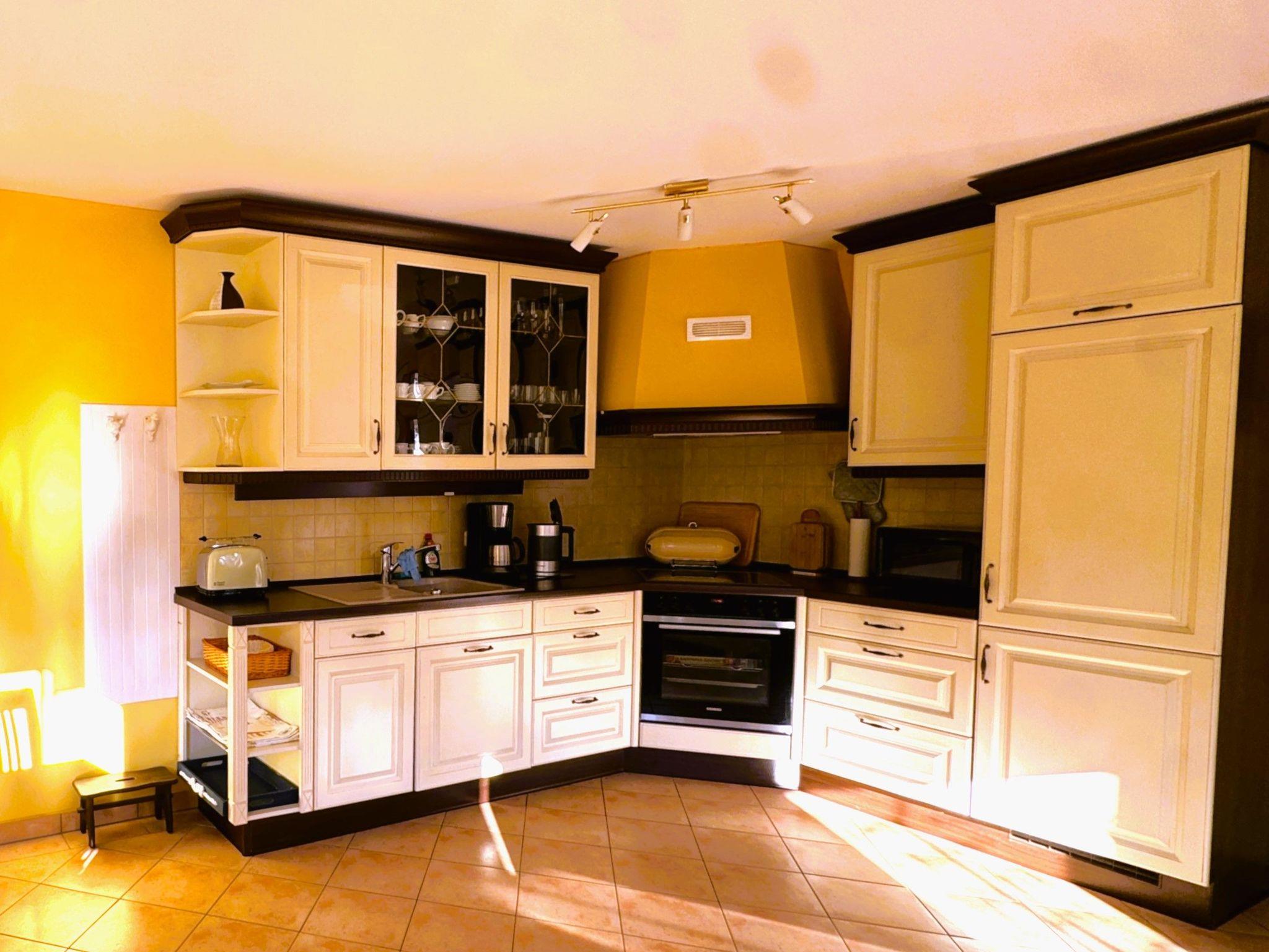 • Küchenzeile mit Herd (Backröhre u. Ceran), Kühlschrank, Geschirrspüler, Mikrowelle, Kaffeemaschine, Toaster und Wasserkocher