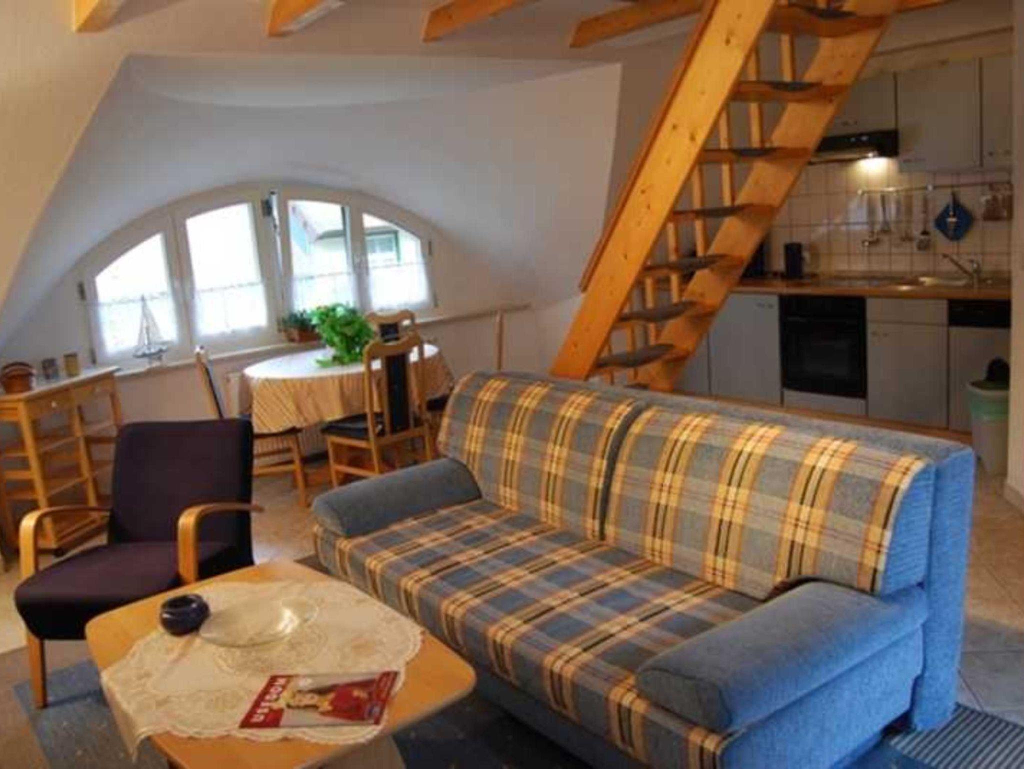Unsere modern eingerichteten 2-Raum-Maisonettewohnungen befinden sich im Obergeschoss und erstrecken sich über zwei Etagen. Ein großzügiges Wohnzimmer mit einem separaten Essplatz und einer modernen Küche und das Bad mit Dusche, Waschbecken und WC befinden sich im unteren Bereich. Zur Sitzecke gehören ein Radio und ein Sat-TV. Die Küche hat neben Kühlschrank mit TK, und einen Herd mit Cerankochfeld einen Geschirrspüler. Geschirr, Gläser, Töpfe und div. Kochzubehör sind ebenfalls vorhanden. Im Obergeschoss gibt es das Schlafzimmer mit 3 Betten. Vom großzügigen Balkon schauen Sie Richtung Meer. Auf der Seeseite befindet sich zudem ein interessant gestalteter Grillplatz für gemütliche Stunden.
