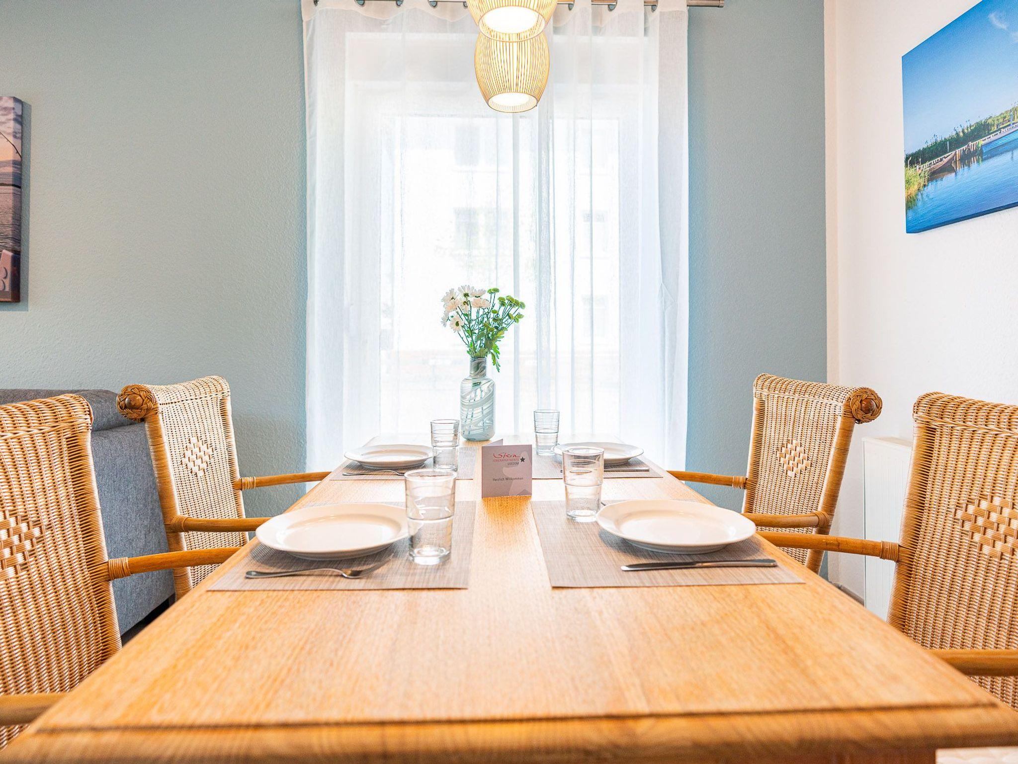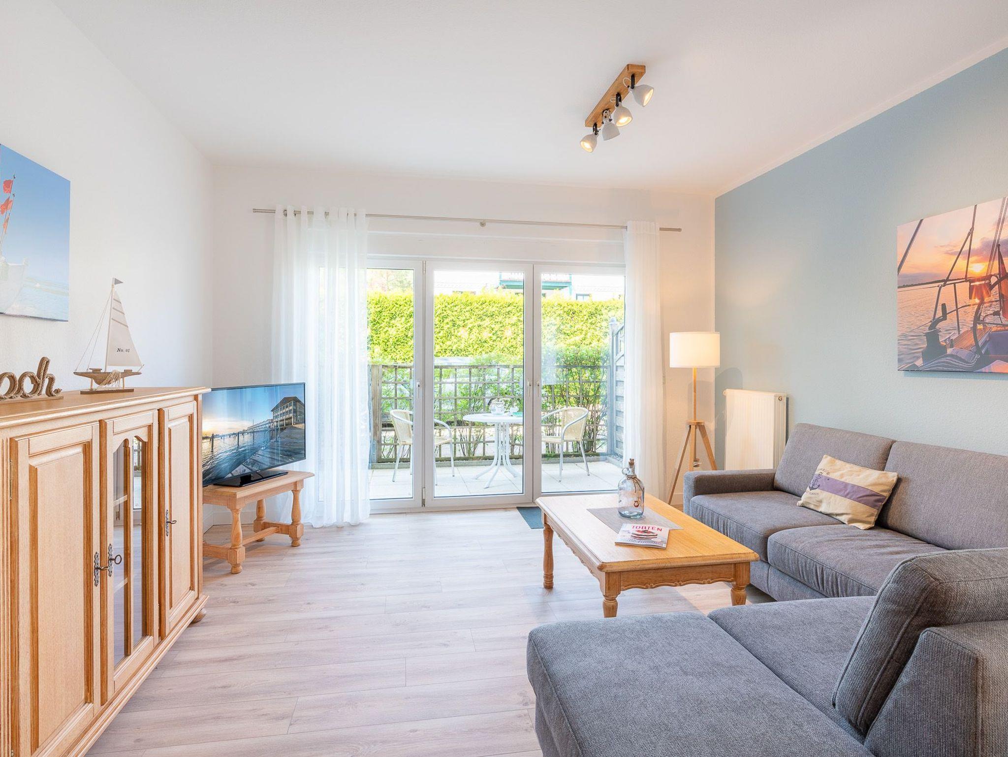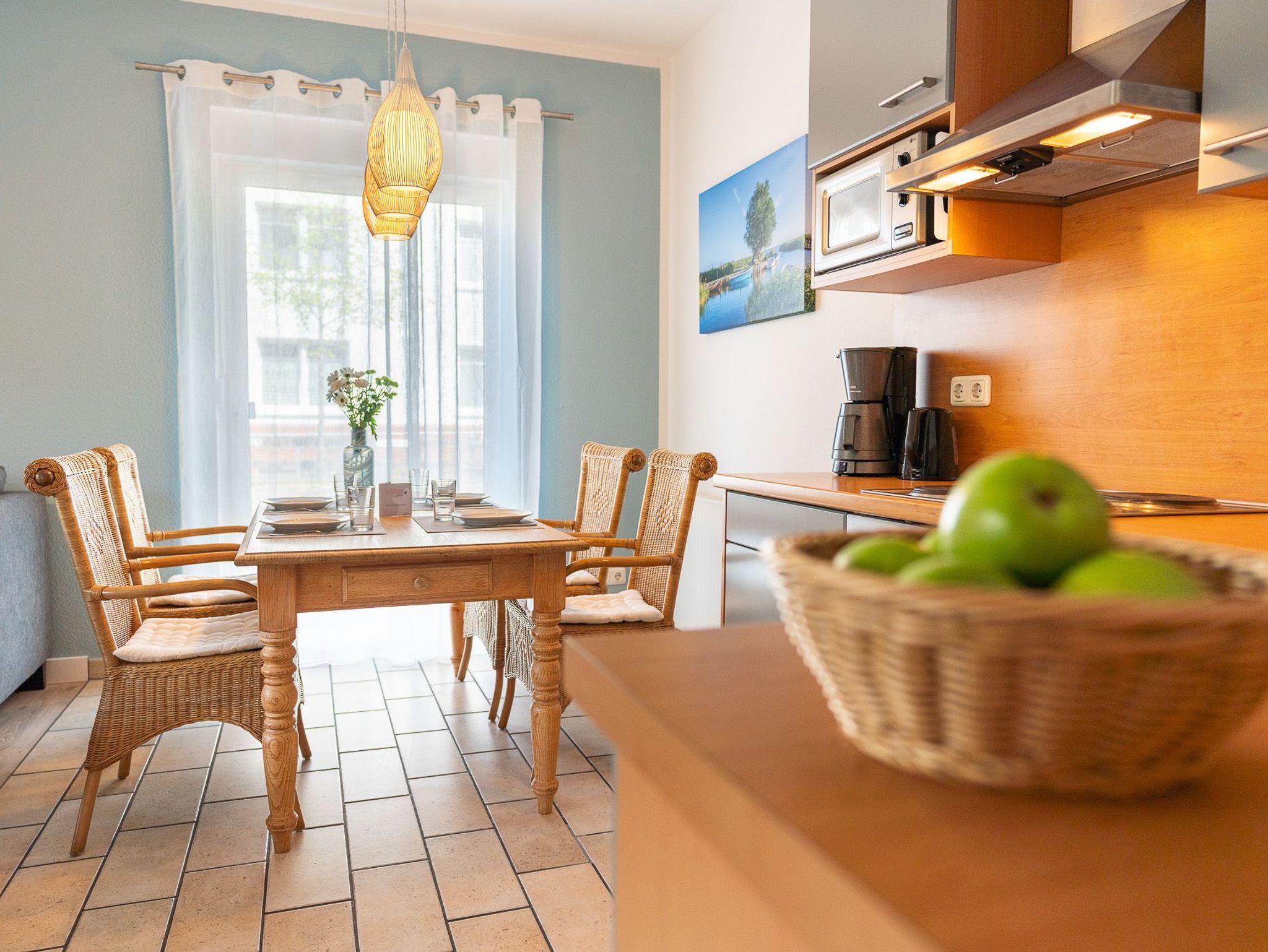 Der behagliche Wohnraum mit einer gemütlichen Sitzecke und einem Fernseher, sowie die komplett eingerichtete, offene Küche bieten einen guten Ort um sich gemeinsam in der Wohnung zu entspannen. Durch die zwei Schlafzimmer, gibt es jedoch auch einen ruhigen Rückzugsort um abzuschalten. Ein Schlafzimmer ist mit einem Doppelbett ausgestattet und eins mit zwei Einzelbetten. Das Badezimmer besitzt eine Dusche und ein WC. Auf dem Balkon können Sie gemütlich den Abend ein- und ausklingen lassen. WLAN ist vorhanden. Waschmaschine und Trockner können Sie gegen Entgelt verwenden. Natürlich stellen wir Ihnen ein PKW-Parkplatz vor dem Haus zur Verfügung. Zum feinsandigen, weißen Badestrand sind es nur ca. 3-4 Gehminuten.