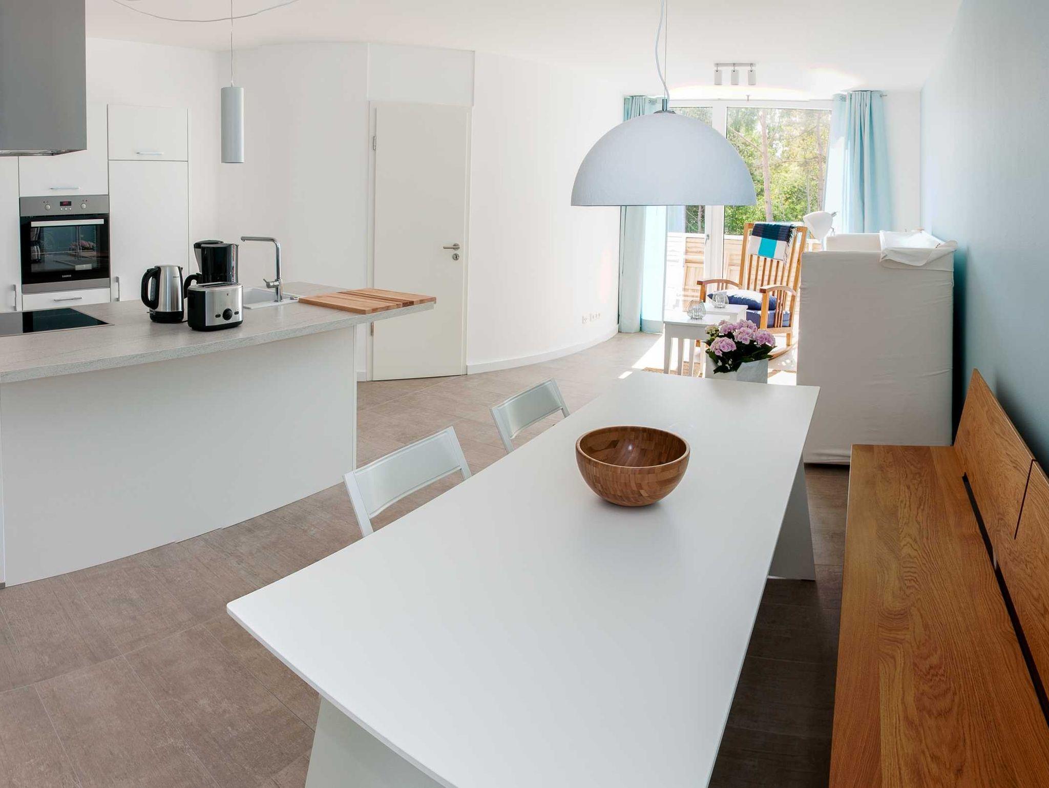 • Wohn-/ Essbereich mit Esstisch für 4 Personen, Schlafcouch (ca. 1,60 m x 2,00 m), Couchtisch, Flachbildfernseher mit ca. 100cm Bilddiagonale