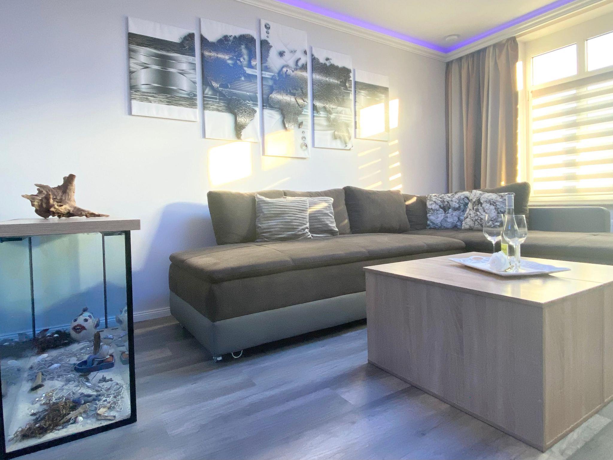 • moderner Wohnraum mit E-Kamin, großem 70 Zoll TV, Schlafcouch für Aufbettung, LED-Beleuchtung, großem Esstisch, Komfort Küche, Induktionsherd, Backofen, Geschirrspüler, Kühlschrank mit Tiefkühlfach, Kaffeemaschine, Toaster, Wasserkocher