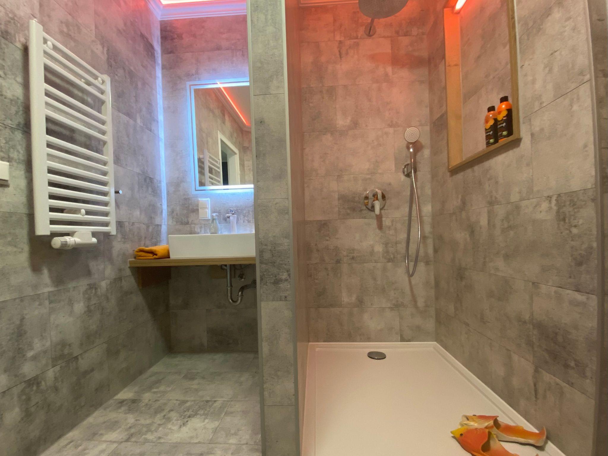• Bad mit ebenerdiger Dusche, Toilette, Waschmaschine, LED-Beleuchtung