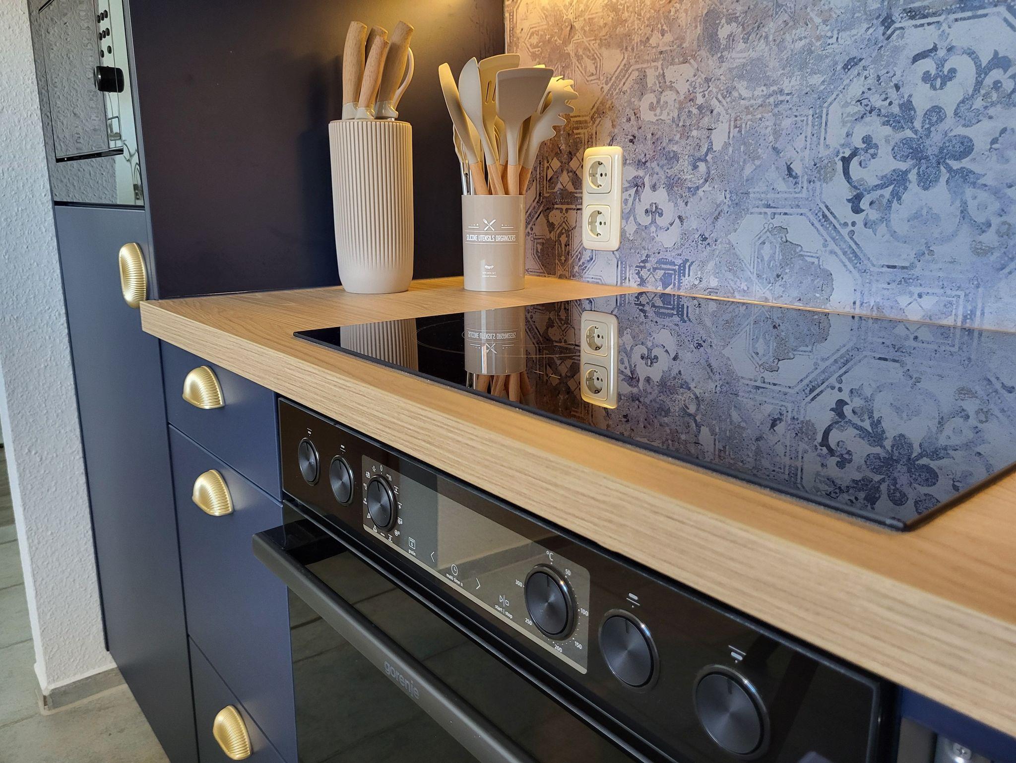 Küche: Die funktionale Küchenzeile ist mit einem Herd und einer Mikrowelle ausgestattet, sodass Sie mühelos leckere Mahlzeiten zubereiten können.
