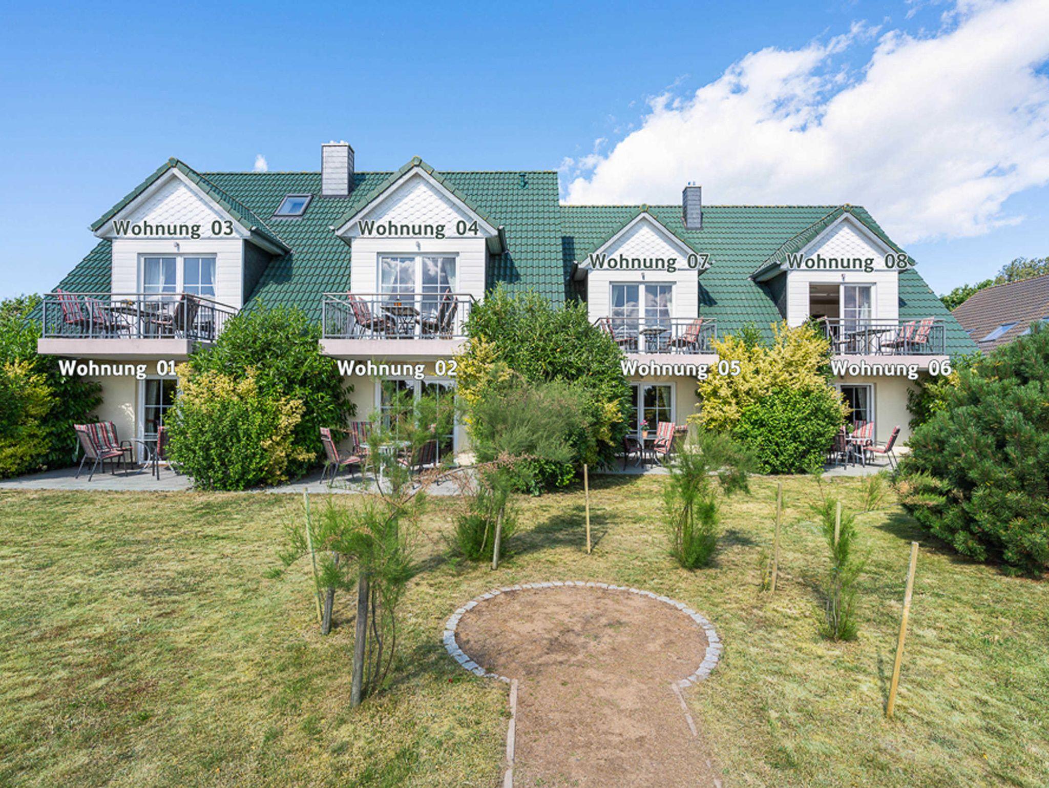 Die 2-Raum-Ferienwohnungen 01,02,05 und 06 befinden sich im Erdgeschoss und verfügen alle über eine Terrasse zum Garten.