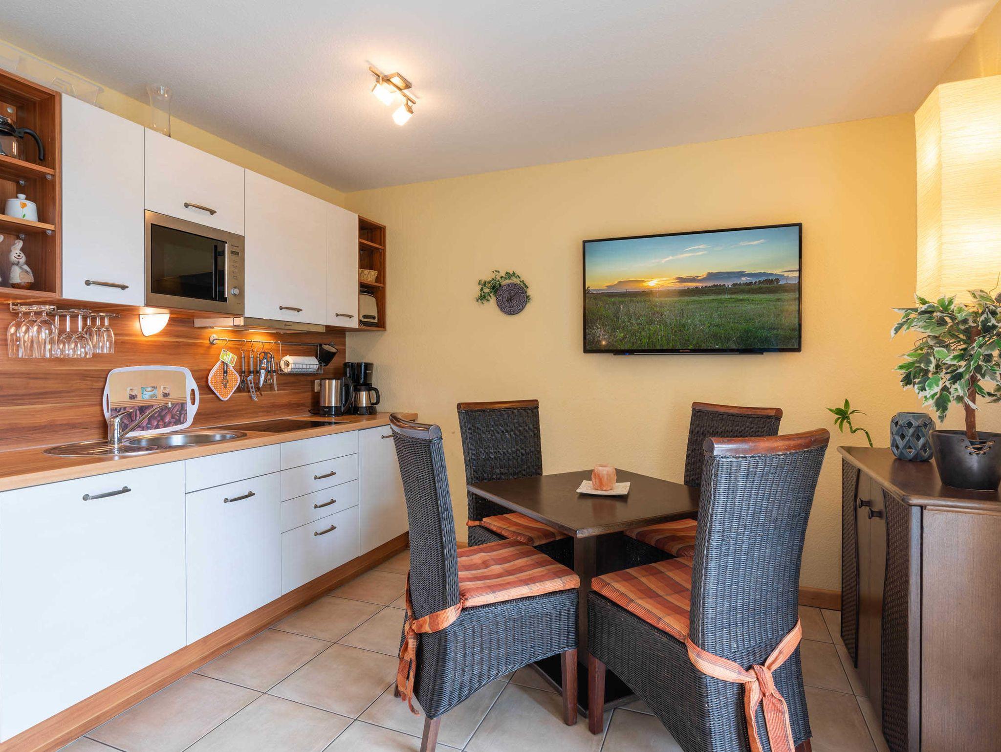 Die Wohnung ist sehr gemütlich mit Rattanmöbeln und Kaminofen eingerichtet, sowie mit reichlicher Küchenausstattung für Selbstversorger. Die Wohnung ist ohne Stufen erreichbar.