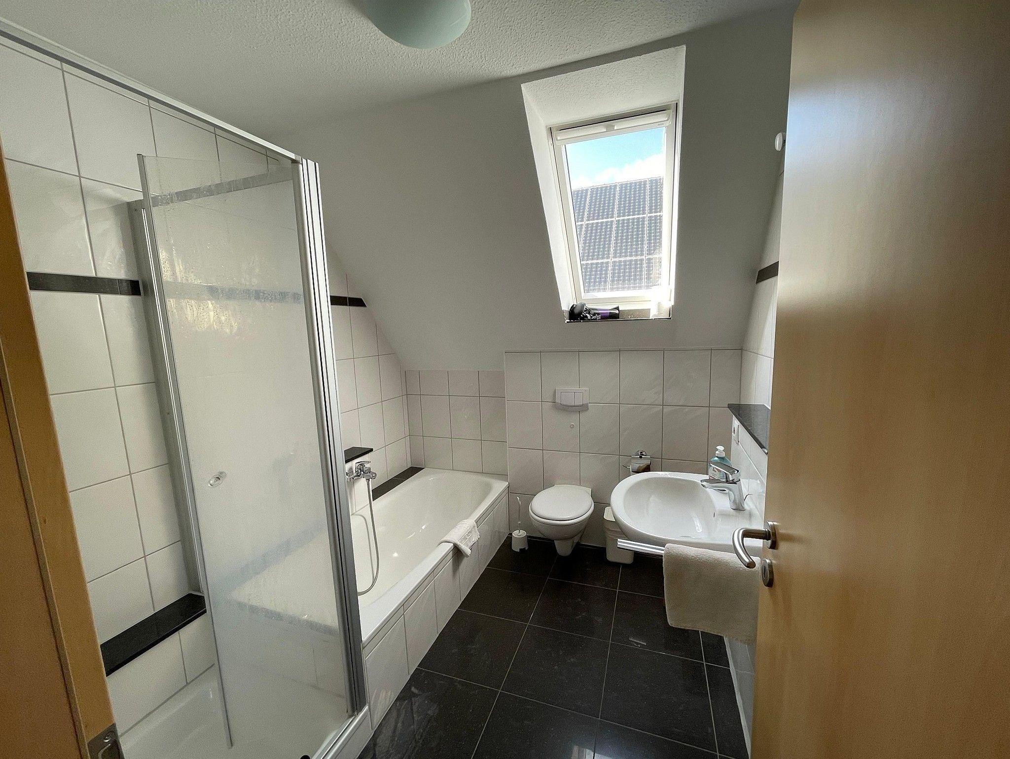 Direkt am Wohnzimmer ist der Balkon. Im Wohnzimmer befindet sich ein großes Sofa, eine Ess-Ecke sowie eine Pantryküche(mit Mikrowelle) . Das Bad ist mit Dusche und einem Handtuch-Heizkörper ausgestattet.