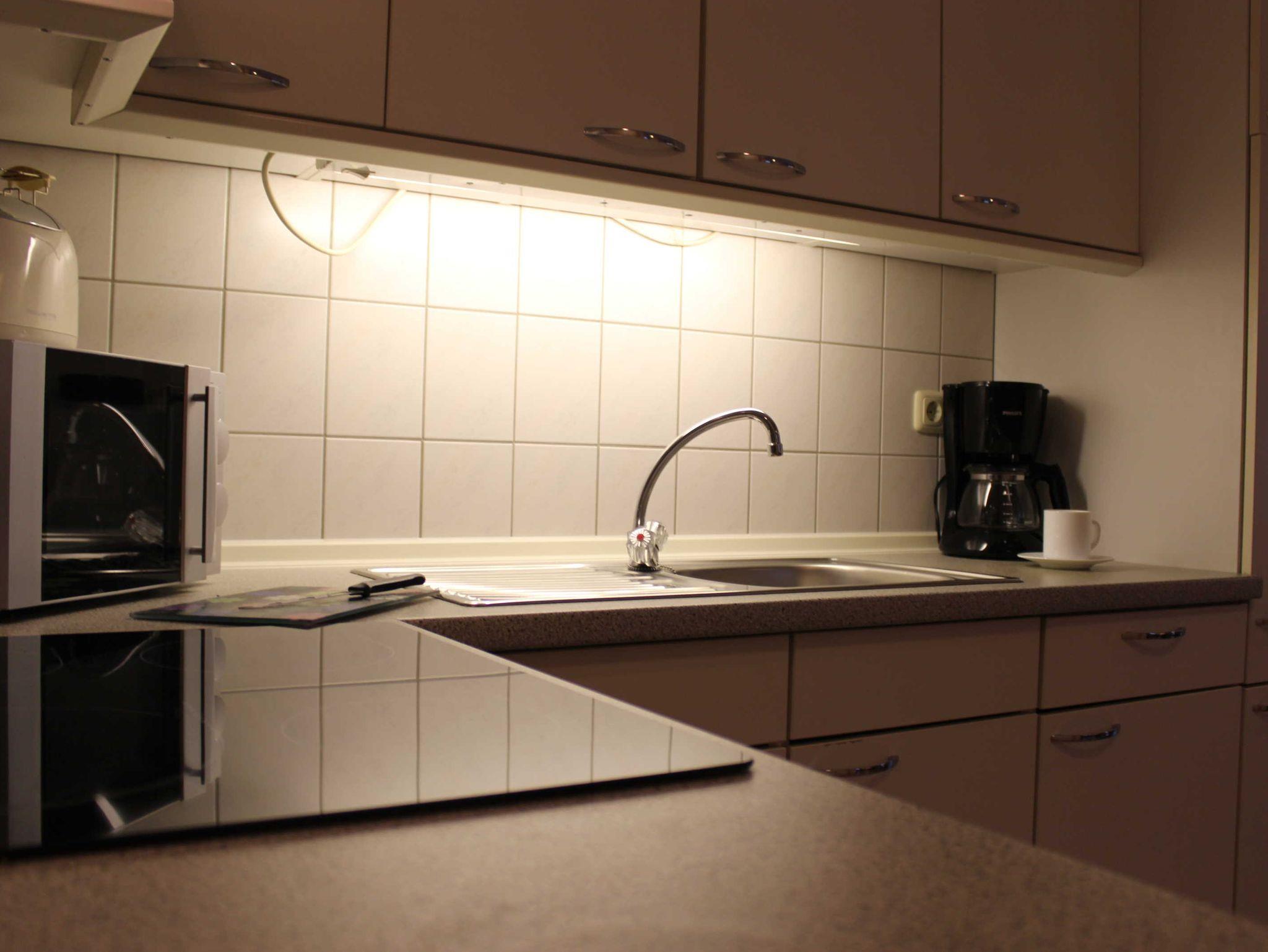 In dieser Ferienwohnung befindet sich ein Wohnbereich mit offener Küche. Vom Flur aus gelangen Sie in das Schlafzimmer mit Doppelbett und in das Badezimmer mit Dusche und WC.
