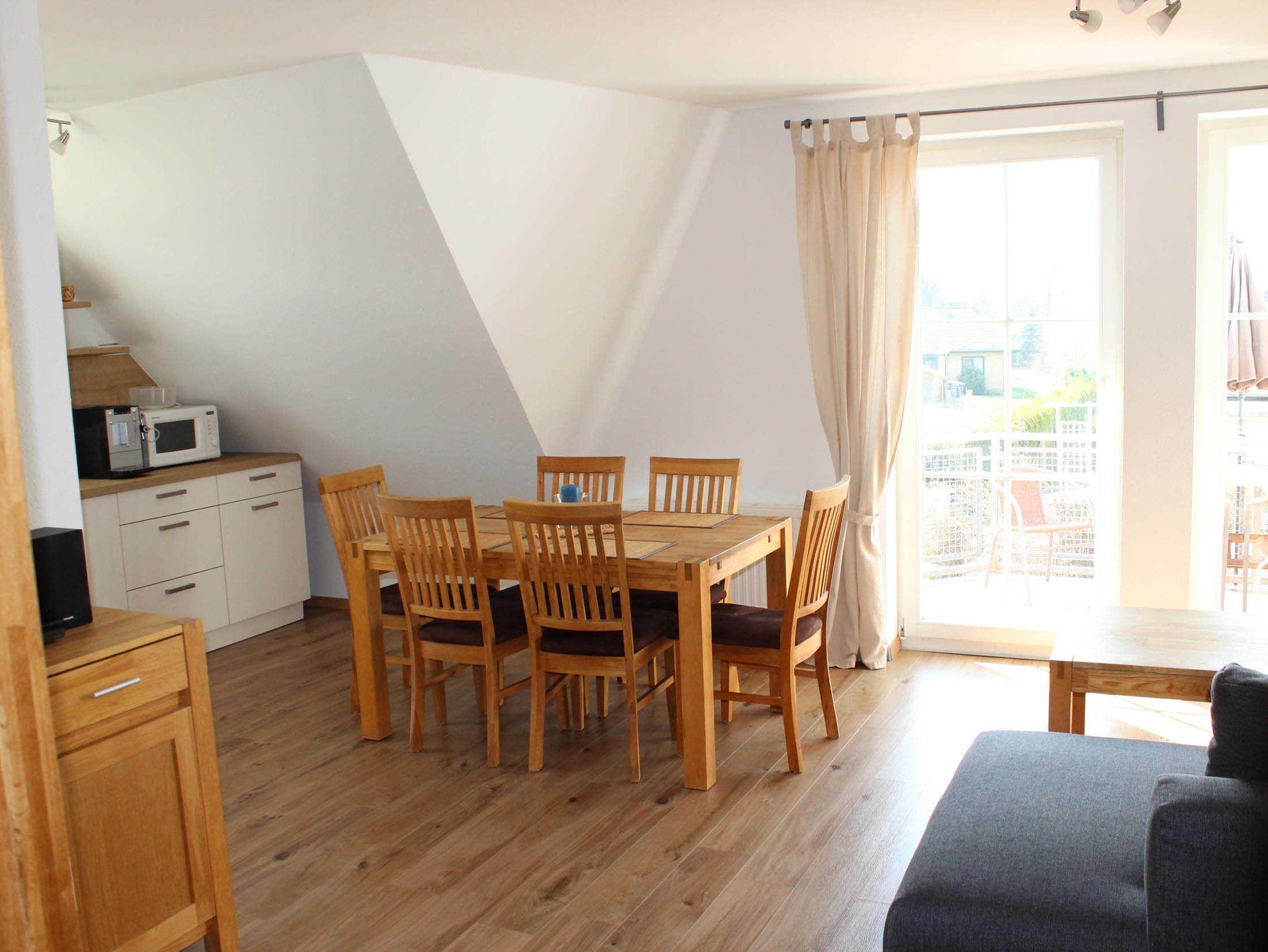 Diese 3-Raum-Maisonette-Wohnung befindet sich im 1.OBERGESCHOSS und verfügt über Balkon mit Sitzmöbeln und einem Tisch.