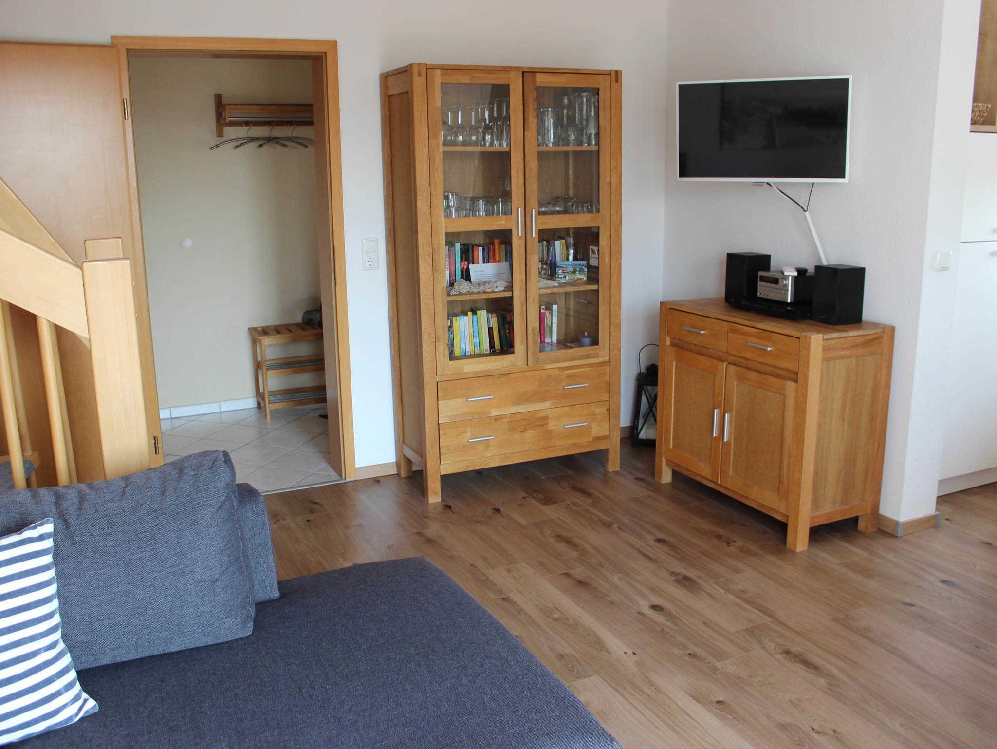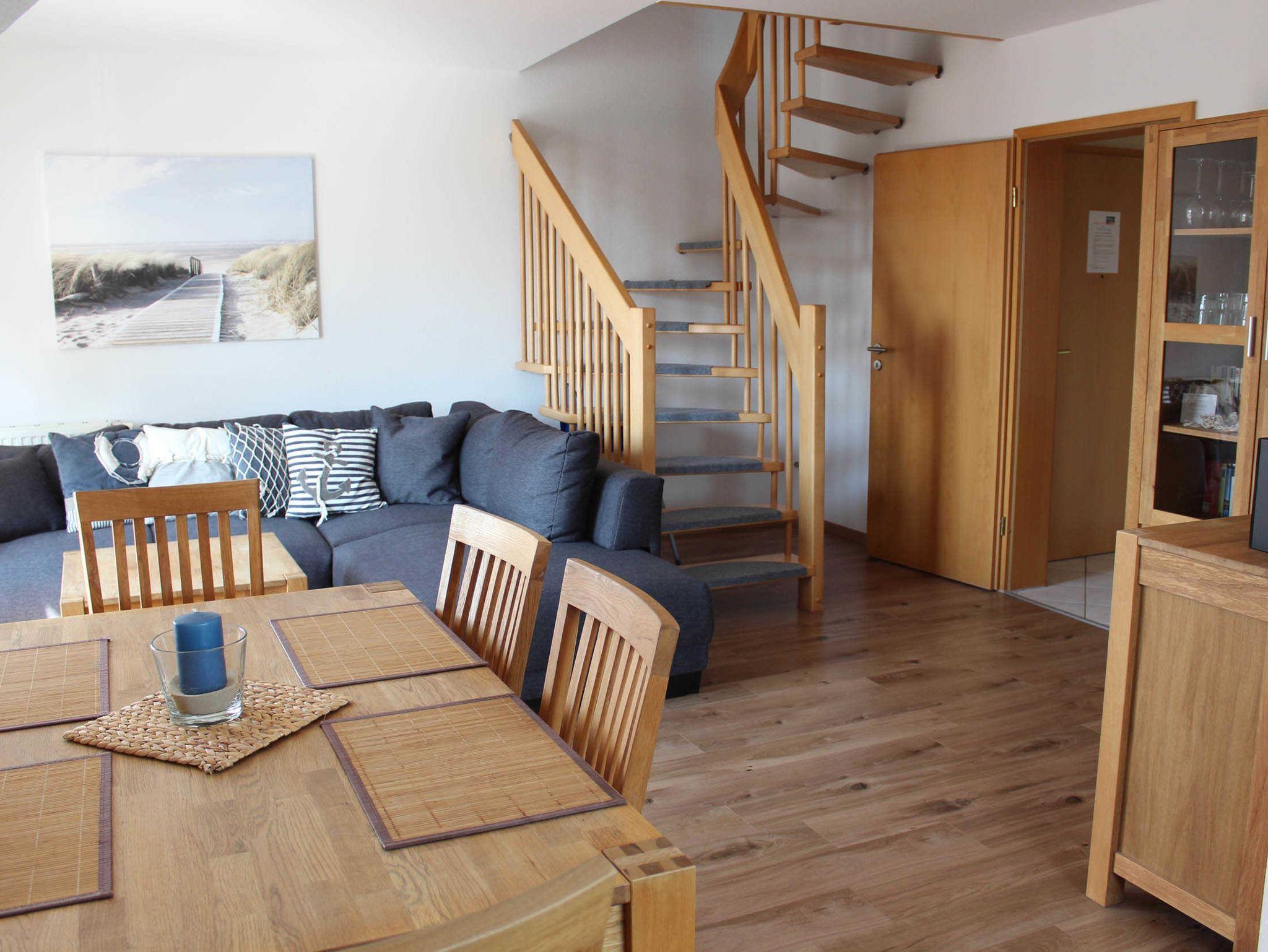 -1 Wohnzimmer mit Sitzgruppe und Schlafcouch, sowie Treppe ins Dachgeschoss