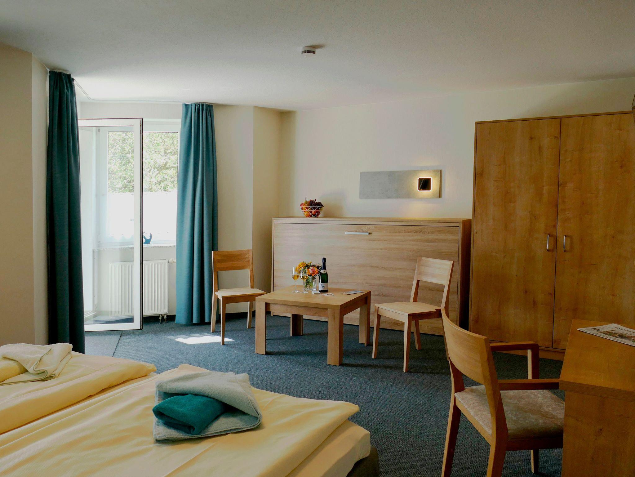 Alle Familienzimmer besitzen einen Balkon oder eine Terrasse mit Blick in den grünen Gästegarten. Auf den bequemen Sitzmöbeln des Südbalkons für bis zu drei Personen lässt sich die frische Luft und die ruhige Atmosphäre der Umgebung wunderbar genießen.