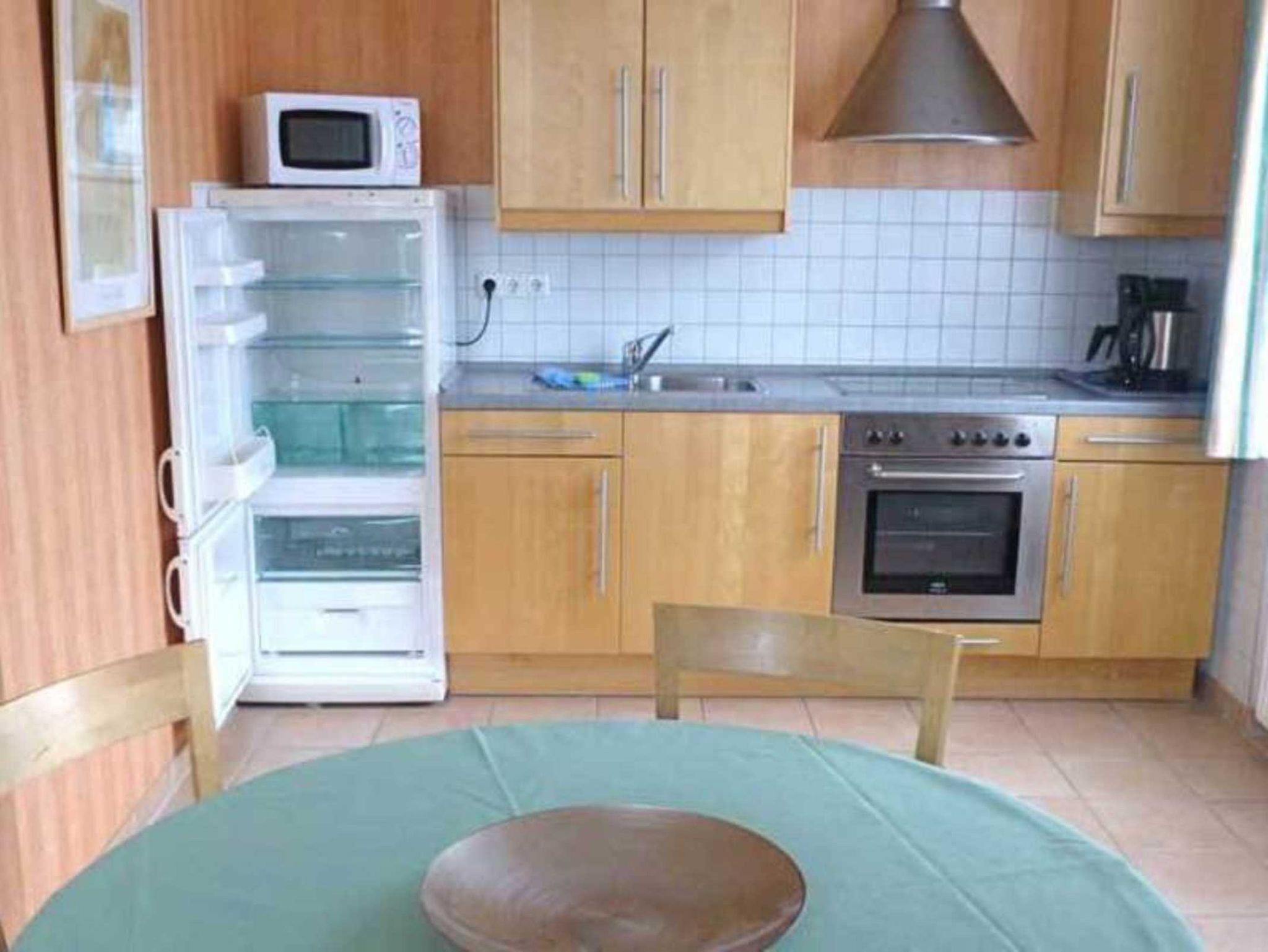 Der Essbereich bietet Platz für vier Personen. Die Küchenzeile ist mit Herd und Backofen und vielem mehr versehen.