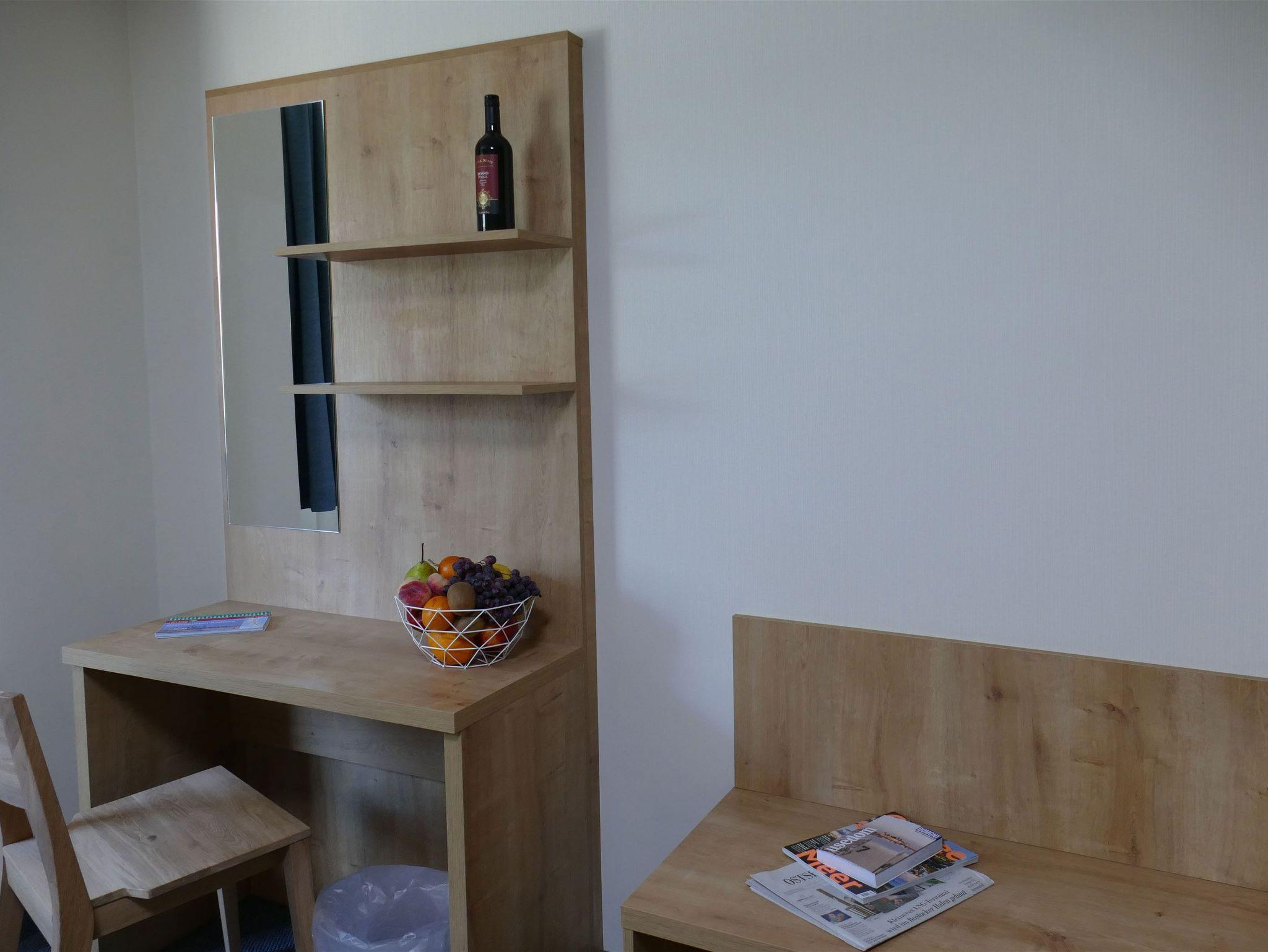 • Küchenblock mit Kühlschrank, Kaffeemaschine, Wasserkocher, Geschirr und Besteck u.v.m.; keine Kochmöglichkeit