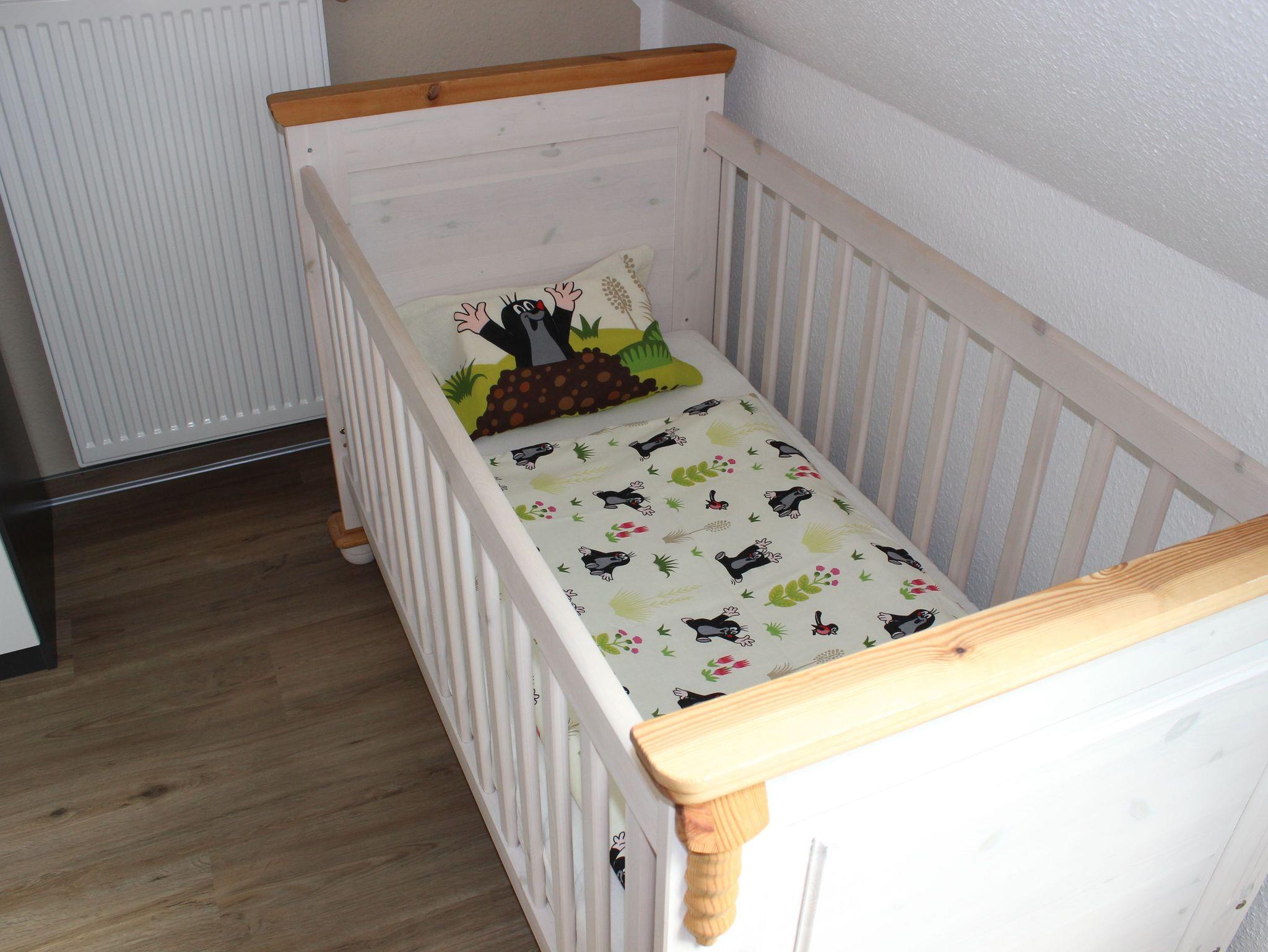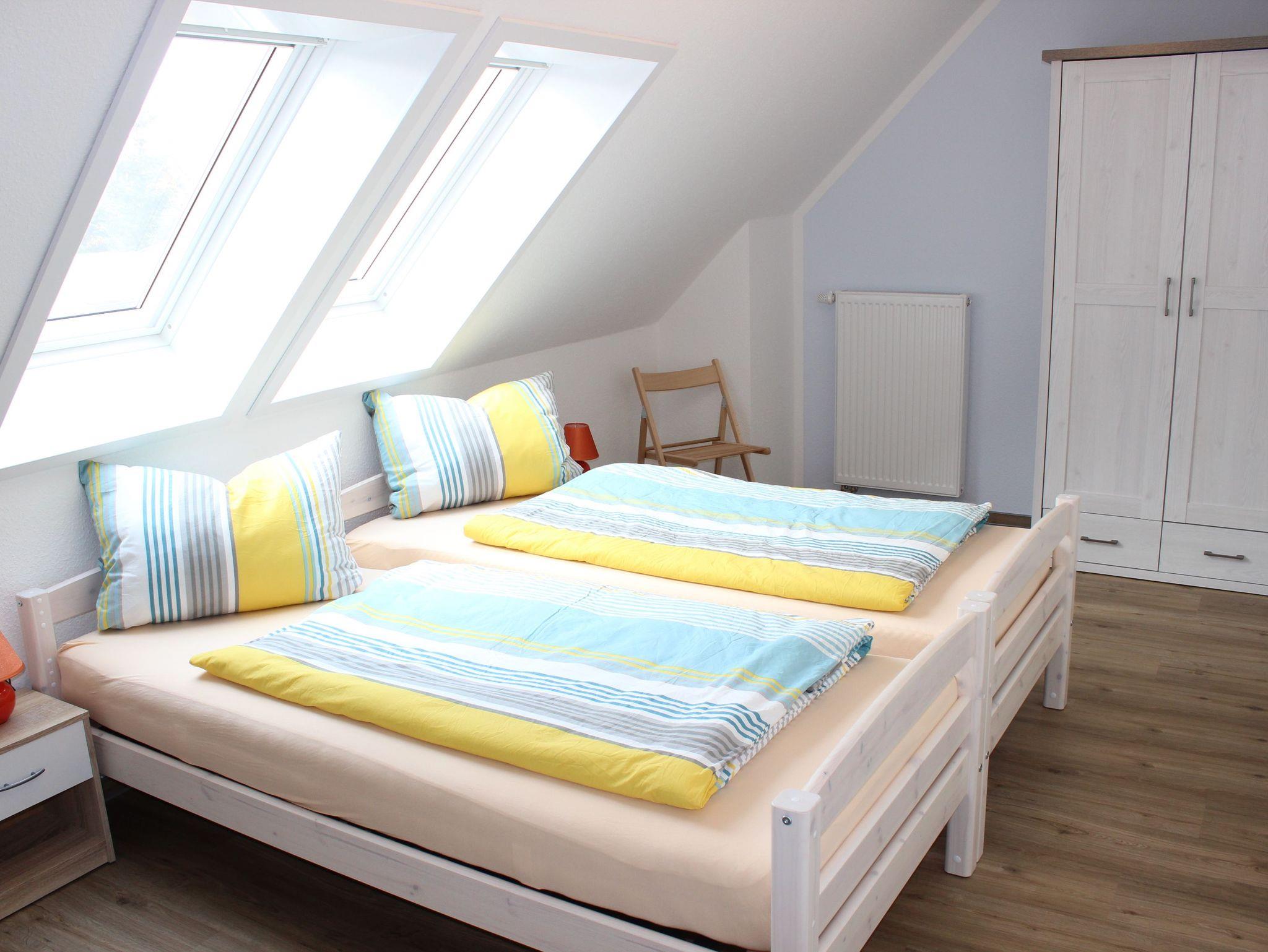 Gegenüber vom Bad führt eine Treppe ins Obergeschoss, wo die beiden Schlafräume liegen. Im größeren befindet sich ein Doppelbett sowie ein fest installiertes Gitterbett für Ihren Nachwuchs; nebenan stehen zwei Einzelbetten. Die Betten beziehen wir für Sie, fühlen Sie sich bei Anreise einfach zuhause! In beiden Zimmern gibt es Kleiderschränke mit verschiedenen Abteilen, sodass Ihnen genügend Stauraum für die Unterbringung von Lieblingskleidern und persönlichen Gegenständen zur Verfügung steht. Fenster durchbrechen die Dachschrägen - so fungiert der Usedomer Sternenhimmel als natürliches Nachtlicht!