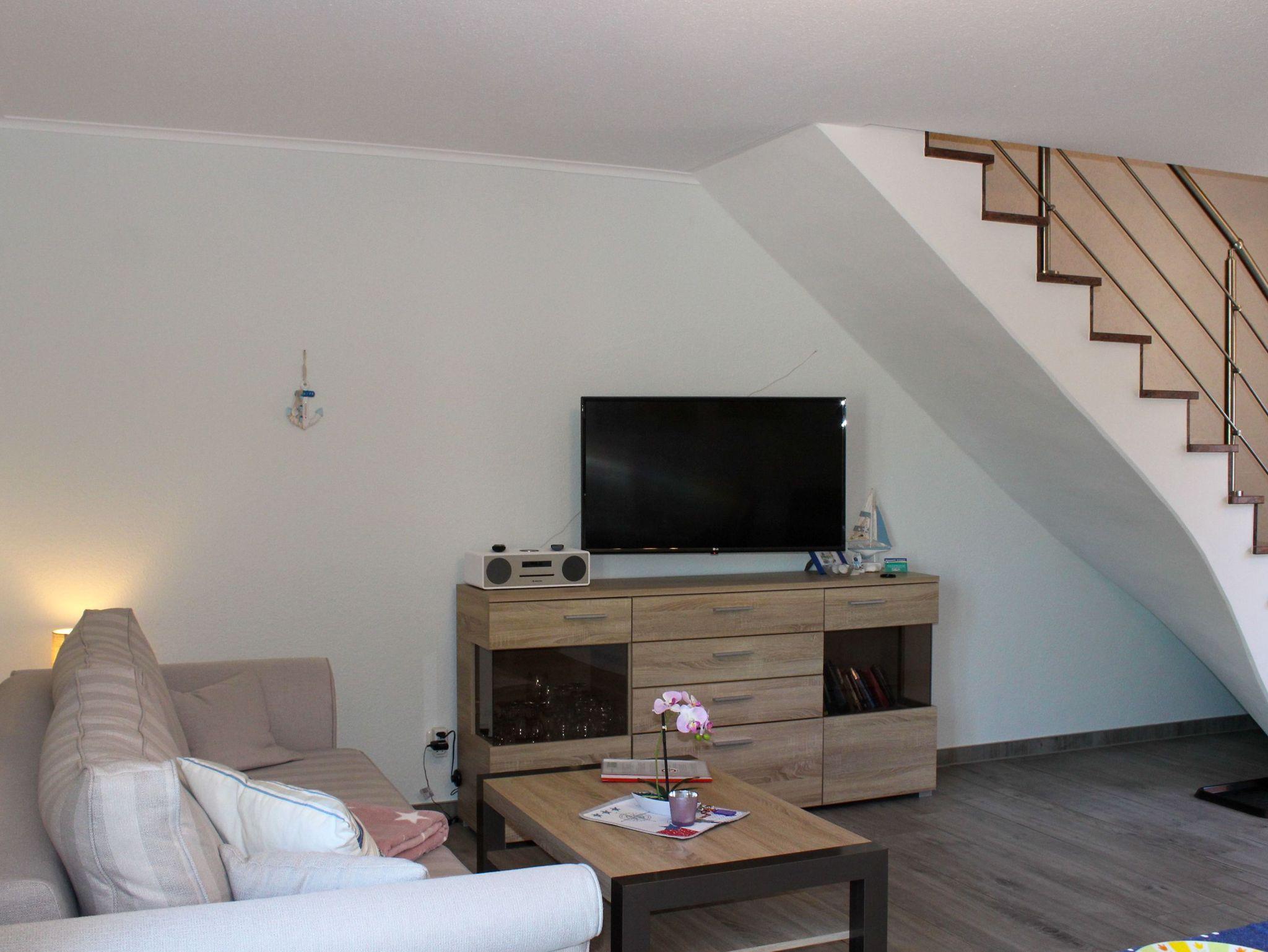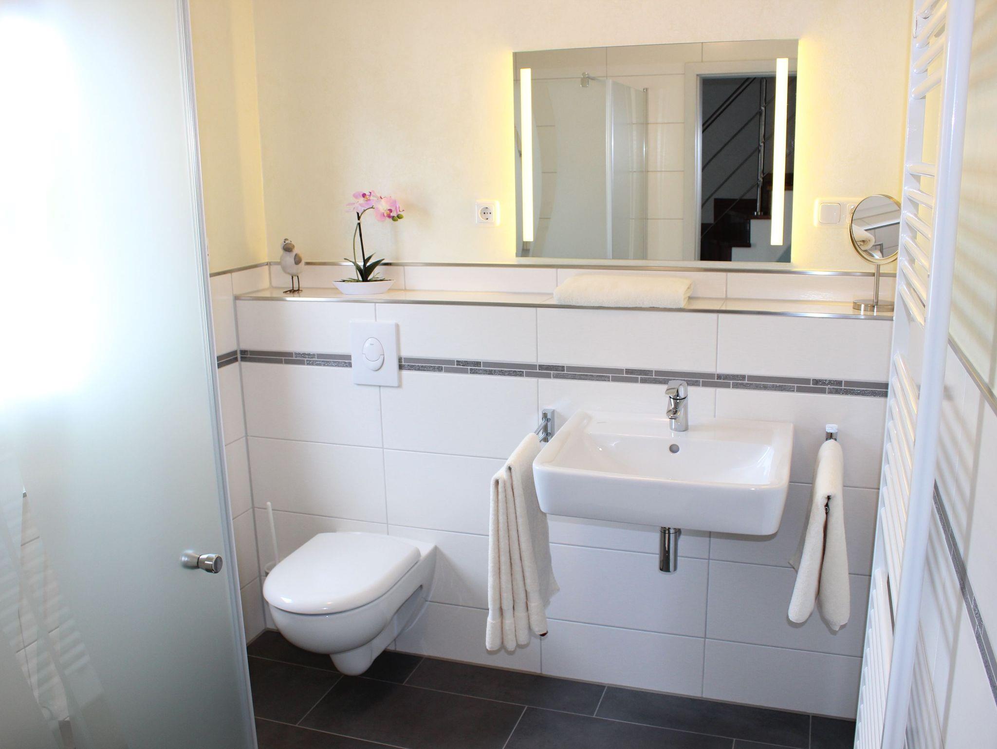 Am Esstisch bieten hochwertige Polsterstühle besonderen Sitzkomfort beim Genießen Ihrer Mahlzeit, Planungsrunden für den nächsten Urlaubstag oder einer Partie Mensch-ärgere-Dich-nicht. Den Wohnbereich komplettiert eine modern-behagliche Sitzgruppe. Hier haben Sie Zugang zu Medien wie LED-Fernseher mit Sat-Empfang, Radio und Wlan. Die Couch ist ausziehbar und kann als Aufbettung für eine Person genutzt werden. Ebenfalls im Erdgeschoss befindet sich das schicke Badezimmer mit Dusche, WC und Fußbodenheizung.