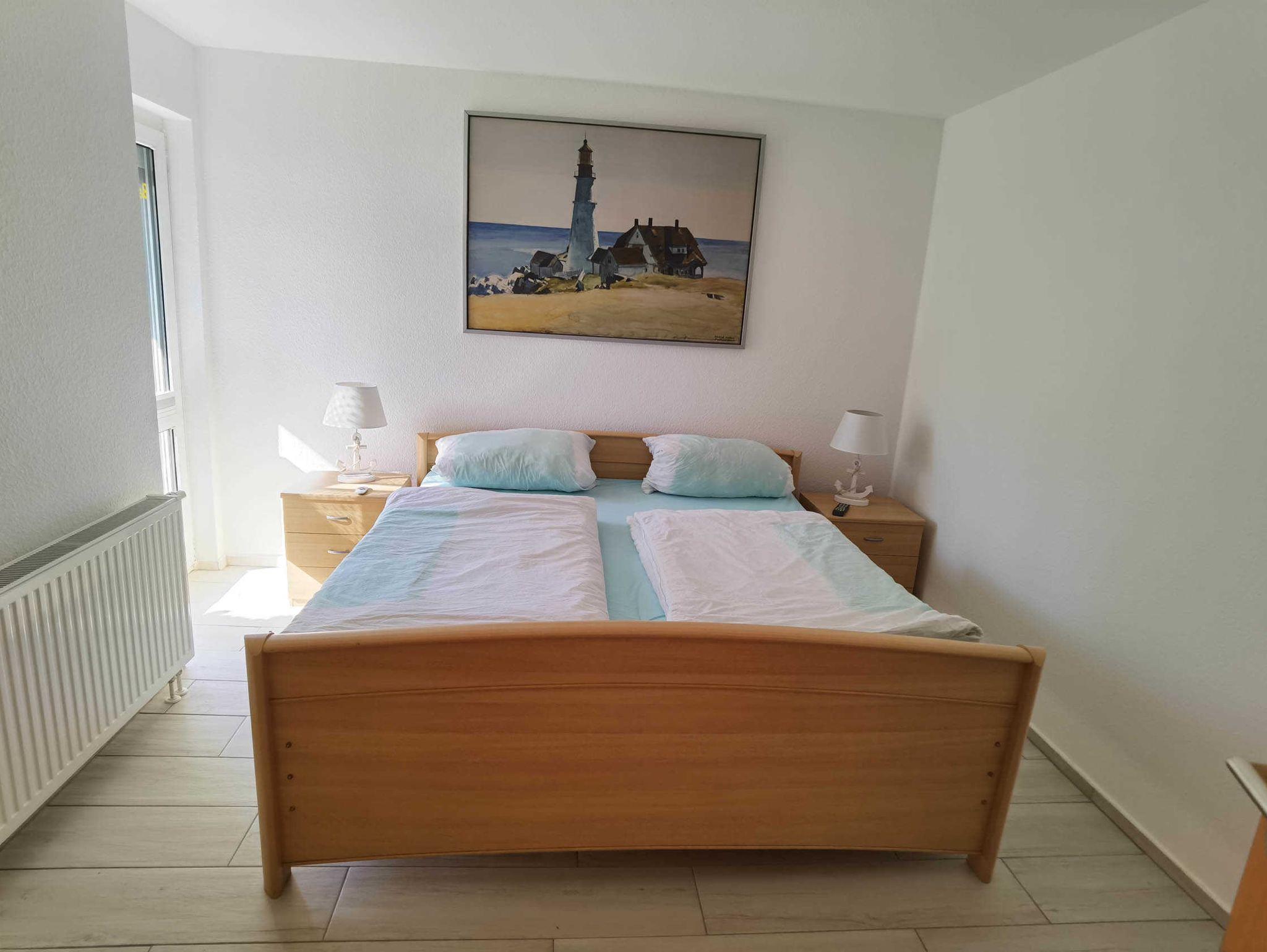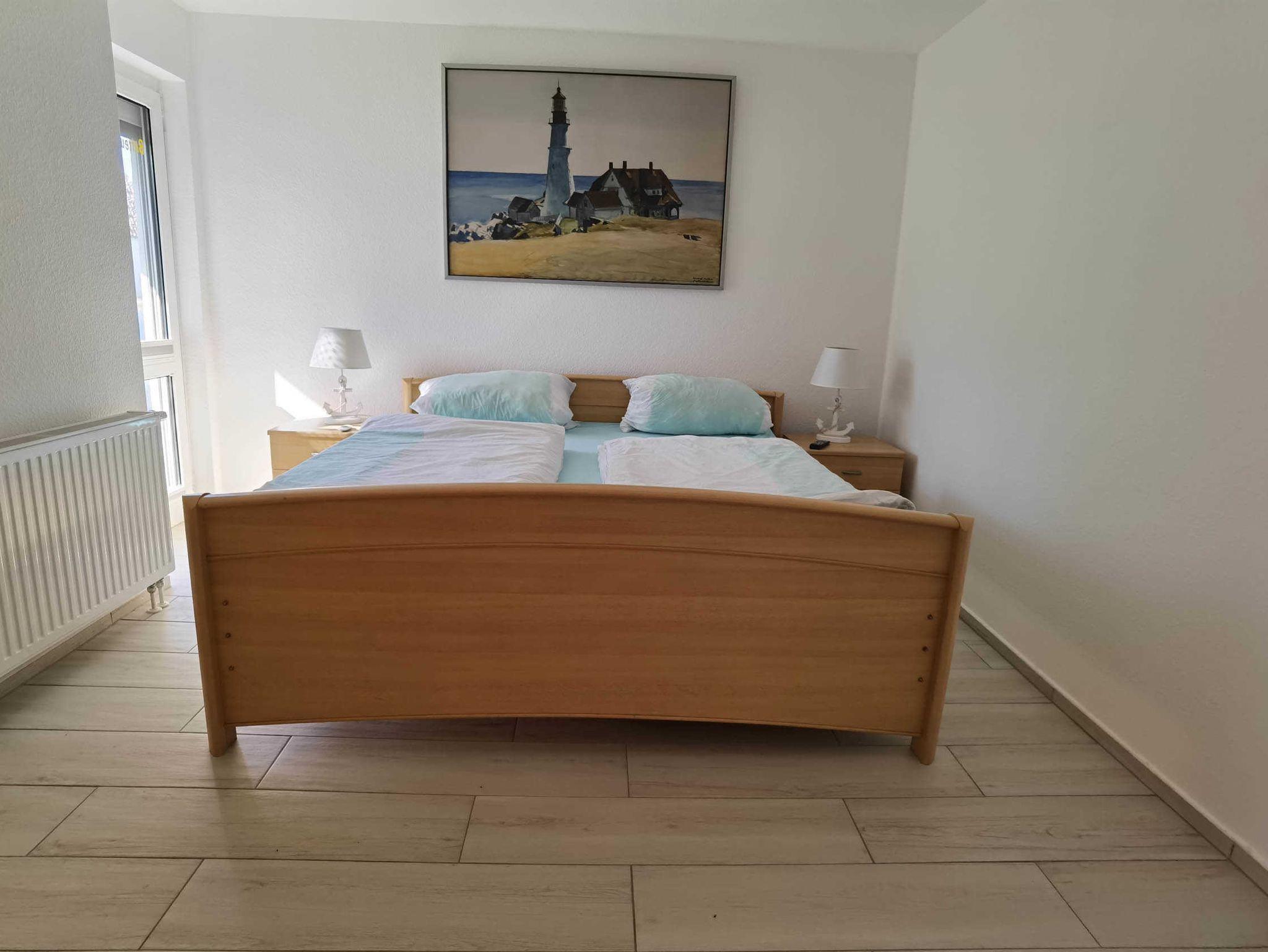Die Ferienwohnung Strandgold ist eine 2-Raum-Wohnung mit einem Schlafzimmer, welches mit einem Doppelbett (2 x 90 x 200 cm) und einem zweiten Fernsehgerät ausgestattet ist. Darüber hinaus ist im Schlafzimmer genügend Platz für ein Baby, welches noch im Babybett schläft.