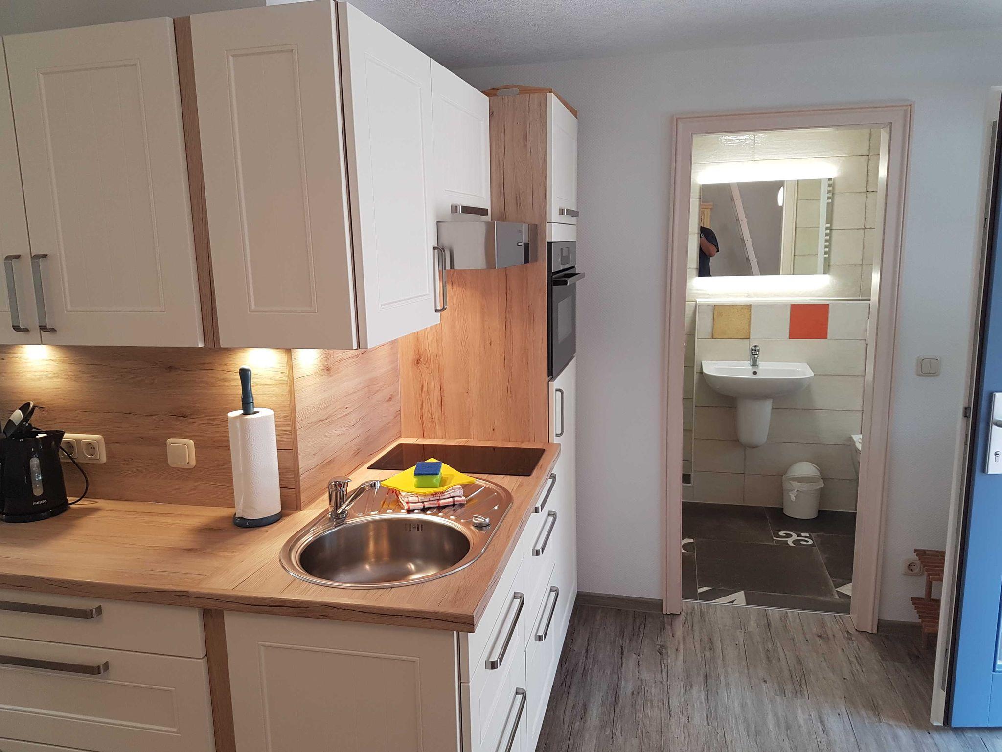 Die OG-Fewo besteht aus Wohn-, Schlaf- und Küchenbereich,Bad sowie einem geräumigen Schlafboden.Zum Wohnbereich gehören Couch, - tisch, Radio/TV. Zum Küchenbereich Winkelküche mit u.a.Herd incl.Backofen,Kühlschrank mit Gefrierfach, Essecke, Geschirr. Der Schlafbereich ist durch kleinen Raumteiler vom Wohnbereich getrennt u. besteht aus Doppelbett, Schrank u.Leiter zum Schlafboden. Auf dem Schlafboden gibt es ein Doppelbett. Es gibt eingeräumiges Bad mit Dusche, WC, Waschtisch, Fön. Zur Fewo gehören Terrasse, Holzkohlegrill, Parkplatz.