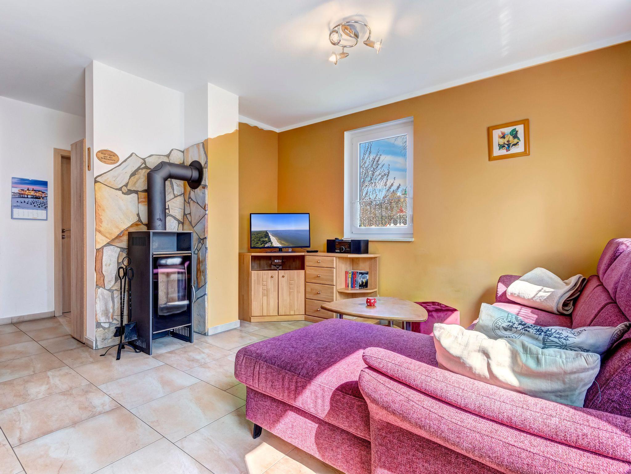 Das Wohnzimmer ist mit einer gemütlichen Schlafcouch, einem Kaminofen und einem Flachbildfernseher ausgestattet.