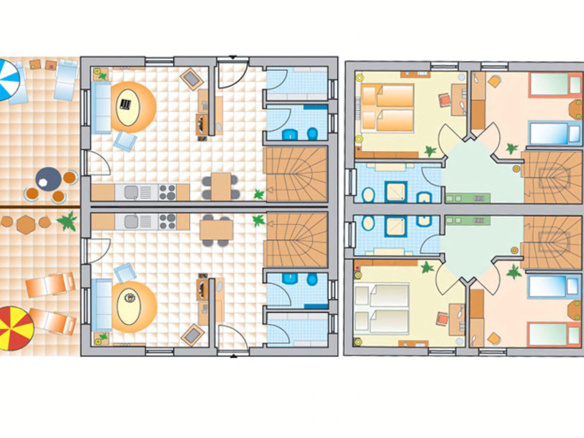 Das Ferienhaus besteht aus 2 auch separat nutzbaren Doppelhaushälften mit je 62qm Wohnfläche und 2 getrennten Eingängen, die sich jeweils über 2 Etagen erstrecken. Das Haus ist für 8 Personen, zzgl. 2 Kleinkinder bis 2 Jahre ideal geeignet. Durch die Aufbettungen in den Wohnzimmern, kann die Belegung auf 12 Erwachsene und 2 Kleinkinder erweitert werden.