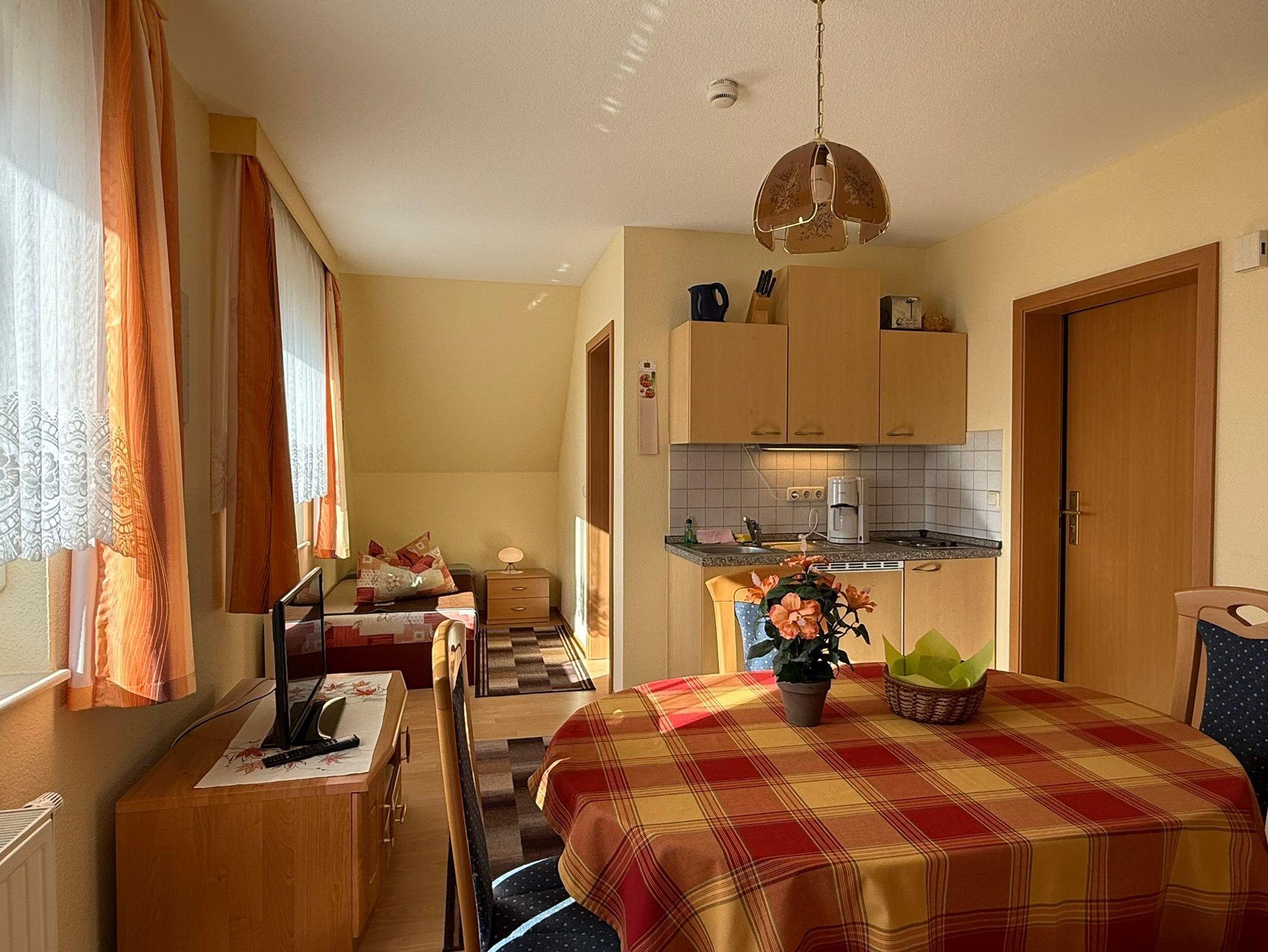 Wohnfläche 33 m², kombinierter Wohn-/ Schlafraum mit Küchenzeile, Farb-TV, Radio (SAT-Anlage), Doppelbett, Aufbettung möglich ( telefon.Anfrage erforderlich ), Bad mit Dusche und WC, Stellplätze für PKW und Fahrräder auf dem Grundstück des Einfamilienhauses mit Ferienwohnungen.