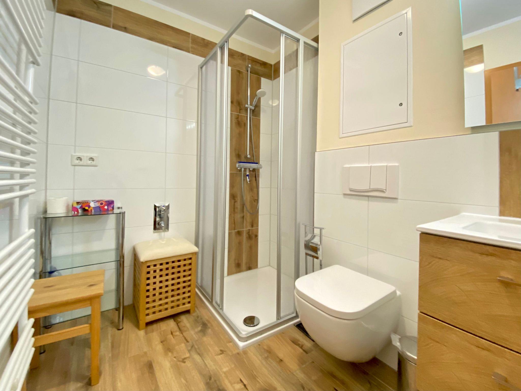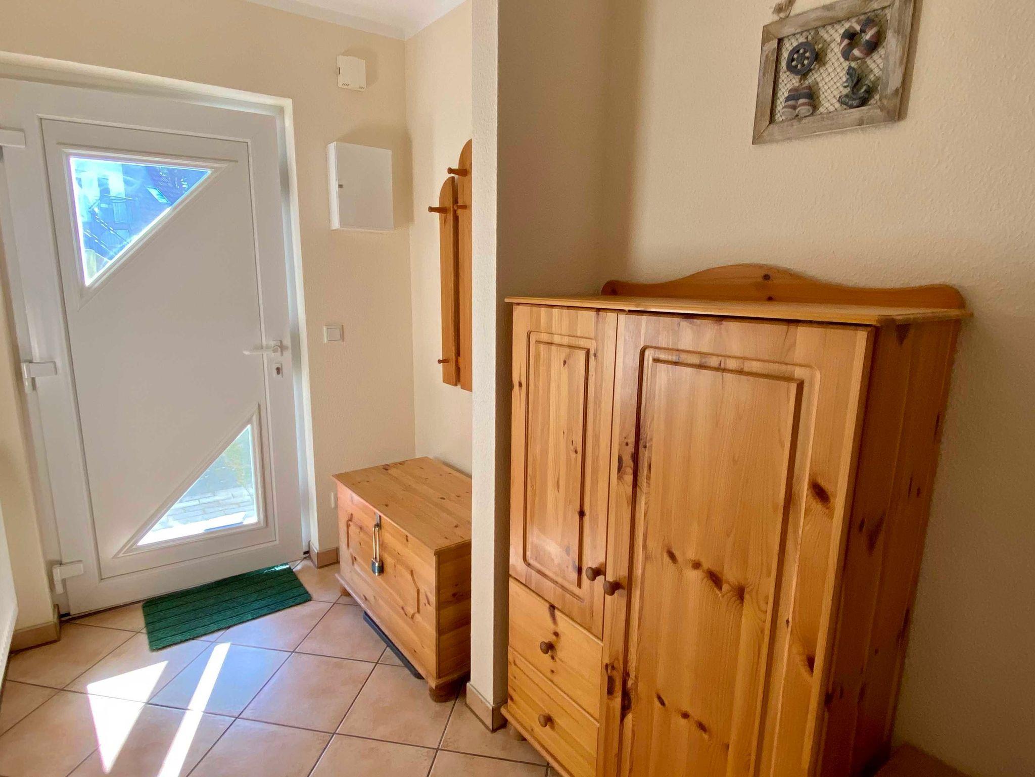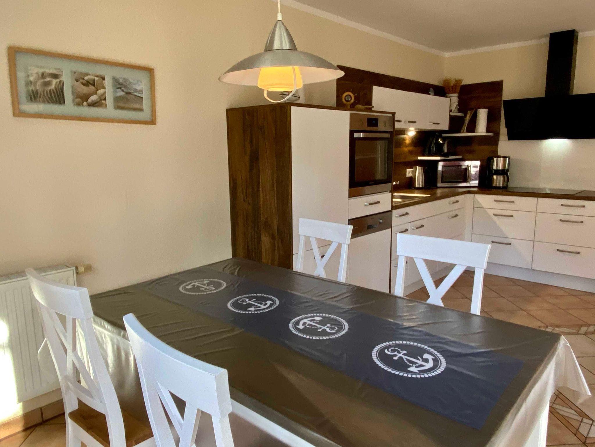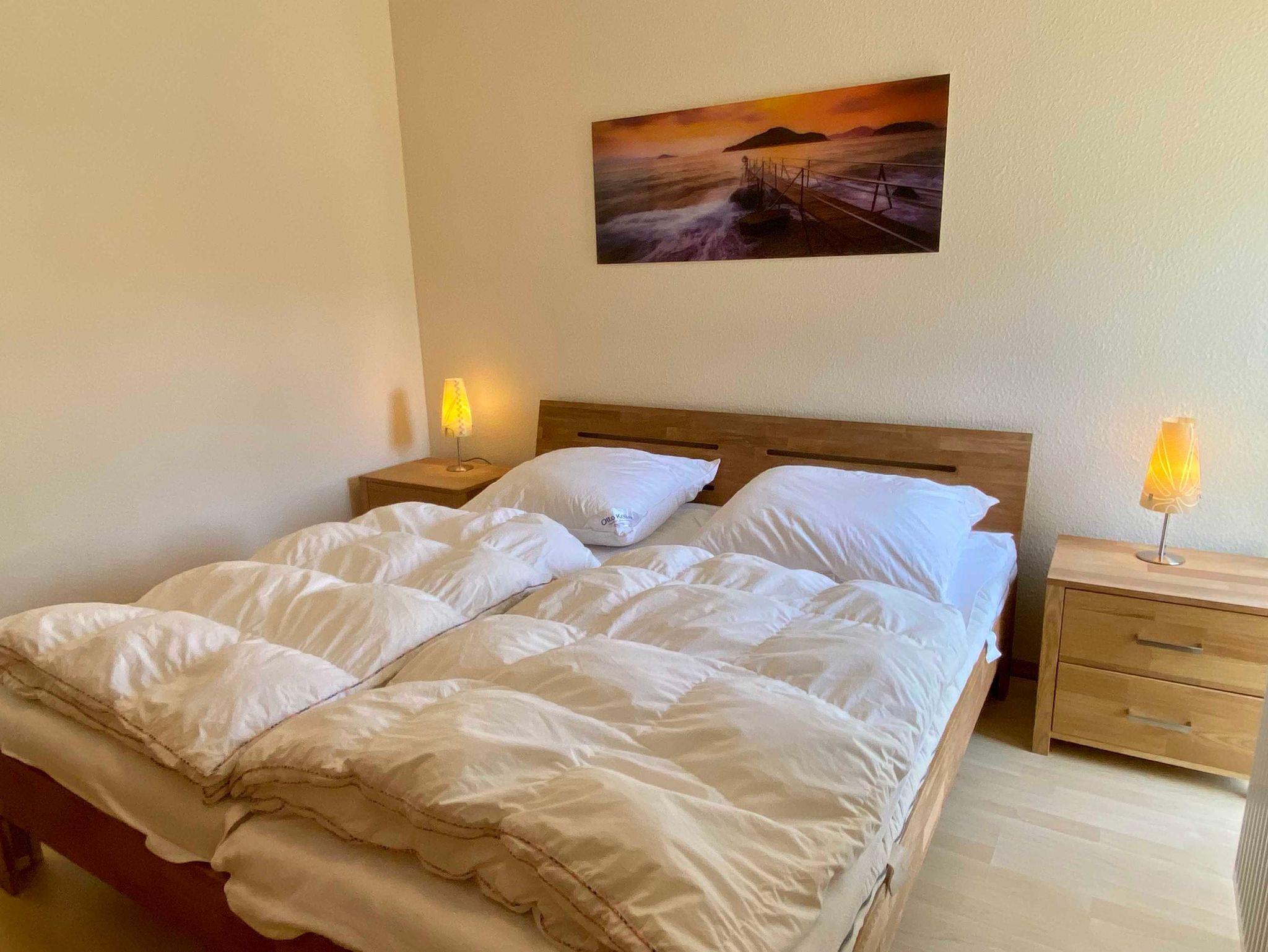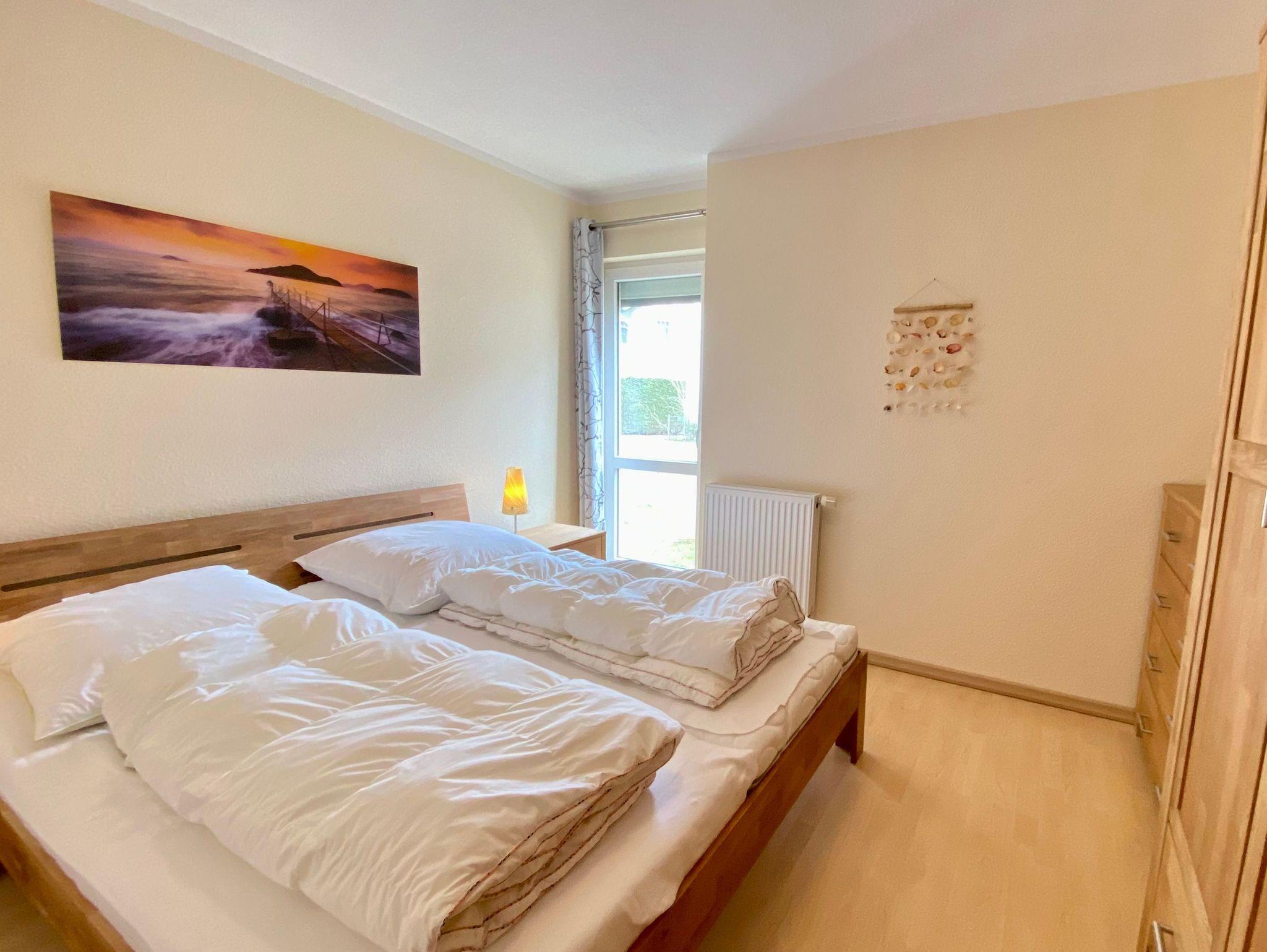 Die Ferienwohnung hat ein Schlafzimmer mit Doppelbett sowie ein Zimmer mit Etagenbett. Zur Wohnung gehört ein Badezimmer mit Dusche. Die Ferienwohnung ist mit pflegleichtem Laminat ausgelegt. Zur Wohnung gehört eine schöne Terrasse sowie ein Stellplatz und Fahrradschuppen.