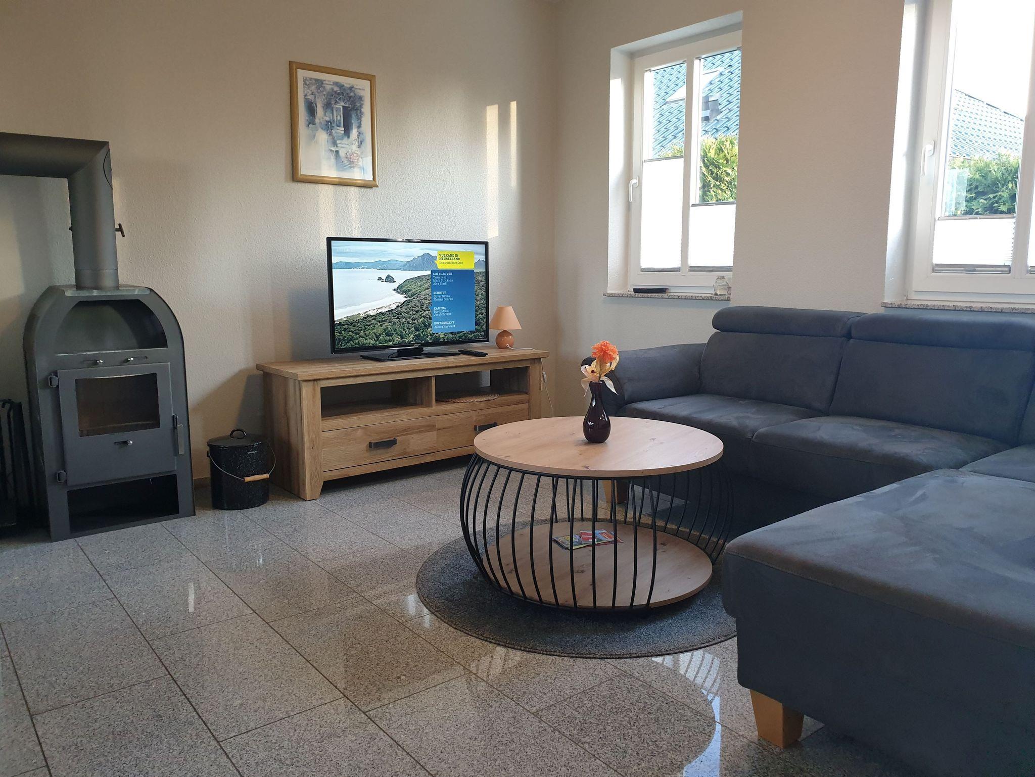 Gemütlicher Wohnbereich mit Kaminofen & Flachbild-TV,