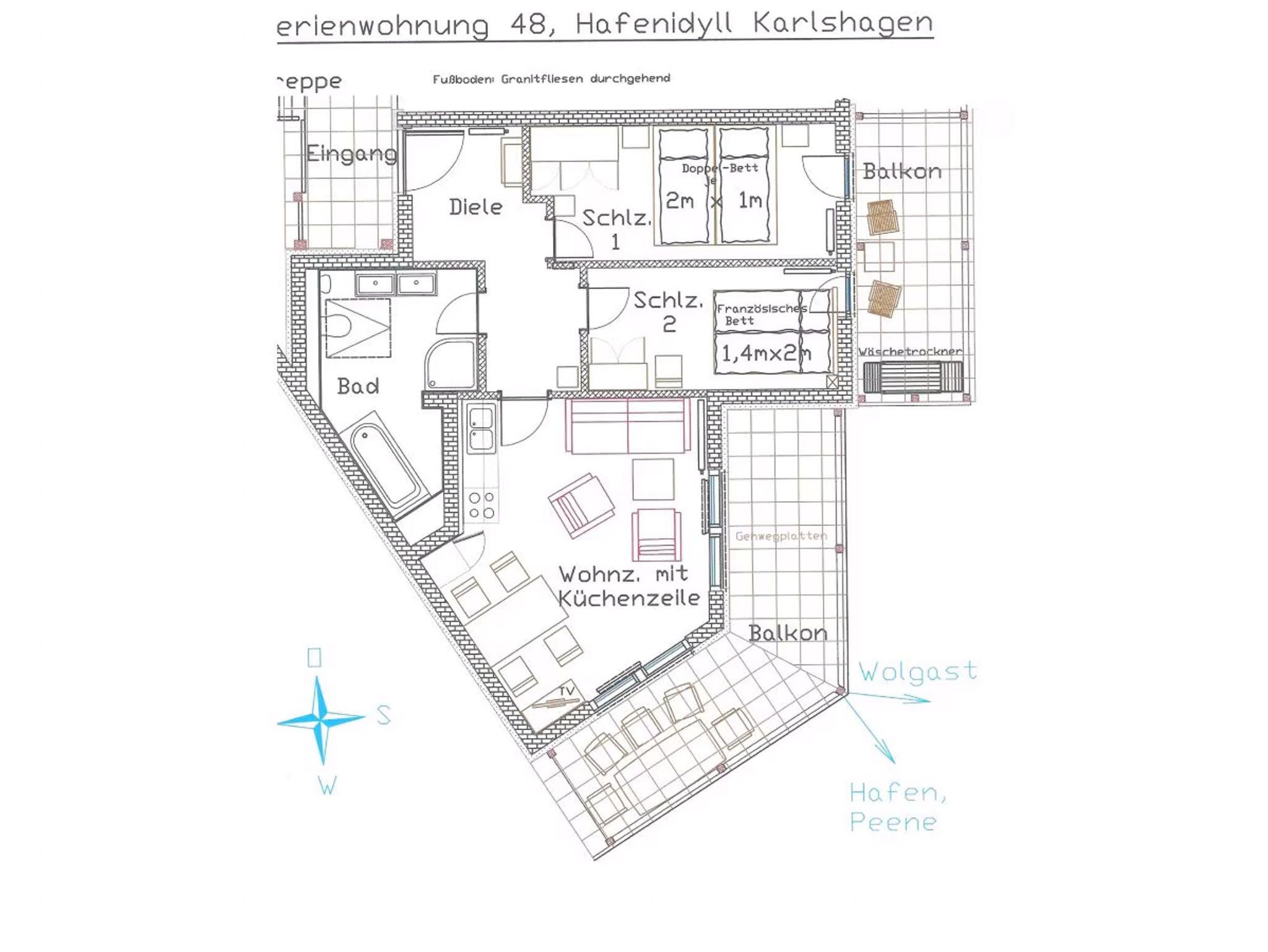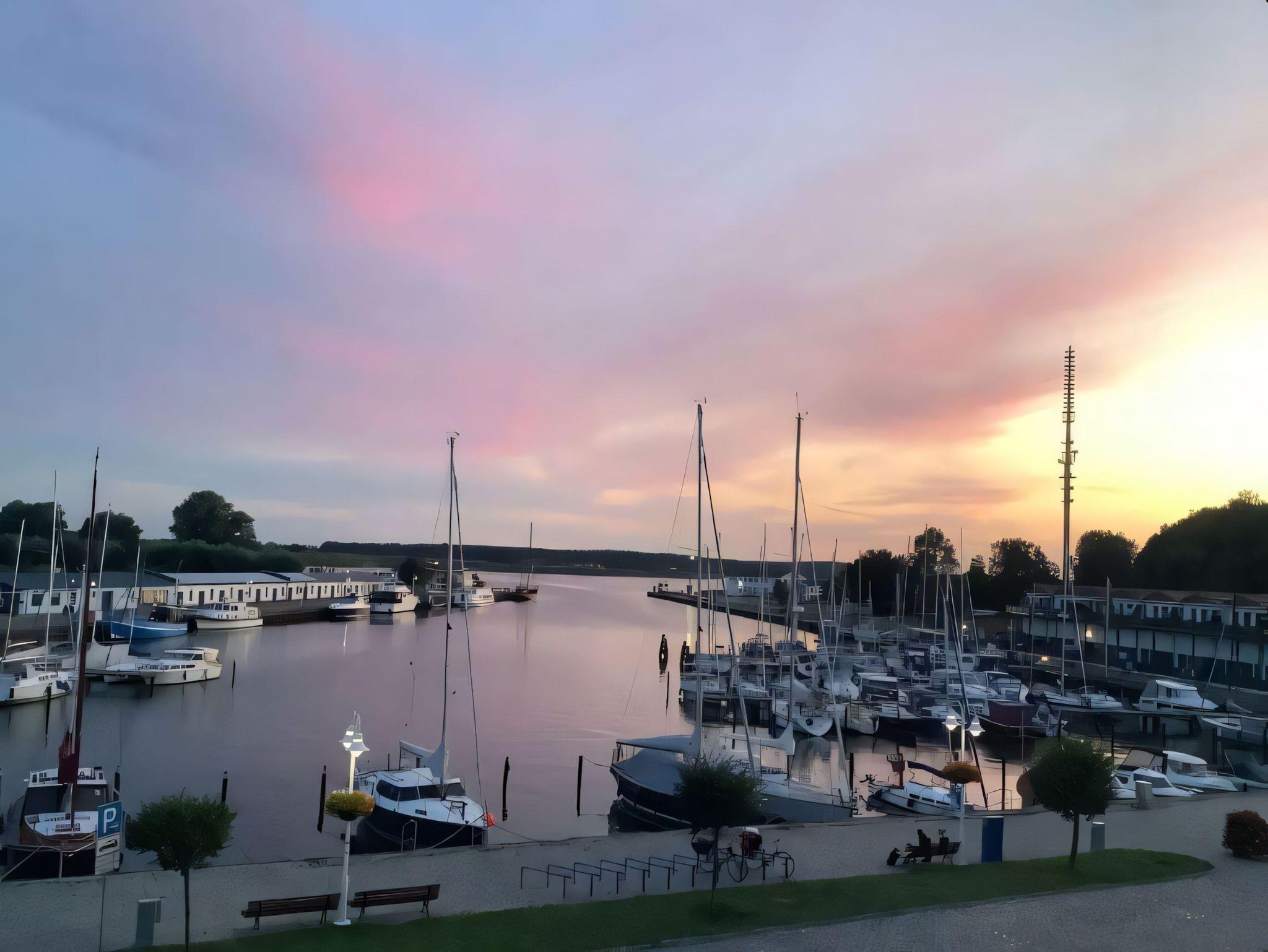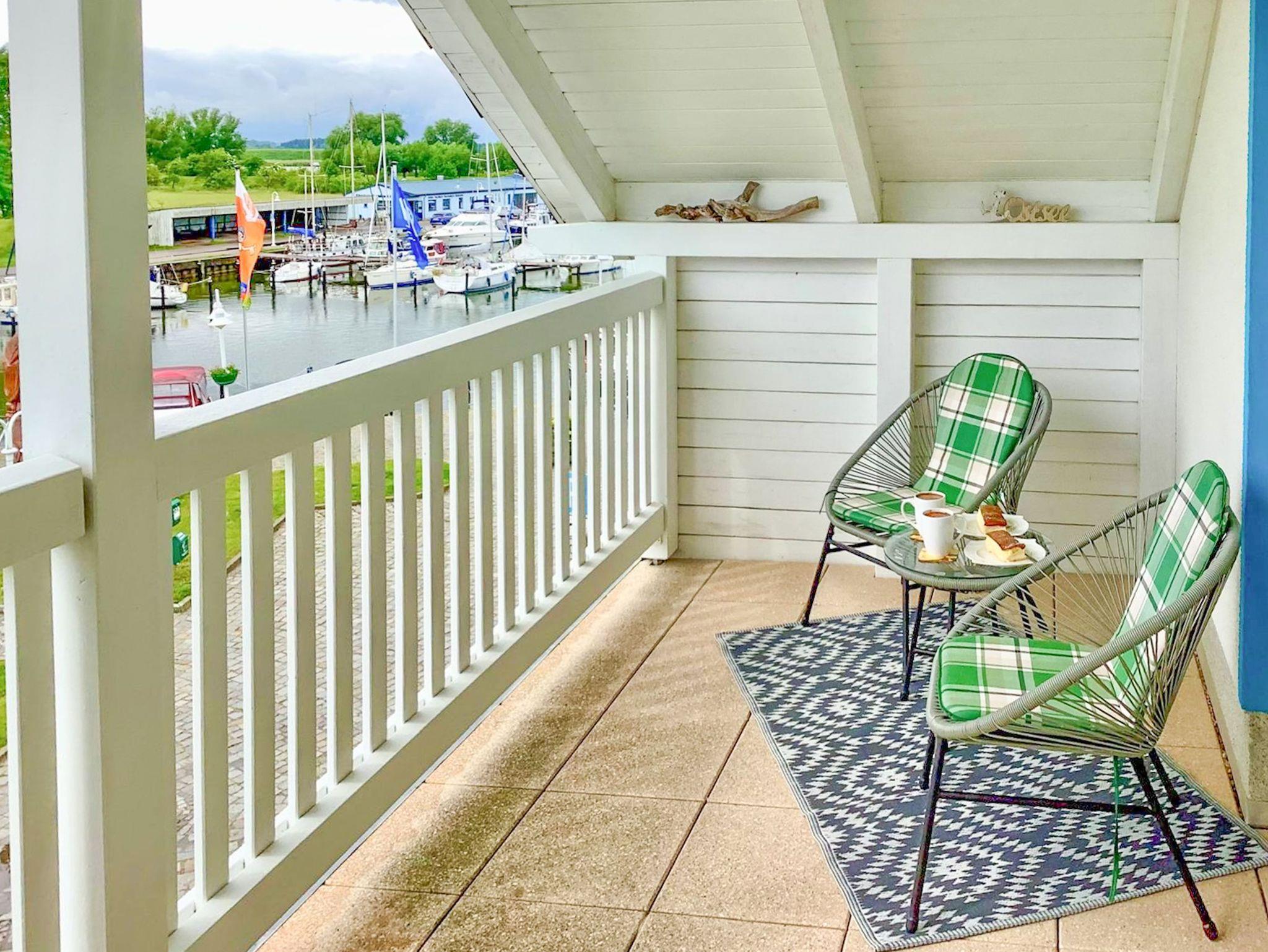 Sie haben zwei Balkone (Süd- und Westrichtung), auf denen Sie sowohl einen einzigartigen Blick auf die Peenewiesen sowie den Sonnenuntergang über dem Yachthafen genießen können.