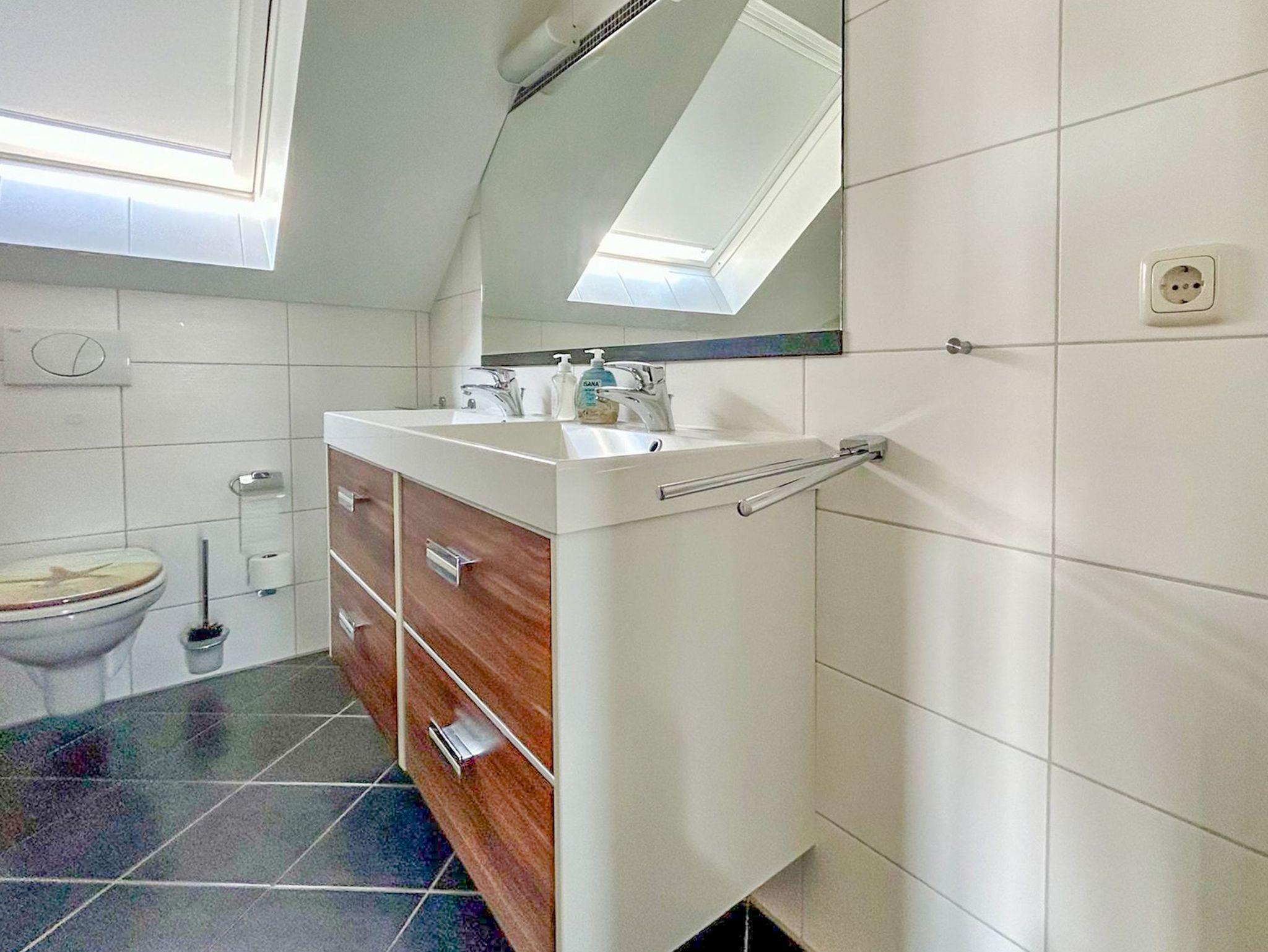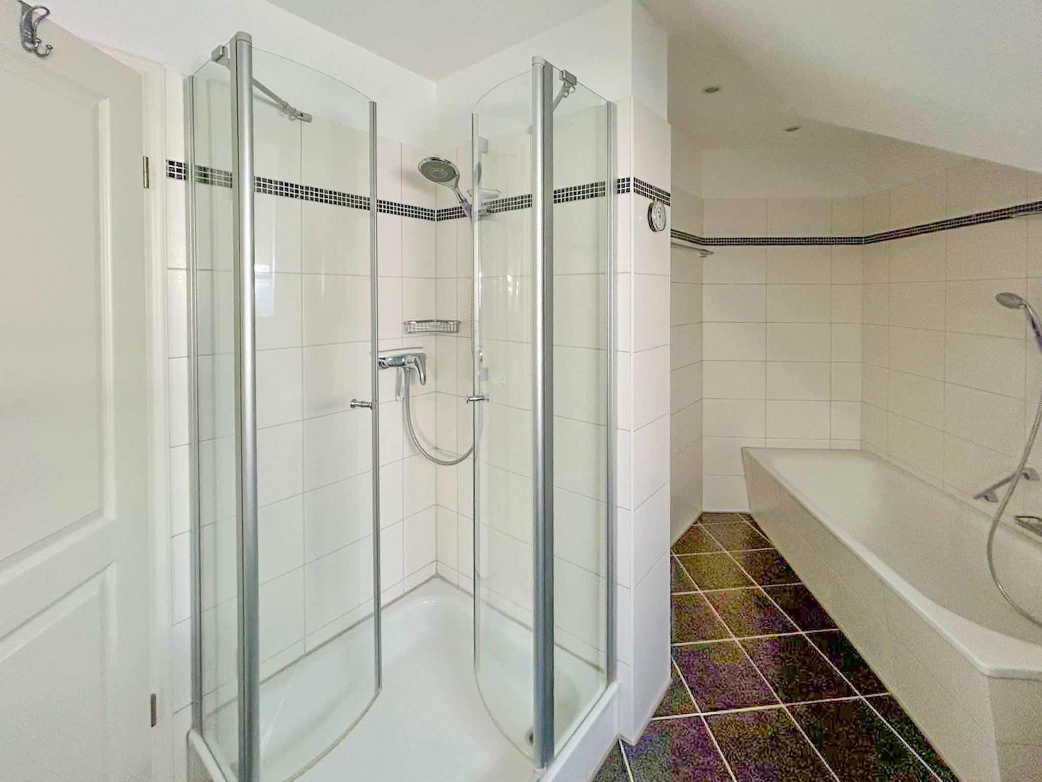 Im Badezimmer befinden sich Dusche, Badewanne, ein Doppelwaschtisch sowie ein WC.