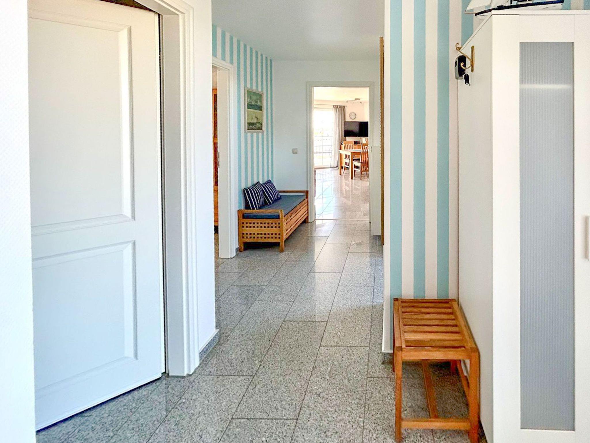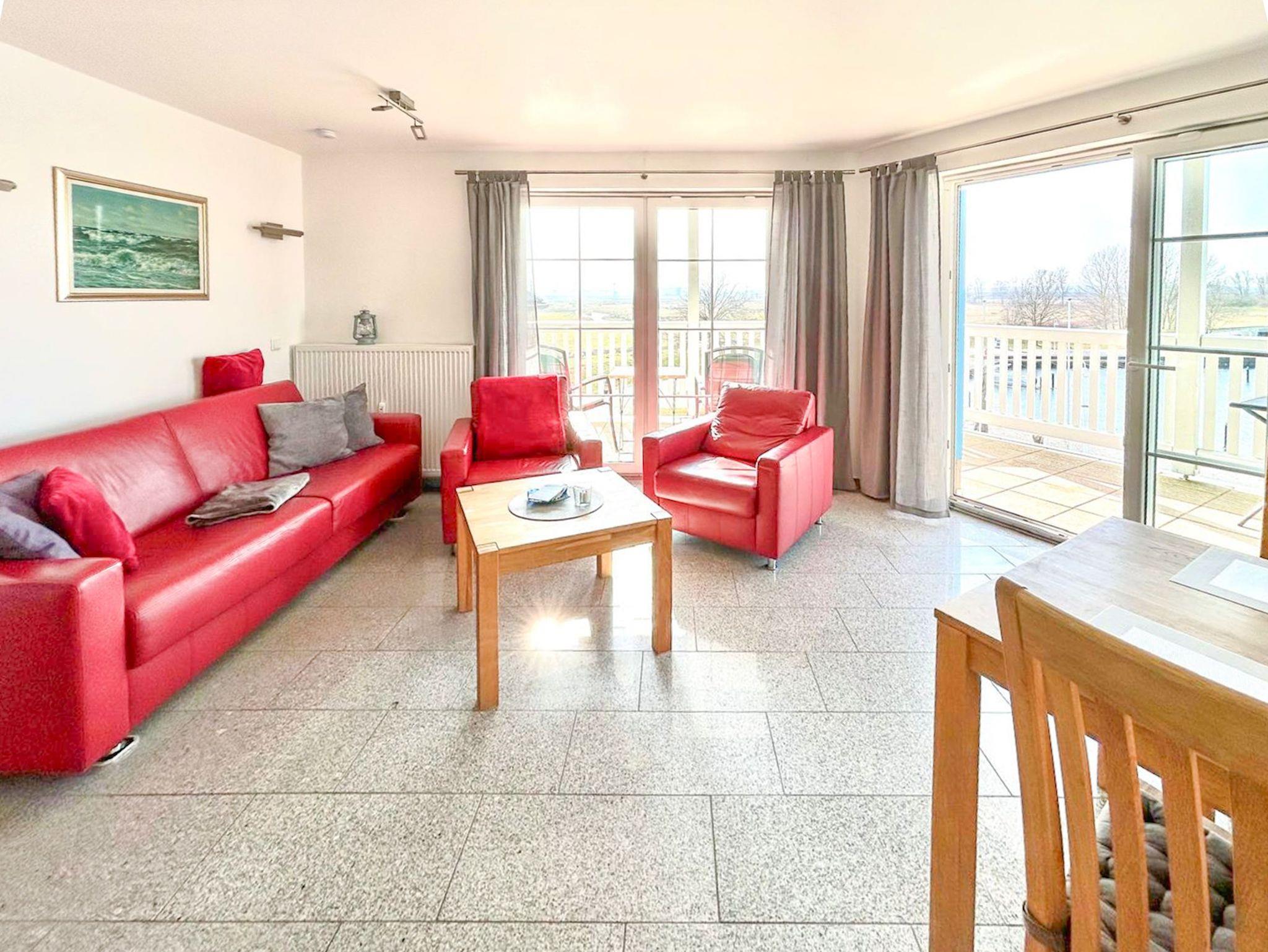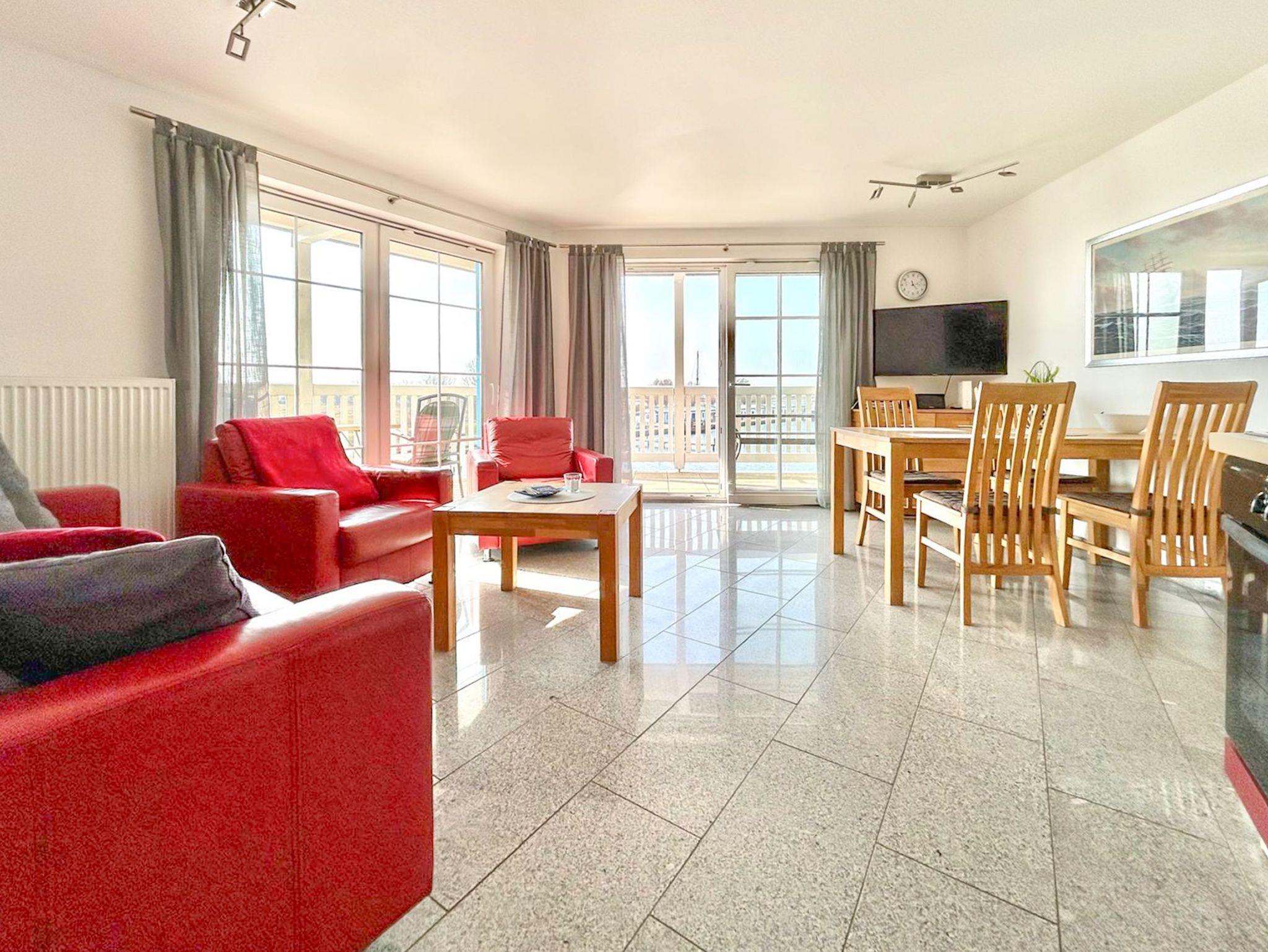 Diese Ferienwohnung verfügt über einen hellen Wohnbereich mit bodentiefen Fenstern zum Hafenbalkon, eine Couchgarnitur, einen Essbereich, Smart-TV, WLAN und eine gut ausgestattete Küchenzeile.