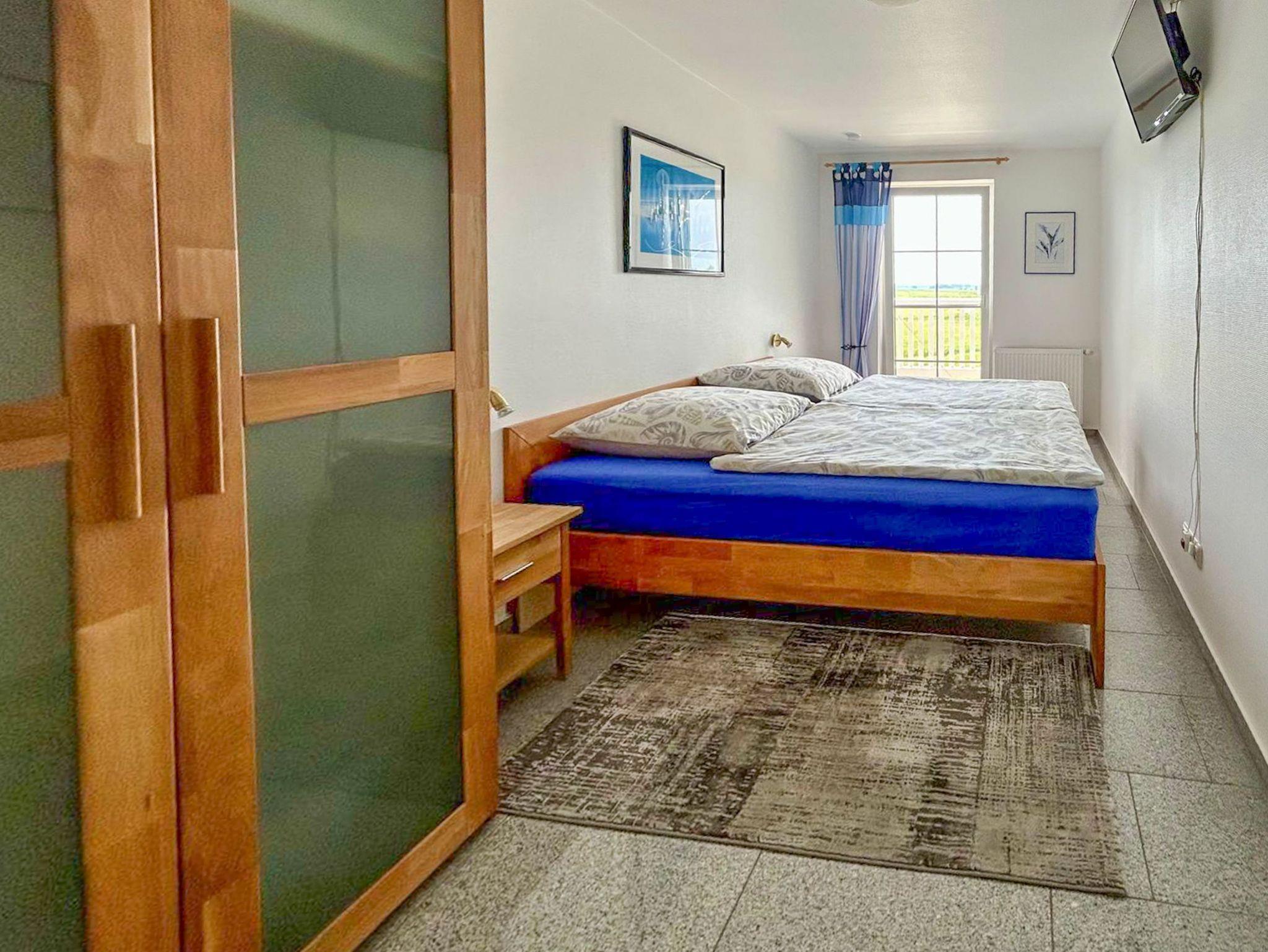Das große Schlafzimmer bietet ein 2 Meter breites Doppelbett (getrennte Matratzen), einen großen Kleiderschrank sowie einen direkten Zugang zum Süd-Balkon.
