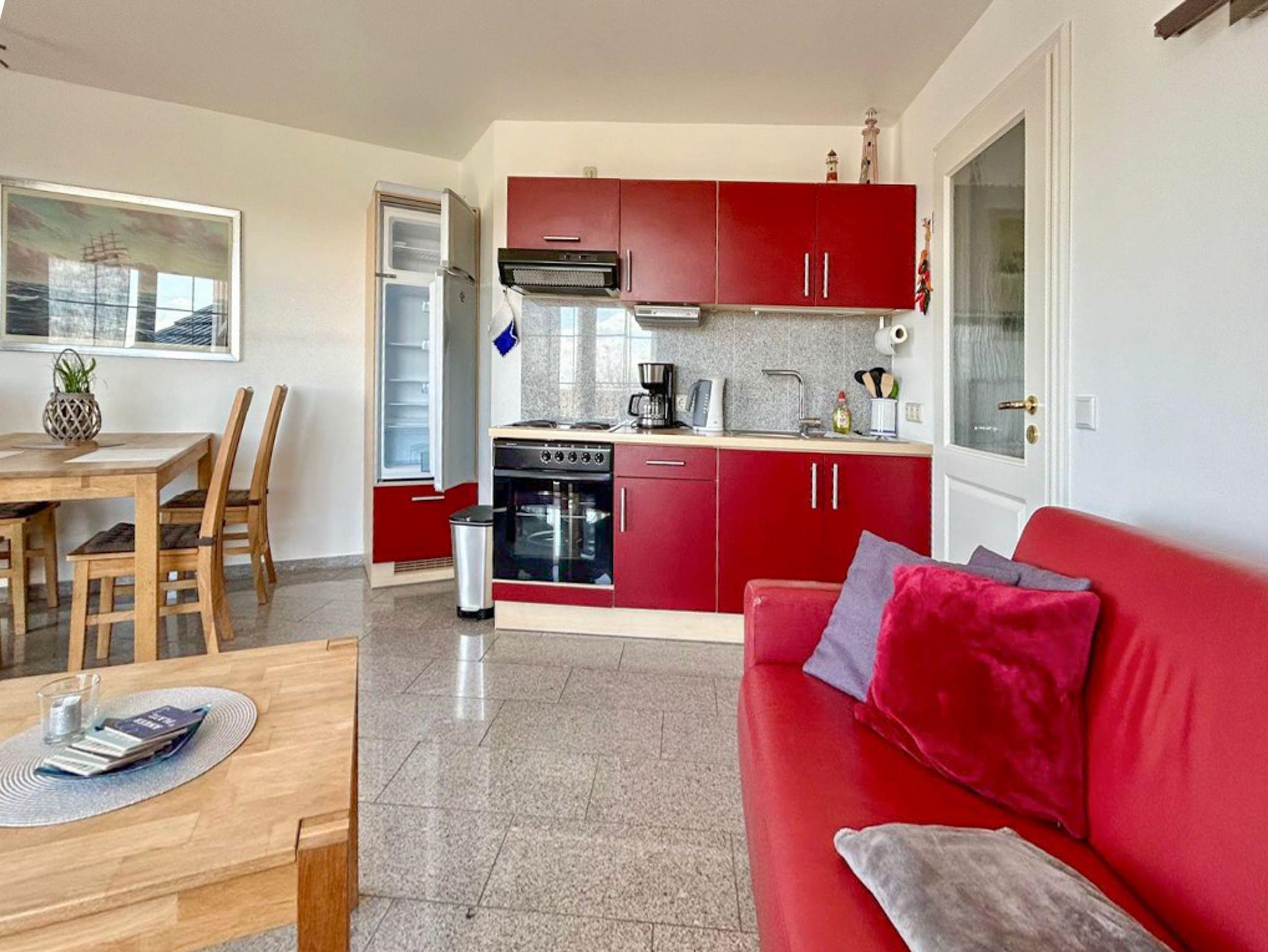 Gemütlich eingerichtete Ferienwohnung mit Blick auf den Yachthafen von Karlshagen, für bis zu 3 Personen. Sie verfügt über einen hellen Wohnbereich mit bodentiefen Fenstern zum Hafenbalkon, eine Couchgarnitur, einen Essbereich, Smart-TV, WLAN und eine gut ausgestattete Küchenzeile.