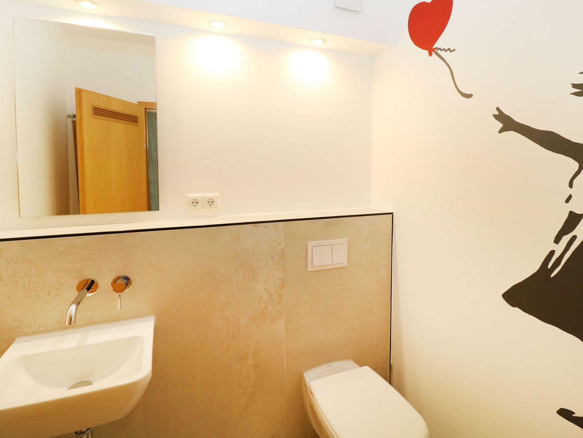 Das stilvolle Badezimmer verfügt über eine komfortable, ebenerdige Dusche; zusätzlich steht Ihnen ein separates Gäste-WC zur Verfügung.