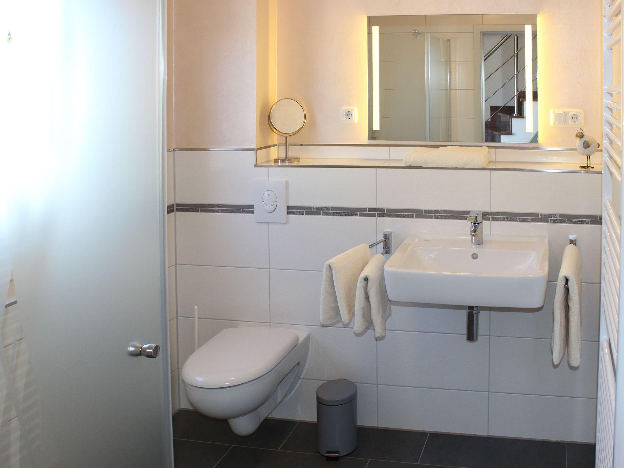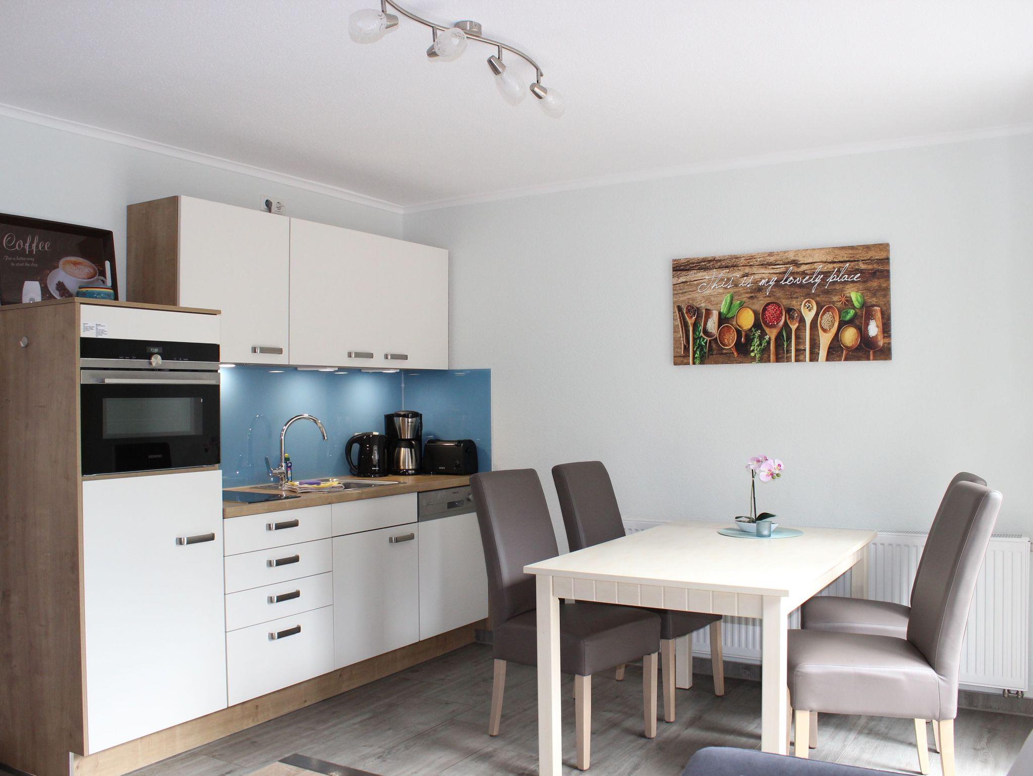 Die zweite Wohnung im Reihenhaus, Günter, eignet sich für bis zu 4 Gäste zzgl. 1 Kleinkind. Im Erdgeschoss der Maisonette finden Sie den Wohnbereich mit offener Küche und Zugang zur 15 m² großen Terrasse mit Grillmöglichkeit. Die Küchenzeile, gehalten in klassisch-elegantem Weiß mit holzfarbenen und blaugrauen Akzenten, verfügt über eine gut sortierte Ausstattung, sodass Ihre Lieblingsgerichte im Handumdrehen auf dem Tisch stehen. Vorhanden sind Kühlschrank mit Gefrierfach, Backofen, Mikrowelle, 2-Platten-Induktionsherd und Spülmaschine, sowie nützliche Kleingeräte wie Toaster, Kaffeemaschine und Wasserkocher. Für genügend Licht beim Gemüseschnippeln sorgt die Unterbaubeleuchtung an den Küchenschränken. Am Esstisch bieten hochwertige Polsterstühle besonderen Sitzkomfort beim Genießen Ihrer Mahlzeit, einem Duell in Stadt-Name-Land oder Planungsrunden für den nächsten Urlaubstag. Den Wohnbereich komplettiert eine modern-behagliche Sitzgruppe. Hier haben Sie Zugang zu Medien wie LED-Fernseher mit Sat-Empfang, Radio und WLAN. Die Couch ist ausziehbar und kann als Aufbettung für eine Person genutzt werden. Über die Tür im Wohnbereich lassen sich Günter und die benachbarte Fewo Anita verbinden und eignen sich so auch für einen Aufenthalt mit der Großfamilie. Ebenfalls im Erdgeschoss befindet sich das elegante Badezimmer mit Dusche, WC und Fußbodenheizung. Gegenüber vom Bad führt eine Treppe zu den beiden Schlafräumen im Obergeschoss. Im größeren befindet sich ein Doppelbett, während nebenan zwei Einzelbetten stehen. Die Betten beziehen wir für Sie, fühlen Sie sich bei Anreise einfach zuhause! In beiden Zimmern gibt es Kleiderschränke mit verschiedenen Abteilen, sodass Ihnen genügend Stauraum für die Unterbringung von Lieblingskleidern und persönlichen Gegenständen zur Verfügung steht. Fenster durchbrechen die Dachschrägen - so fungiert der Usedomer Sternenhimmel als natürliches Nachtlicht!