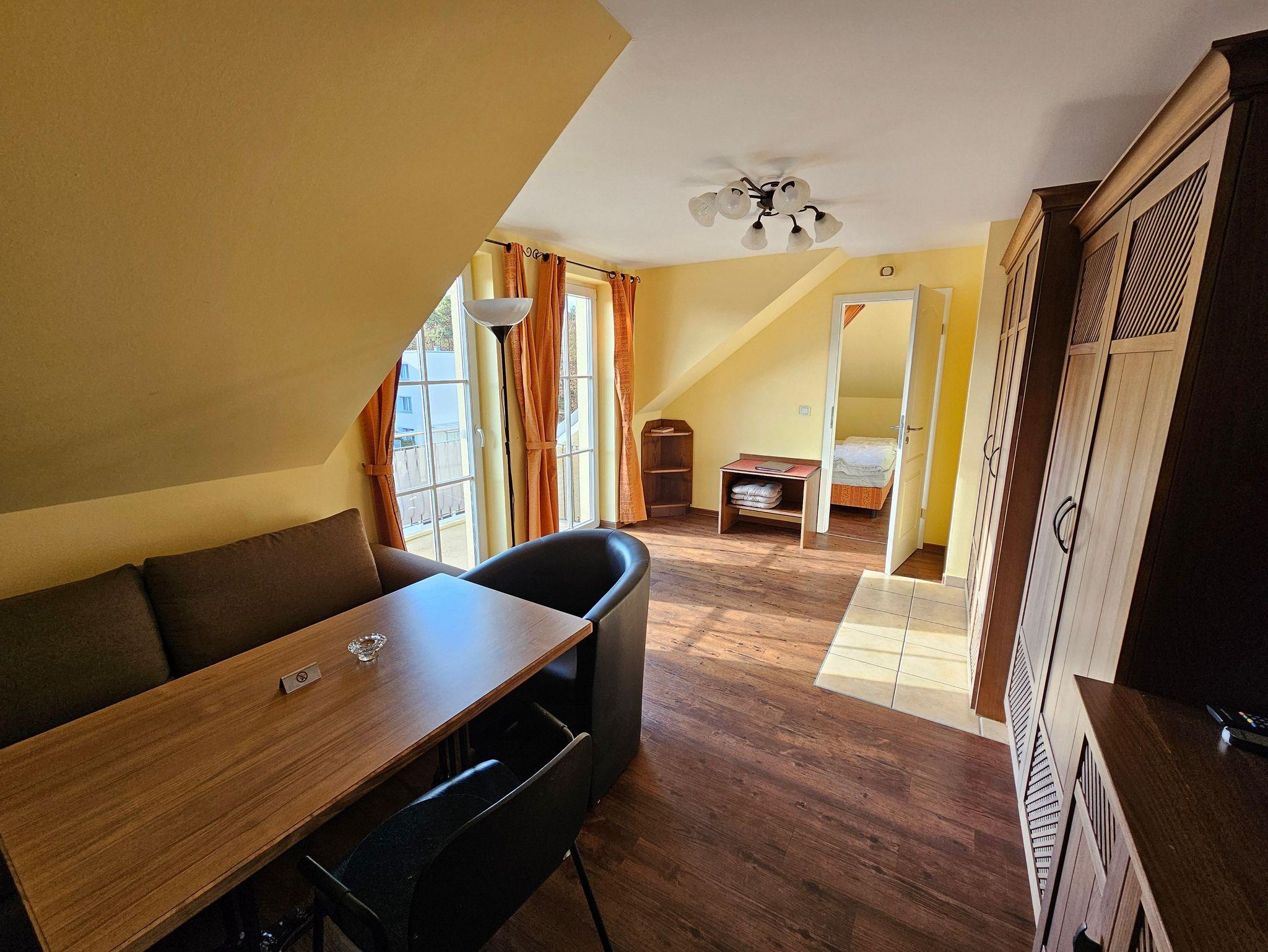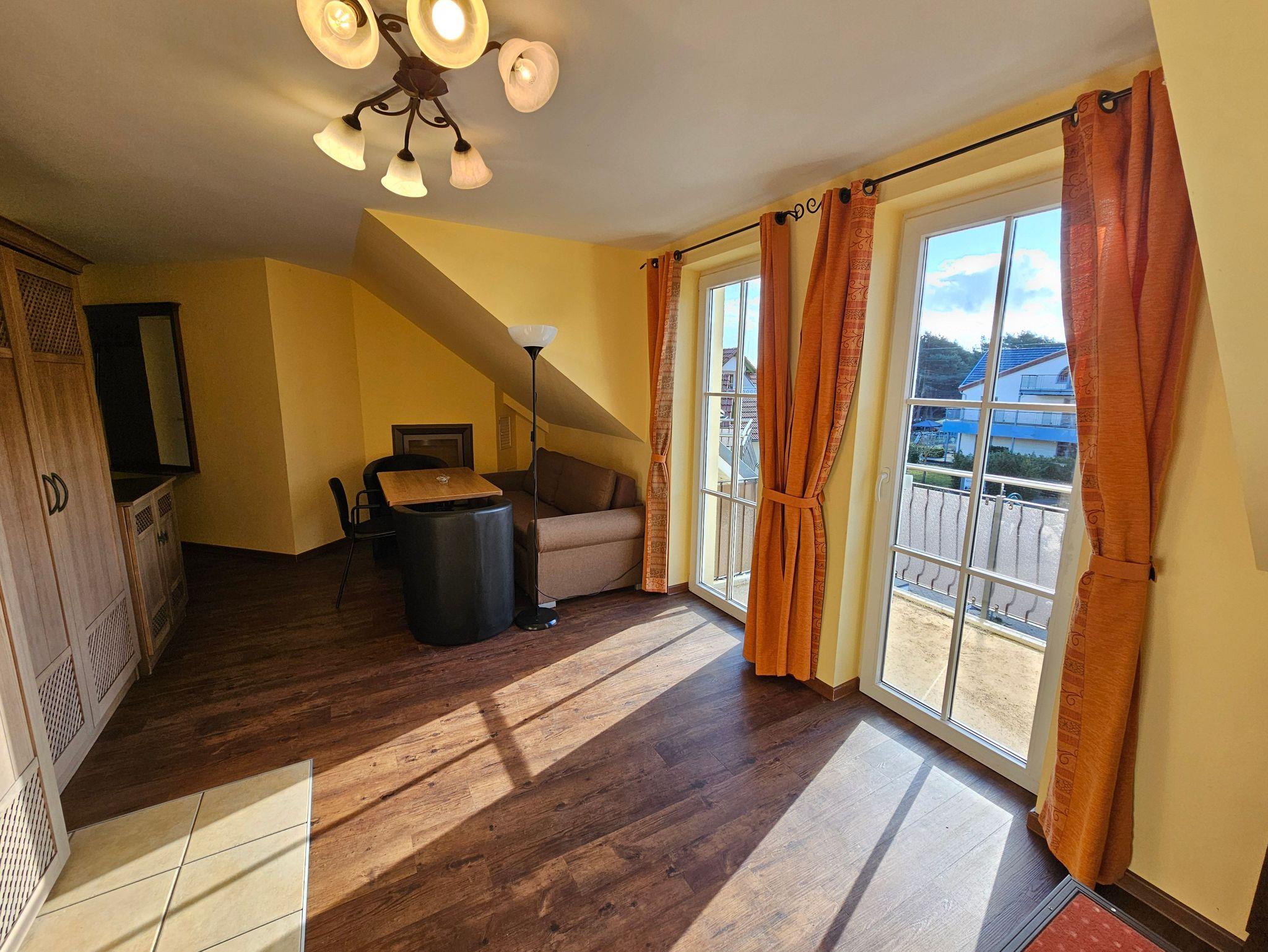 Das attraktive Ferienappartement im 2.OG besteht aus einem Schlaf- und einem Wohnraum mit Kamin und Balkon. Die Küche ist ausgestattet mit Geschirrspüler, Herd mit Ceranfeld, Mikrowelle mit Grill- und Backfunktion, Kühlschrank, Toaster und Kaffeemaschine. Im Wohnraum befindet sich ein Mediencenter mit SAT-TV, Radio und DVD-Spieler. Sie können die Mahlzeiten entweder im Restaurant im EG oder auf dem eigenen Balkon genießen. Neben dem Doppelbett im Schlafzimmer kann die Schlafcouch im Wohnzimmer zur Aufbettung genutzt werden. Der Boden ist mit Fußbodenheizung ausgestattet und mit Design-Vinyl Bodenbelag oder Fliesen belegt.